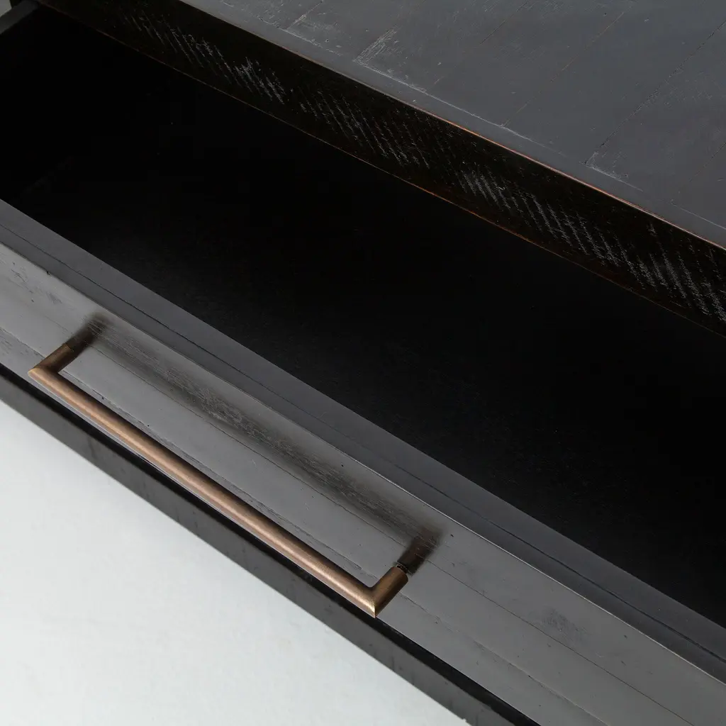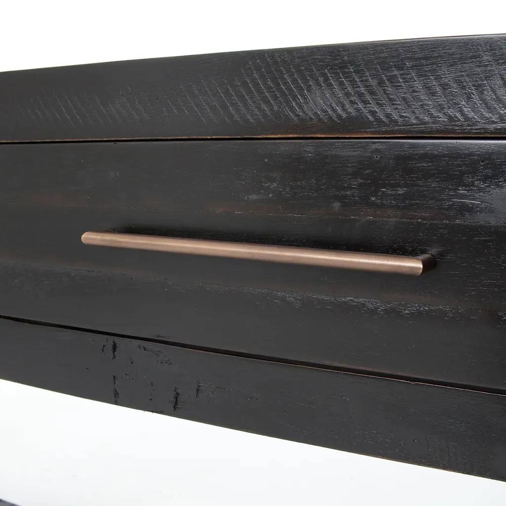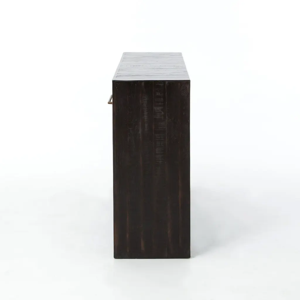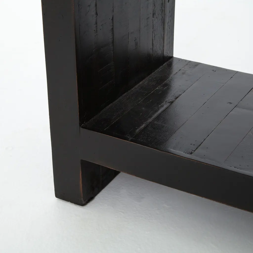 A modern update on a mid-century shape. Its smart design and glossy legs. Hand-rubbed finish with distressed details lend a vintage look. Shelf is the perfect perch for chic storage baskets.