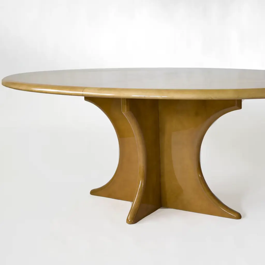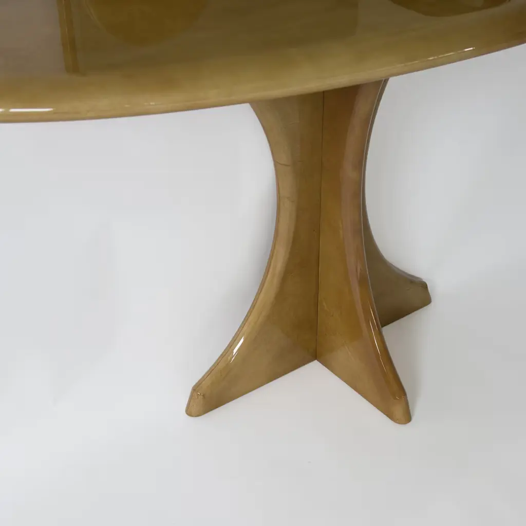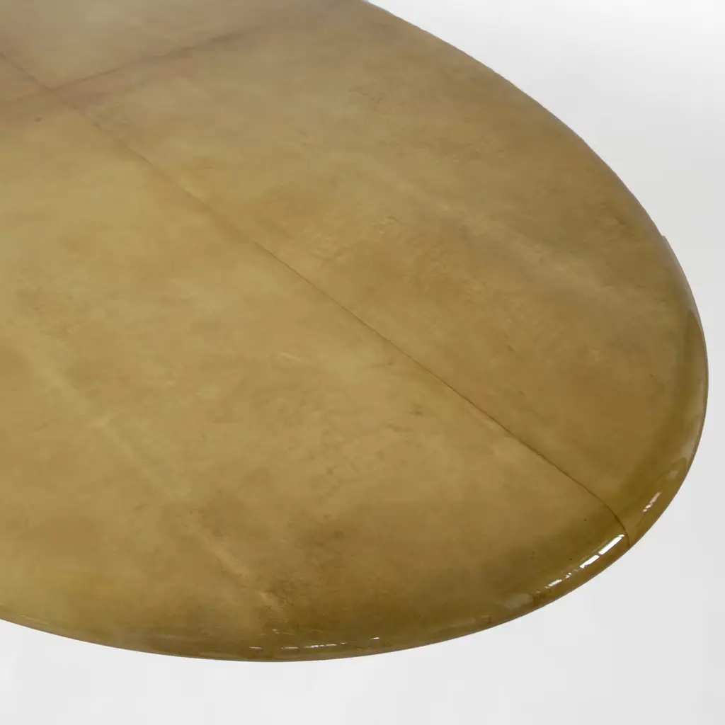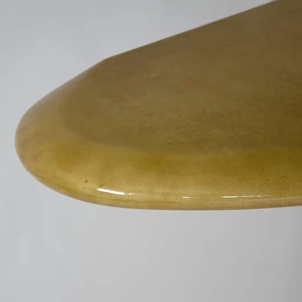 The stylish and sophisticated Almond Console Table by Oscar Torlasco has been covered with a high gloss almond colored parchment that provides a warm and elegant look to this classic accessory. An 80s/90s Tura original, it will beautifully compliment any classic or contemporary decor in your home, providing class and functionality.