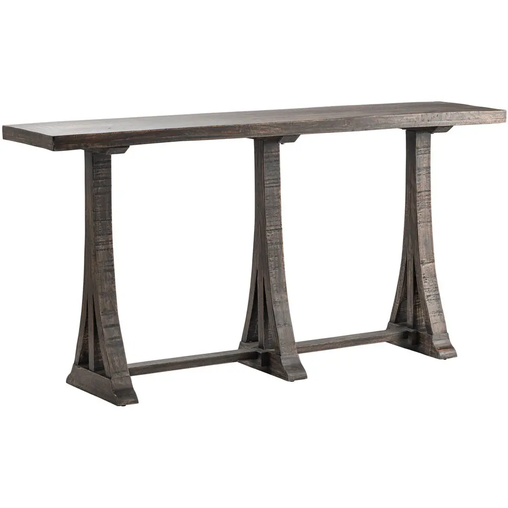 The W/C Wood Console Table is 38 inches tall and features Dark Brown Coloring. The Piece embodies a Transitional Theme.