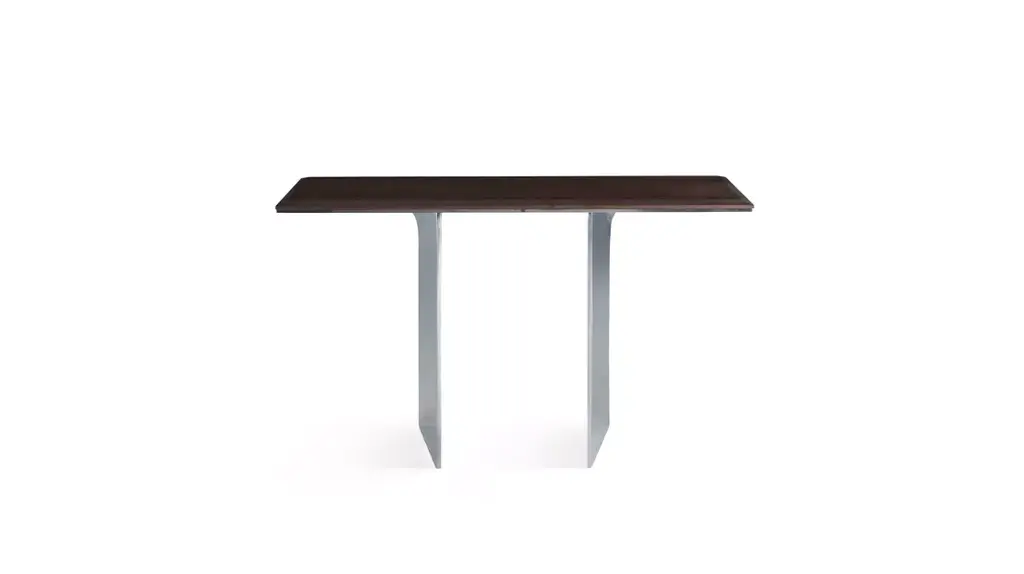 The cast aluminium bases of these cocktail tables were inspired by the idea of the bow of a ship. The trays in stained birch veneer with glossy varnish have a more refined look that contrasts well with the raw look of the bases.