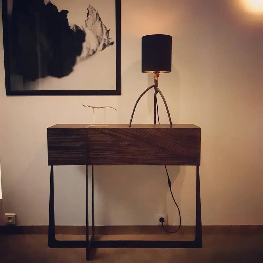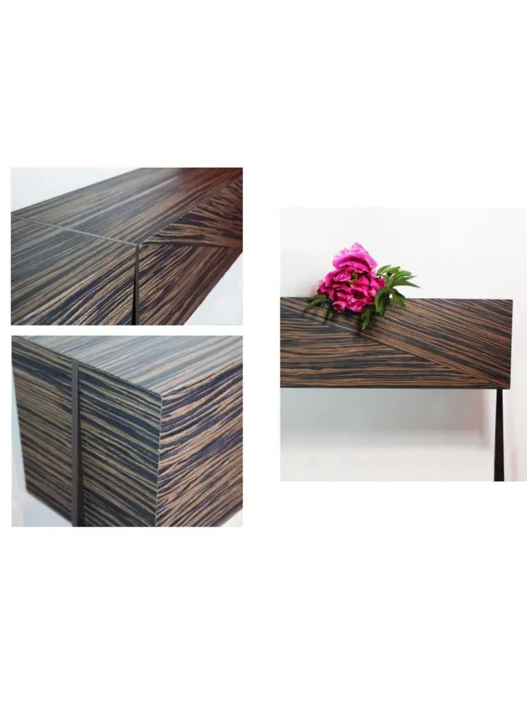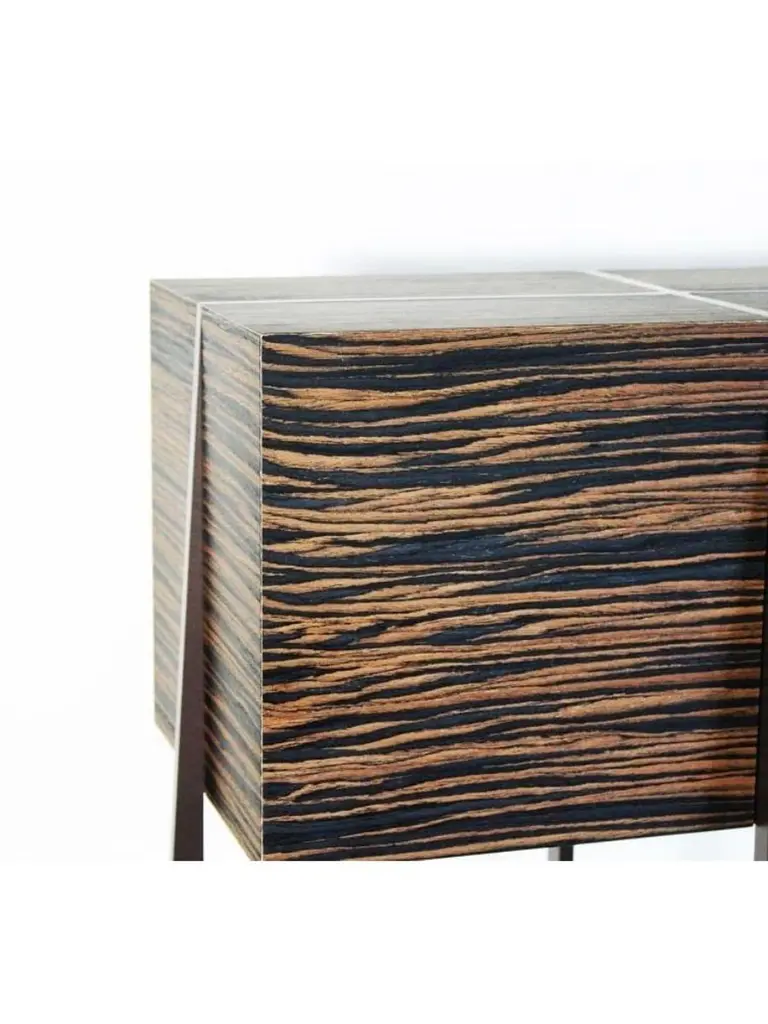Amazone console by Plumbum Dimensions: L 100/110 x D 25 x H 87 cm Materials: Steel and ebena wood reconstituted veneer. Influenced by French Decorative Arts, Amazone is a small console that combines strength and femininity.The very light curves of the base are inspired by the softness and fragility of the female body while the monolithic beam gives an image of reassuring strength to the whole.The chosen veneer, which seems to come from distant forests at the end of the world, gives the whole a precious and rare side without revealing the mystery of its origin. Amazon lives up to its name. At a time when we are forced to slow down, crafts appear as a way forward, where we create less but better. This trend is cultivated by Plumbum with an emphasis on pieces with a high density of soul, poetic, high-quality craftsmanship, and noble materials. By inspiring and using the wealth of heritage and local craftsmanship, Plumbum designs original pieces in innovative materials, from furniture to objects, in collaboration with contemporary designers.Art of living and art of doing together to offer customizable numbered signed collections and bespoke pieces between territorial heritage and delicacy of styles.Our carpentry & granite terrazzo workshops based near Toulouse are complemented by a solid network of South of France craftsmen with multiple skills to meet your needs while maintaining a single contact (upholstery, EPVart foundry, locksmithing, ...).