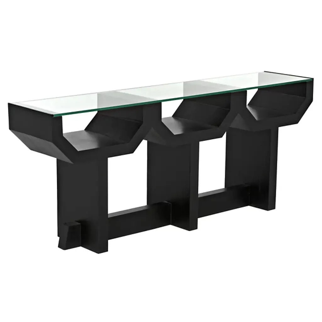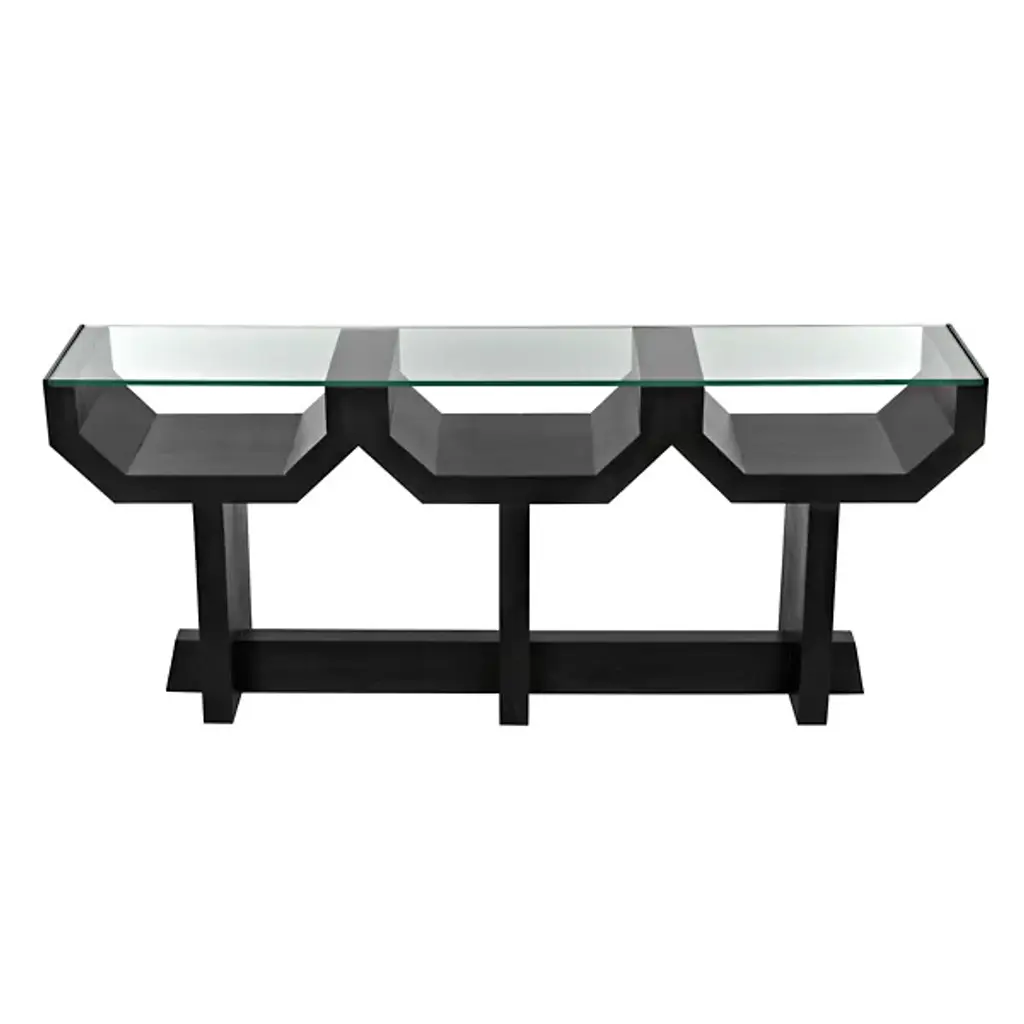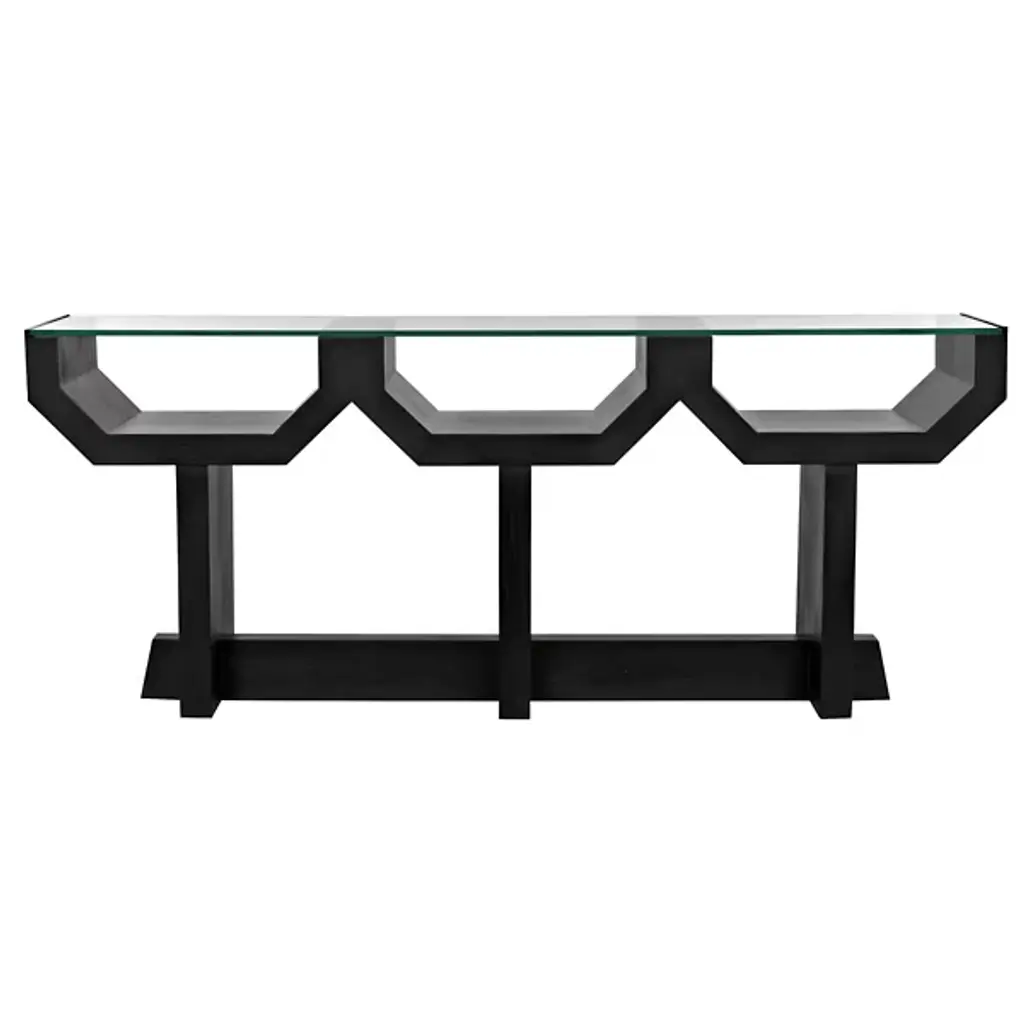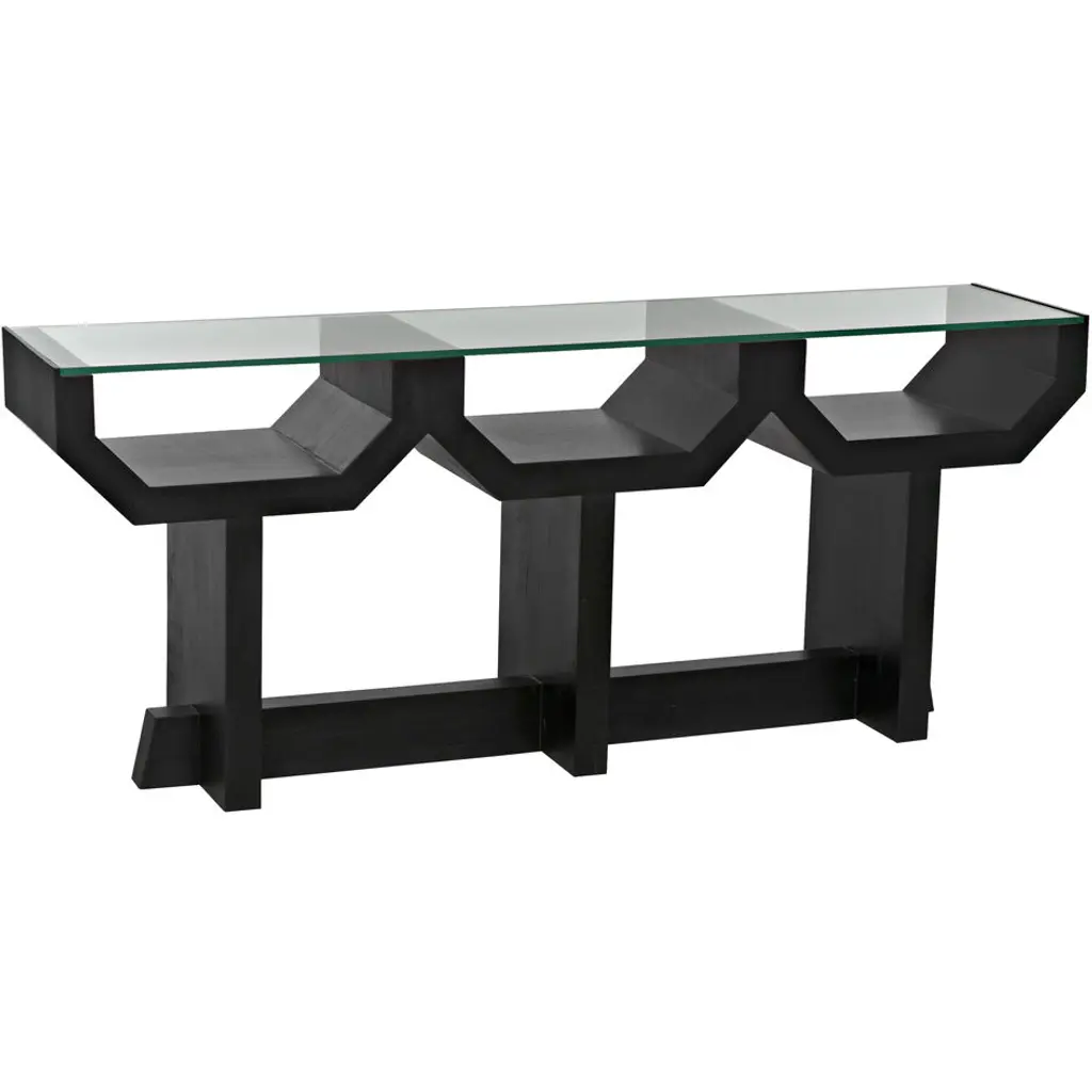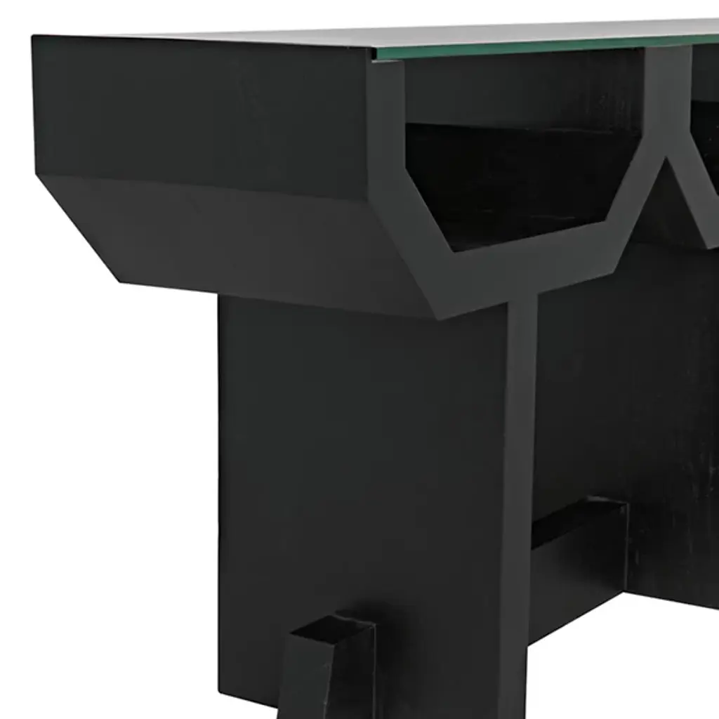 The Ando Console Table from Noir achieves modern minimalism through bold geometric forms that create dramatic negative space beneath a pristine glass surface. Angular mahogany supports feature precise cutouts that form architectural openings, while the hand-rubbed black finish intensifies each wooden plane. The substantial base structure contrasts with the delicate glass top, generating visual balance between weight and lightness. Clean lines and precise joinery showcase the maker's commitment to structural clarity, resulting in a console that demonstrates contemporary craftsmanship through geometric sophistication.