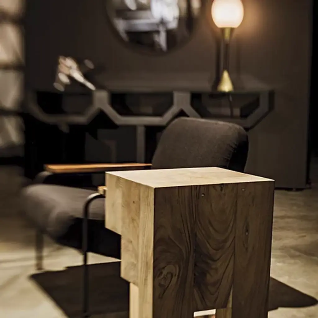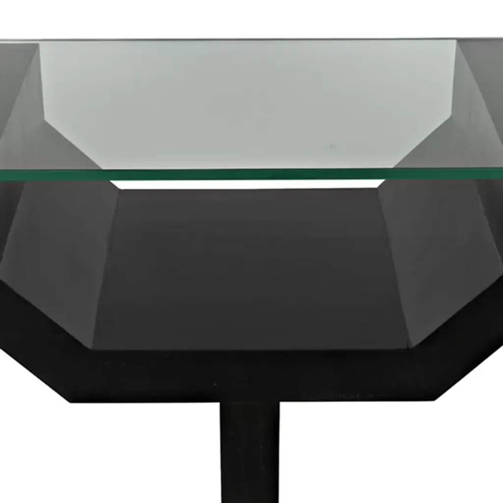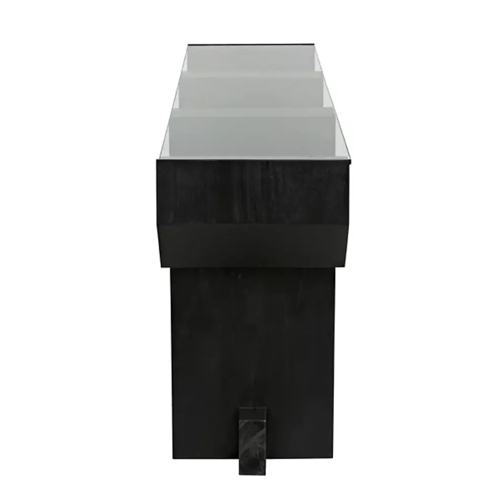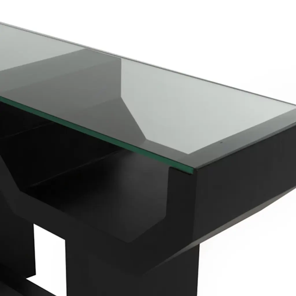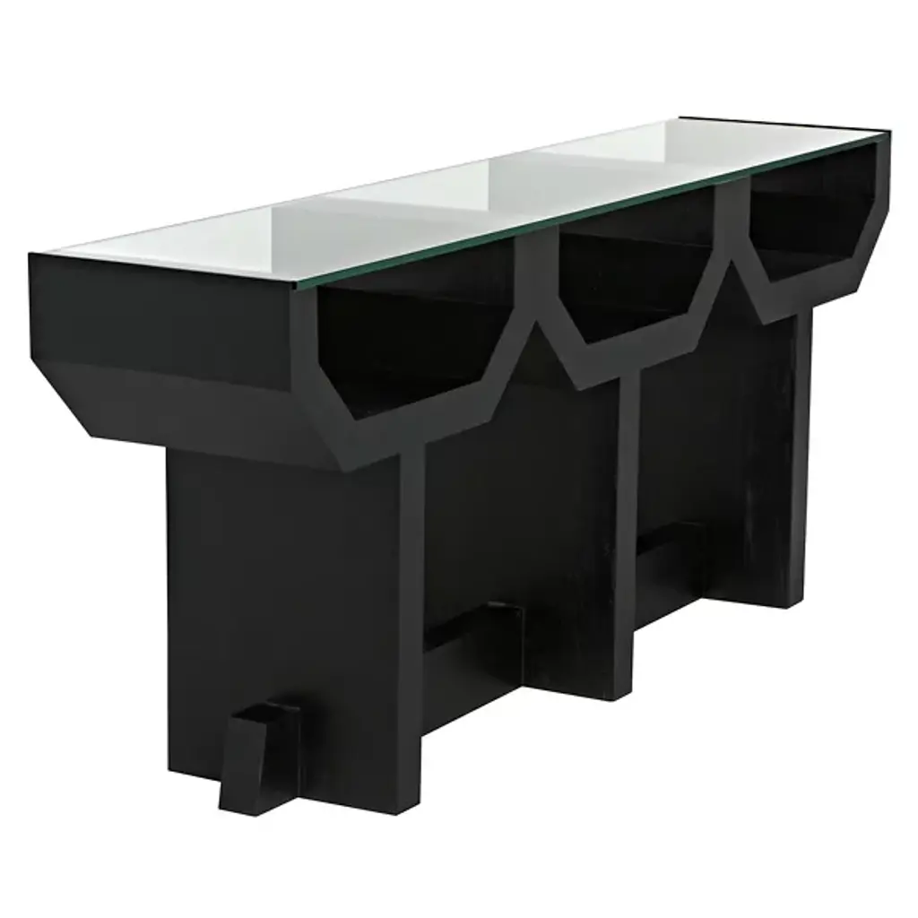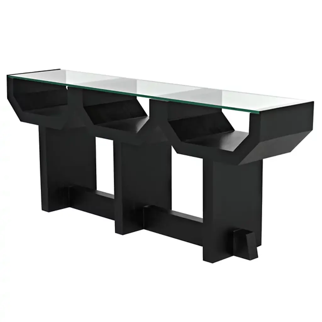 The Ando Console Table from Noir achieves modern minimalism through bold geometric forms that create dramatic negative space beneath a pristine glass surface. Angular mahogany supports feature precise cutouts that form architectural openings, while the hand-rubbed black finish intensifies each wooden plane. The substantial base structure contrasts with the delicate glass top, generating visual balance between weight and lightness. Clean lines and precise joinery showcase the maker's commitment to structural clarity, resulting in a console that demonstrates contemporary craftsmanship through geometric sophistication.
