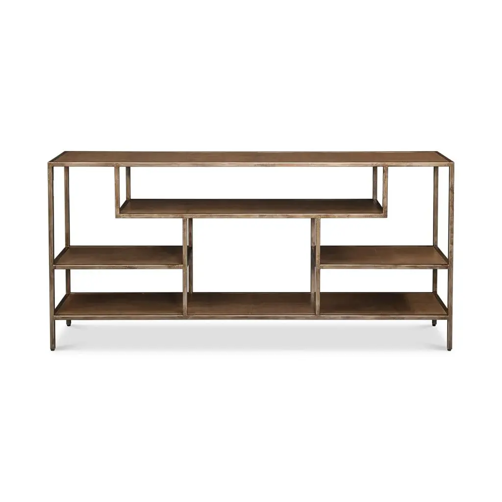 Console Table with Brown Leather combines modern sophistication with timeless luxury. Its sleek, antique bronzed metal frame features a minimalist, open design that creates a sense of lightness and elegance. The tawny brown shagreen embossed leather-wrapped shelves add refined texture and a rich, warm tone, offering a beautiful contrast to the metallic frame. Ideal for displaying decor, books, or collectibles, this versatile console table fits seamlessly into living rooms, hallways, or office spaces. Its geometric open design enhances visual appeal while providing functional storage. Dimensions: 71" W x 14" D x 33" H