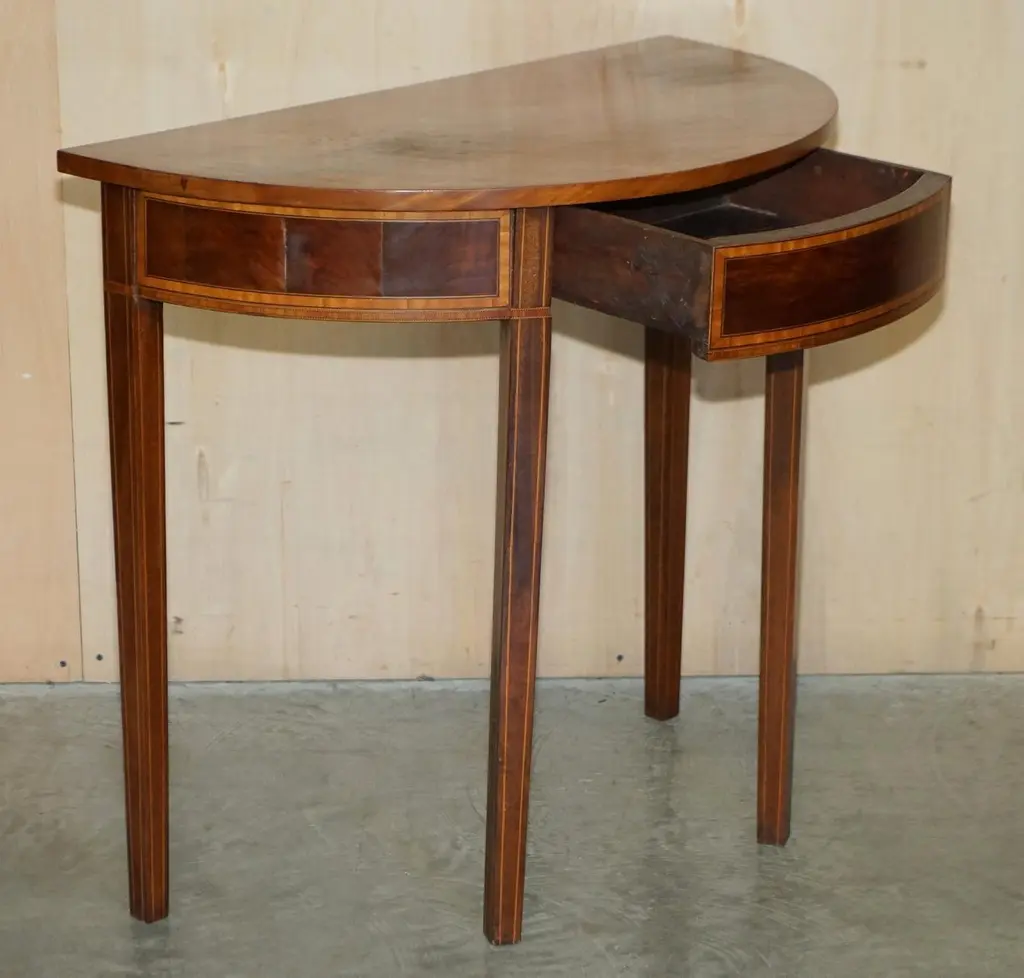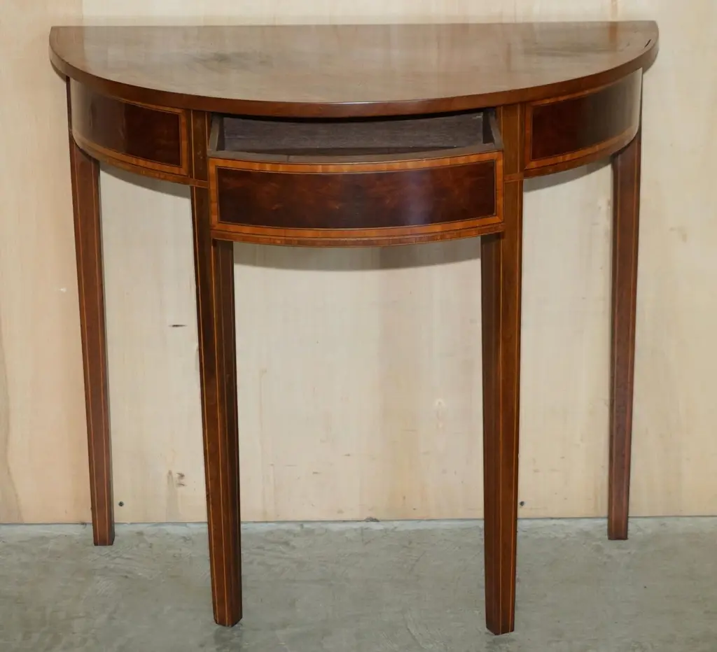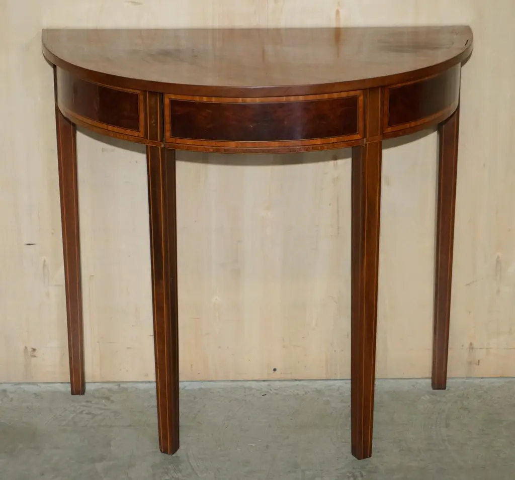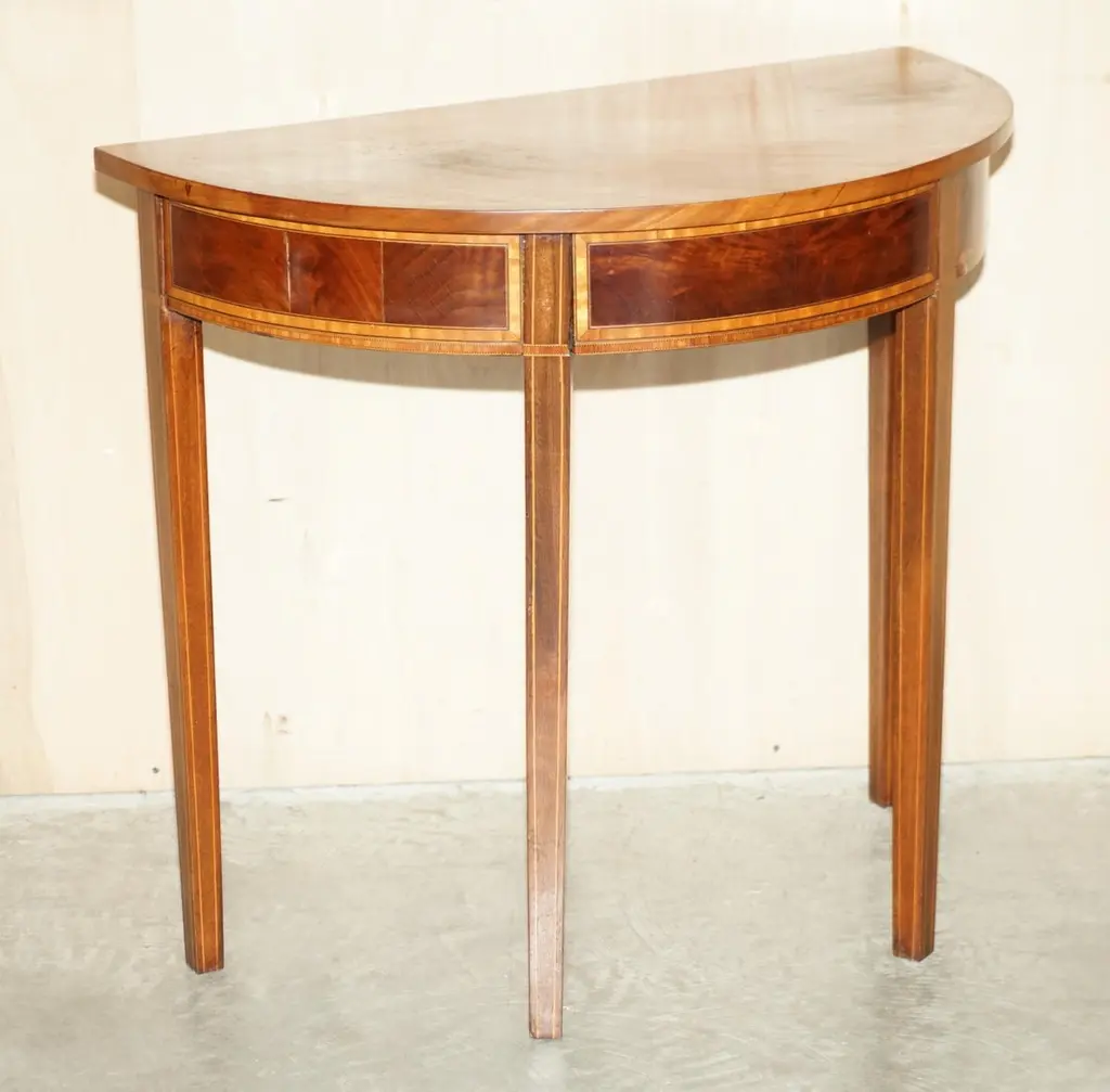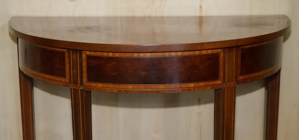 Royal House AntiquesRoyal House Antiques is delighted to offer for sale this stunning Victorian flamed Mahogany & Walnut single drawer demi lune console tablePlease note the delivery fee listed is just a guide, it covers within the M25 only for the UK and local Europe only for international, if you would like an accurate quote please send me your postcode and I’ll provide you with the exact priceA good looking well made and decorative table, it has a nice vintage patina to it and works well in any settingWe have cleaned waxed and polished it from top to bottom, there may be age and use related patina marks here and thereDimensionsHeight:- 75cmWidth:- 83.5cmDepth:- 45cmPlease note all measurements are taken at the widest point, if you would like any additional or specific measurements please askAny questions please feel free to ask before you bid This item is available for collection from our Pulborough warehouses RH20 1DF. We can have it delivered nationwide to include Scotland Wales and Ireland. Please contact me via email or my contact information is under the business seller section of the listing with your postcode for a delivery quotation. Please be sure to include which item you would like to buy as the price is determined on size and distance, if you would like more than one piece of furniture we offer a substantial discount on the second and third item, for international shipping please view the below information. ABOUT US Royal House Antiques is a privately owned family ran business founded in Wimbledon SW19 and now based in Pulborough RH20. We specialise in finding, restoring very fine luxury antique leather seating, along with every single other type of antique ranging from the 16th century to the 20th century. We also stock a number of designer brands such as Fritz Hansen, Ralph Lauren, Cavalli, Charles & Ray Eames, Vitra, David Linley, Rolex, Tiffany, Jager Le Coulter and so on.CONDITIONPlease view the very detailed pictures as they form part of the description pertaining to the condition. Please also ask any questions before you bid and not after, all of our items are sold as seen and as listed.Royal House Antiques cannot be held liable for any independent assumptions made regarding the items we sell, if you are unsure on any point, please feel free to ask for clarity. Please note vintage period and original items such as leather seating will always have natural patina in the form of creasing and wear, we recommend annual waxing to ensure no moisture is lost, also hand dyed leather is not recommended to sit in direct sunlight for prolonged periods of time as it will dry out and fade. COURIER, LARGE ITEMS ONLY THAT CAN’T BE POSTEDWe can arrange delivery nationwide, mostly with our nominated couriers, for Europe we use one reasonably priced professional company that we trust, for the rest of the world we use international shippers that can send any size item crated via air freight within 7-14 days after crating or soft packed and container shipped via sea freight within 30-60 days. The time frames outlined are guides only, non-domestic shipping is almost entirely governed by the airlines, sea freight loading times and custom clearances.Whomever delivers will always require help on the larger items to unload, the price you will be quoted will always be based on this assumption, if this is not possible, please let us know as it will affect the price to send a two-person team.Delivery is to the ground floor only, again if you need help upstairs or in flats etc that's absolutely not a problem, the couriers charge £10-£20 per flight per man per item, if you have a working elevator then naturally there’s no additional fee.All courier fees are paid by yourself directly to the courier company, the contract for delivery is between yourselves the client and whichever courier you chose from those available I’m happy to accommodate your own courier after a cleared payment has been received, they need to book in a collection time with at least 24 hours notice, all collections must be made within 14 working days of the close of the sale unless agreed by prior arrangement.IMPORT DUTYMost countries charge some kind of import duty however almost all of our items won’t incur any charges as the items are exempt from tax due to the age and materials used.For European deliveries the price you will be quoted will include all clearance documentation and any customs charges so there won’t be any additional fees.For international deliveries such as the United States there can be some import duty to pay and or a clearance fee, I would estimate that 99% of all deliveries clear customs without being stopped for either.All duties are the responsibility of the purchaser who is the importer, they can’t be covered by the seller or shipping agent or factored in with additional retrospective discounts.