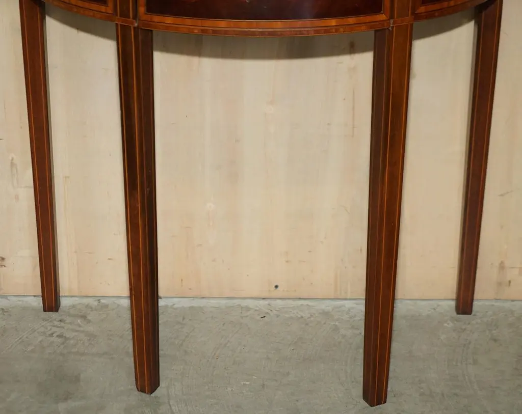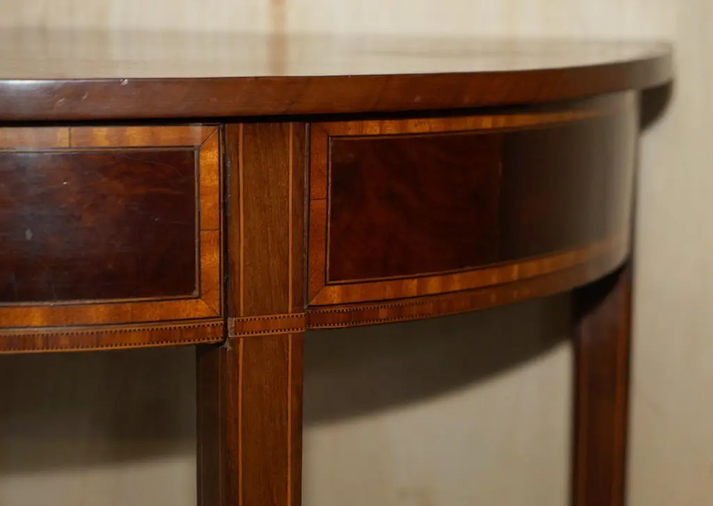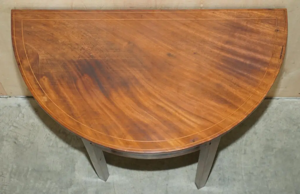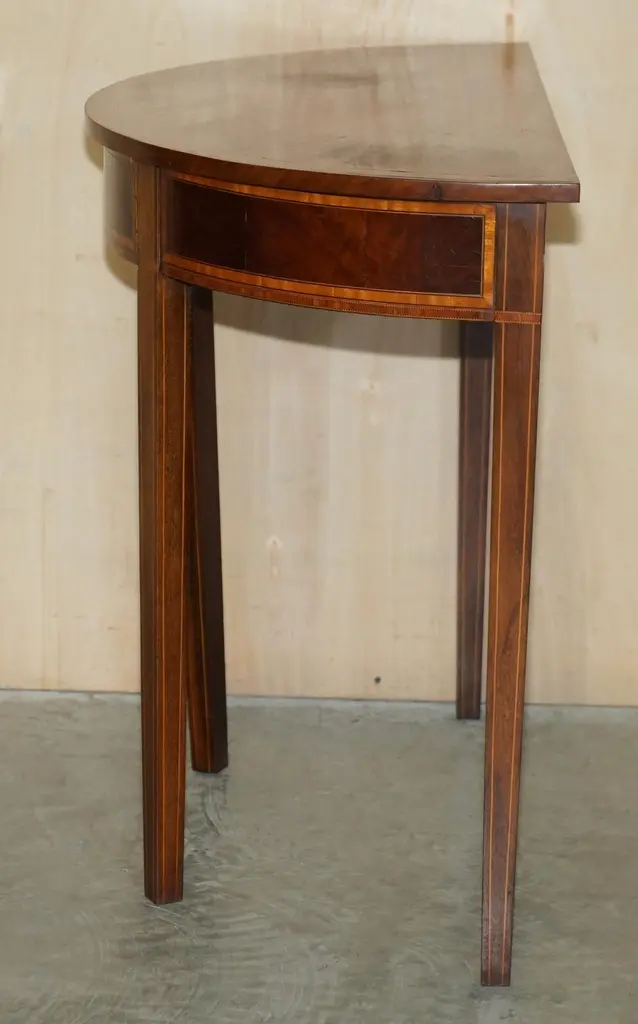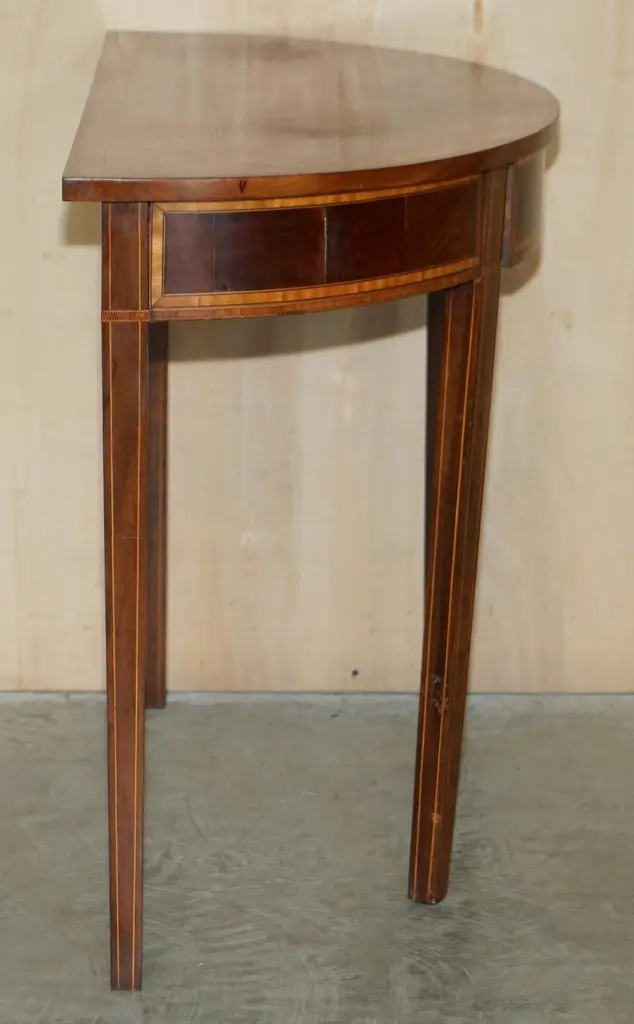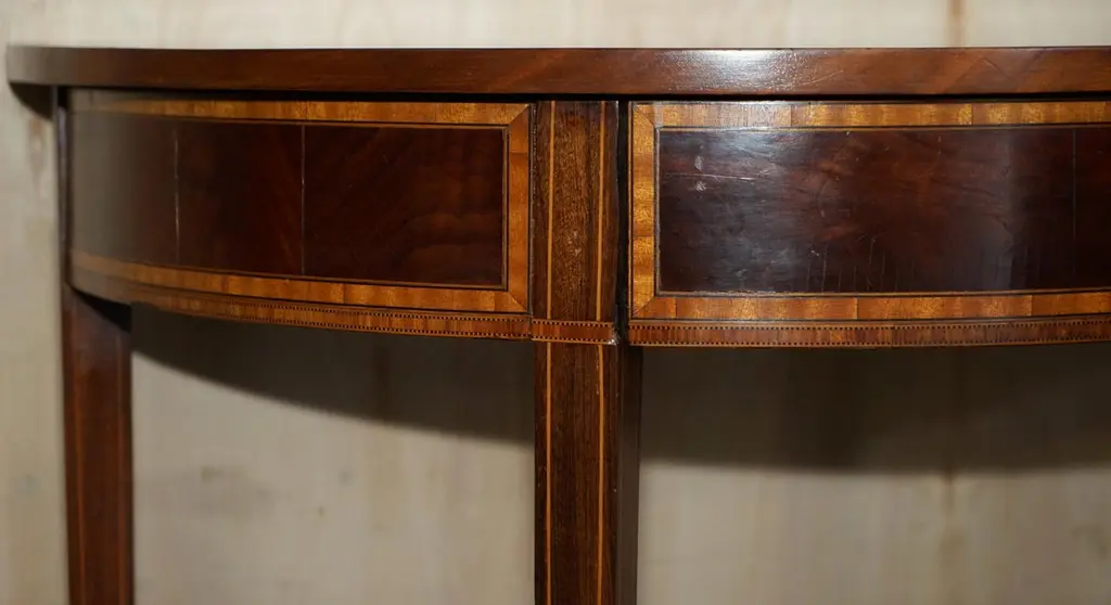 Royal House AntiquesRoyal House Antiques is delighted to offer for sale this stunning Victorian flamed Mahogany & Walnut single drawer demi lune console tablePlease note the delivery fee listed is just a guide, it covers within the M25 only for the UK and local Europe only for international, if you would like an accurate quote please send me your postcode and I’ll provide you with the exact priceA good looking well made and decorative table, it has a nice vintage patina to it and works well in any settingWe have cleaned waxed and polished it from top to bottom, there may be age and use related patina marks here and thereDimensionsHeight:- 75cmWidth:- 83.5cmDepth:- 45cmPlease note all measurements are taken at the widest point, if you would like any additional or specific measurements please askAny questions please feel free to ask before you bid This item is available for collection from our Pulborough warehouses RH20 1DF. We can have it delivered nationwide to include Scotland Wales and Ireland. Please contact me via email or my contact information is under the business seller section of the listing with your postcode for a delivery quotation. Please be sure to include which item you would like to buy as the price is determined on size and distance, if you would like more than one piece of furniture we offer a substantial discount on the second and third item, for international shipping please view the below information. ABOUT US Royal House Antiques is a privately owned family ran business founded in Wimbledon SW19 and now based in Pulborough RH20. We specialise in finding, restoring very fine luxury antique leather seating, along with every single other type of antique ranging from the 16th century to the 20th century. We also stock a number of designer brands such as Fritz Hansen, Ralph Lauren, Cavalli, Charles & Ray Eames, Vitra, David Linley, Rolex, Tiffany, Jager Le Coulter and so on.CONDITIONPlease view the very detailed pictures as they form part of the description pertaining to the condition. Please also ask any questions before you bid and not after, all of our items are sold as seen and as listed.Royal House Antiques cannot be held liable for any independent assumptions made regarding the items we sell, if you are unsure on any point, please feel free to ask for clarity. Please note vintage period and original items such as leather seating will always have natural patina in the form of creasing and wear, we recommend annual waxing to ensure no moisture is lost, also hand dyed leather is not recommended to sit in direct sunlight for prolonged periods of time as it will dry out and fade. COURIER, LARGE ITEMS ONLY THAT CAN’T BE POSTEDWe can arrange delivery nationwide, mostly with our nominated couriers, for Europe we use one reasonably priced professional company that we trust, for the rest of the world we use international shippers that can send any size item crated via air freight within 7-14 days after crating or soft packed and container shipped via sea freight within 30-60 days. The time frames outlined are guides only, non-domestic shipping is almost entirely governed by the airlines, sea freight loading times and custom clearances.Whomever delivers will always require help on the larger items to unload, the price you will be quoted will always be based on this assumption, if this is not possible, please let us know as it will affect the price to send a two-person team.Delivery is to the ground floor only, again if you need help upstairs or in flats etc that's absolutely not a problem, the couriers charge £10-£20 per flight per man per item, if you have a working elevator then naturally there’s no additional fee.All courier fees are paid by yourself directly to the courier company, the contract for delivery is between yourselves the client and whichever courier you chose from those available I’m happy to accommodate your own courier after a cleared payment has been received, they need to book in a collection time with at least 24 hours notice, all collections must be made within 14 working days of the close of the sale unless agreed by prior arrangement.IMPORT DUTYMost countries charge some kind of import duty however almost all of our items won’t incur any charges as the items are exempt from tax due to the age and materials used.For European deliveries the price you will be quoted will include all clearance documentation and any customs charges so there won’t be any additional fees.For international deliveries such as the United States there can be some import duty to pay and or a clearance fee, I would estimate that 99% of all deliveries clear customs without being stopped for either.All duties are the responsibility of the purchaser who is the importer, they can’t be covered by the seller or shipping agent or factored in with additional retrospective discounts.