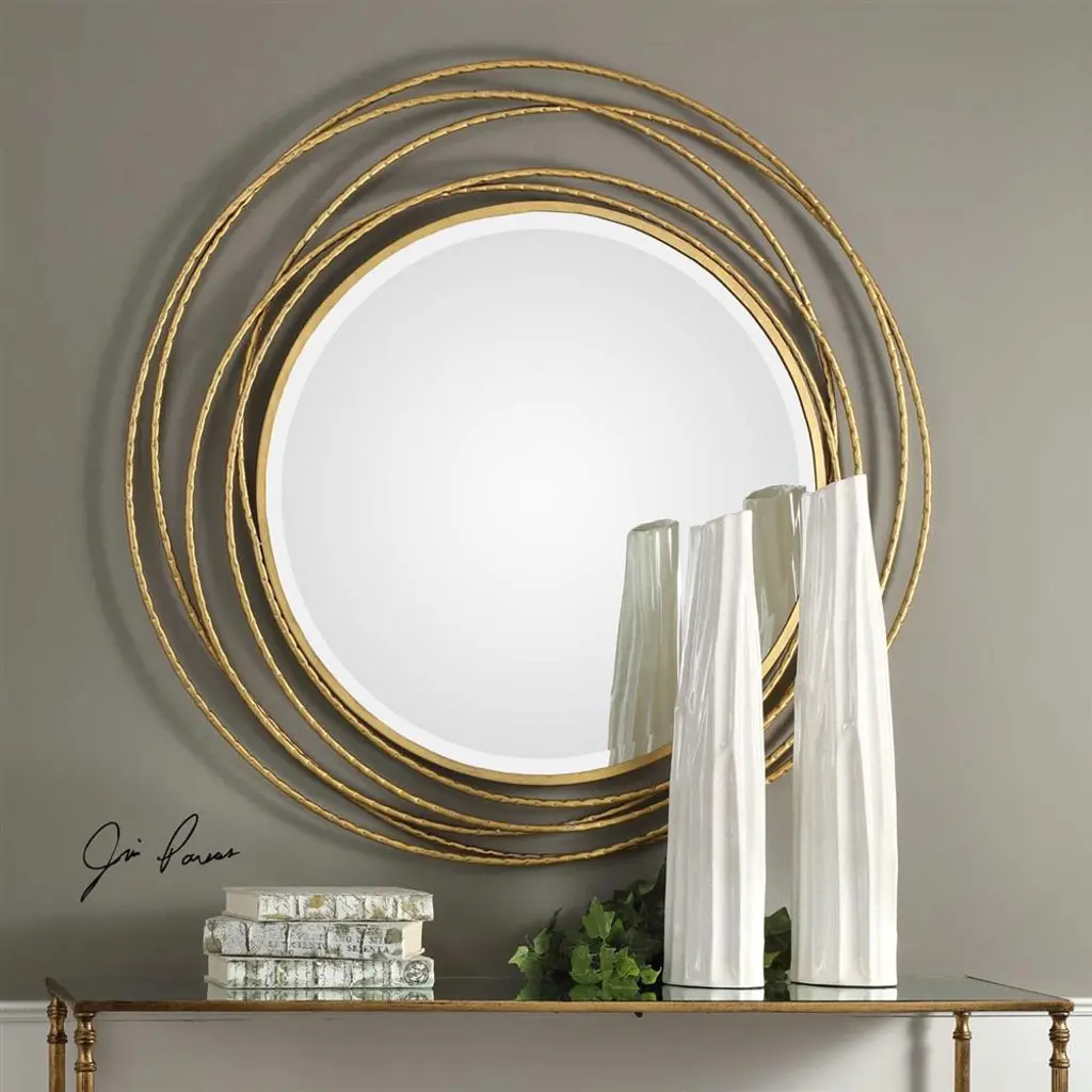 Arabella Hollywood Regency Gold Leaf Iron Coil Round Beveled Wall Mirror