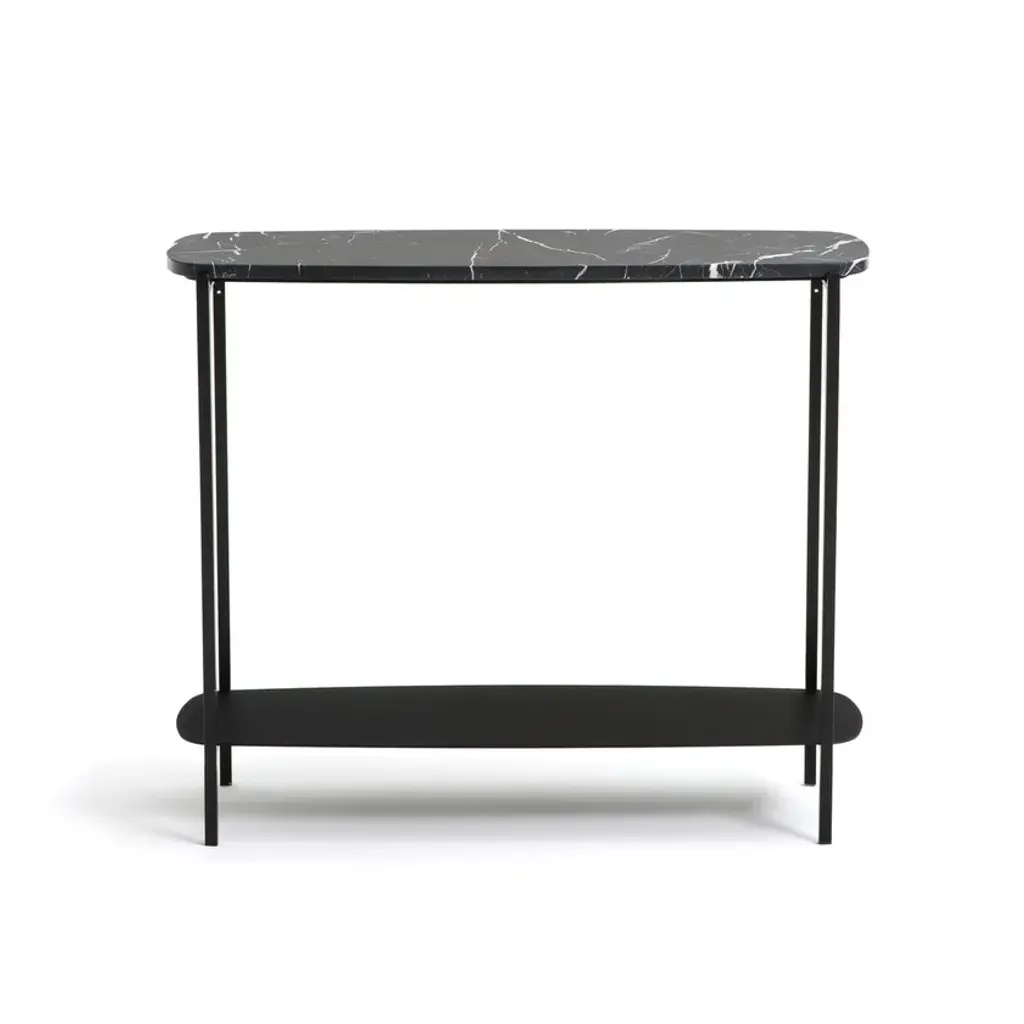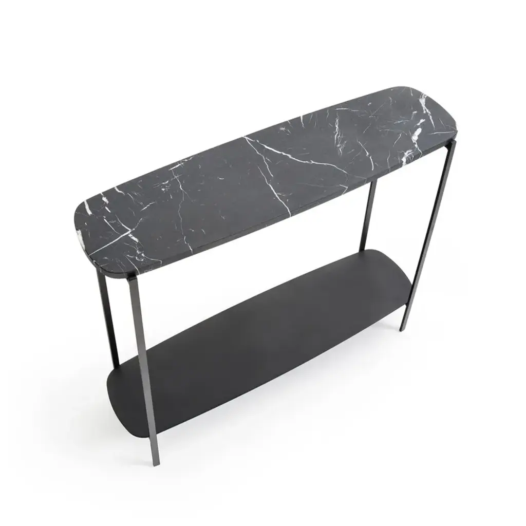 Arambole console table. A successful combination of an organically shaped top in matt black marble on an H-shaped metal frame. Ideal at the entrance, behind the sofa in the living room, in the bedroom, etc.18 mm thick matt black marble top. Each piece is unique, the striations are more or less marked.Black metal frame and lower top with epoxy finish
