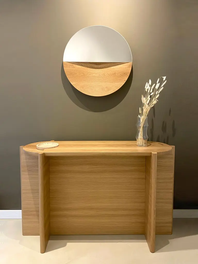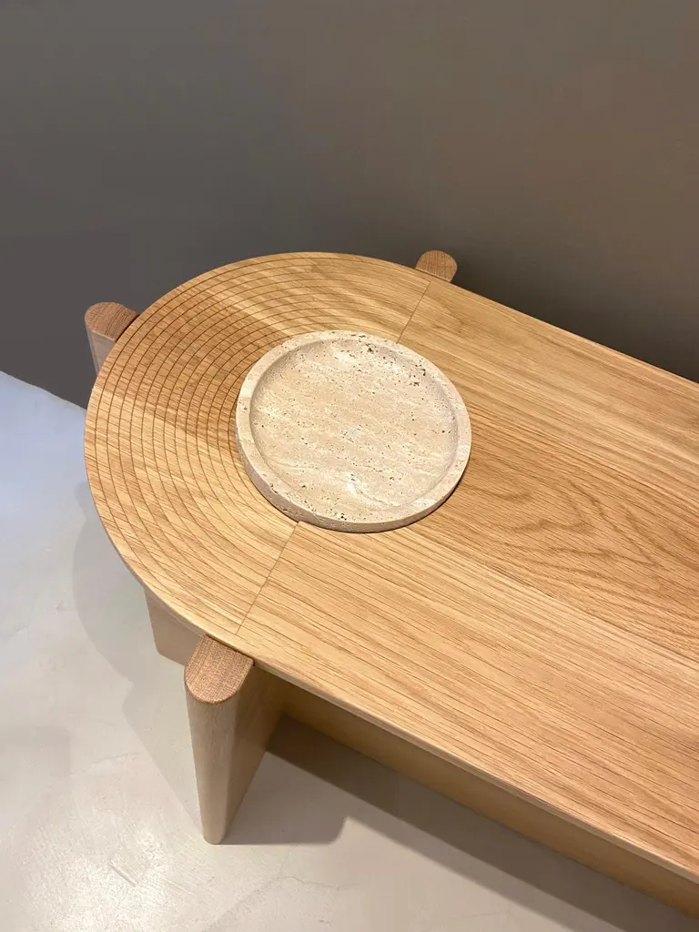Arkhe console table is a graceful combination of functionality, simplicity and sculptural posture. The natural beauty of oak and travertine, exquisite craftsmanship and the inspiration coming from stunning amphitheaters of old times gives this console table its timeless appeal. The design plays with geometry to create unique surfaces that appeal to the sight while dividing the table surface into areas with different functions. The inclined surface lands to a circular slot to hold the travertine bowl which is intended to hold everyday small items or just to be enjoyed as a beautiful centerpiece. Produced by skilled craftsman out of oak and travertine, Arkhe console table can be customized in size and colors to offer answers for different spatial needs and tastes. Arkhe console table is part of the Arkhe collection and designer Fulden Topaloğlu explains the inspiration behind the design:“Arkhe Collection is a tribute to the beautiful amphitheaters dispersed throughout the Mediterranean geography. As a lucky kid growing up in the Aegean coast, the visits to these archaeological sites was an indispensable tradition of our family summer vacations. These visits always left me in awe, as the imagery and sensations of visiting these majestic remains of ancient times always gave a larger than life feeling to the mind and soul of that little kid I was back then. Looking back, I must add that the feeling changed only a little. Arkhe collection is a tribute to these magical ruins of my childhood memories and to all the history, culture and myths they whisper to our collective consciousness.”Material: Solid oak, oak veneer and travertineDimensions: W 127.2 cm, D 44.7 cm, H 76 cm (Travertine bowl diameter: 17.8 cm / 7 inch)Customization is possible in dimensions.