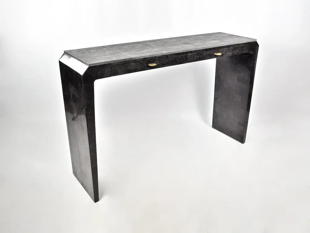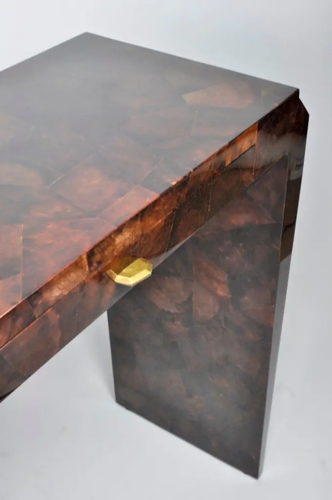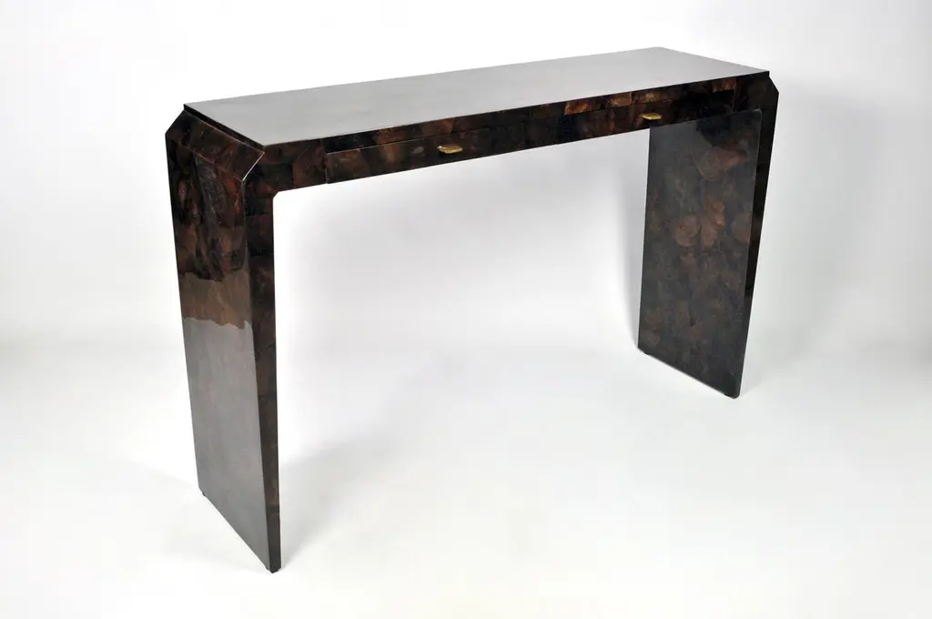 The console table PLUTON is made of a polished shell marquetry in brown colour.It has two drawers with brass knobs.The client can chose the colour of the marquetry and this piece can be made with custom dimensions. The dimensions are 51.18" x 13.77" x H32.67" (130x35x83cm) Care instructions:Keep the materials dry. To clean, simply wipe with a dry clean clothDo not use any cleaning agent on the surfaceThis piece is 100% handmade by our talented master craftsmen. USA trade customers: This piece is made of sea shell and you will need to obtain a fish and wildlife licence to import it in the US (If you don't have one already).The cost is approximately 150$ and is delivered within 1 month.We can assist you with the procedure to obtain it.
