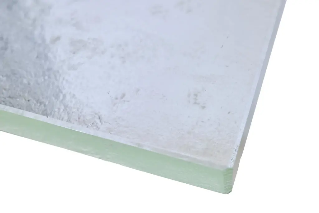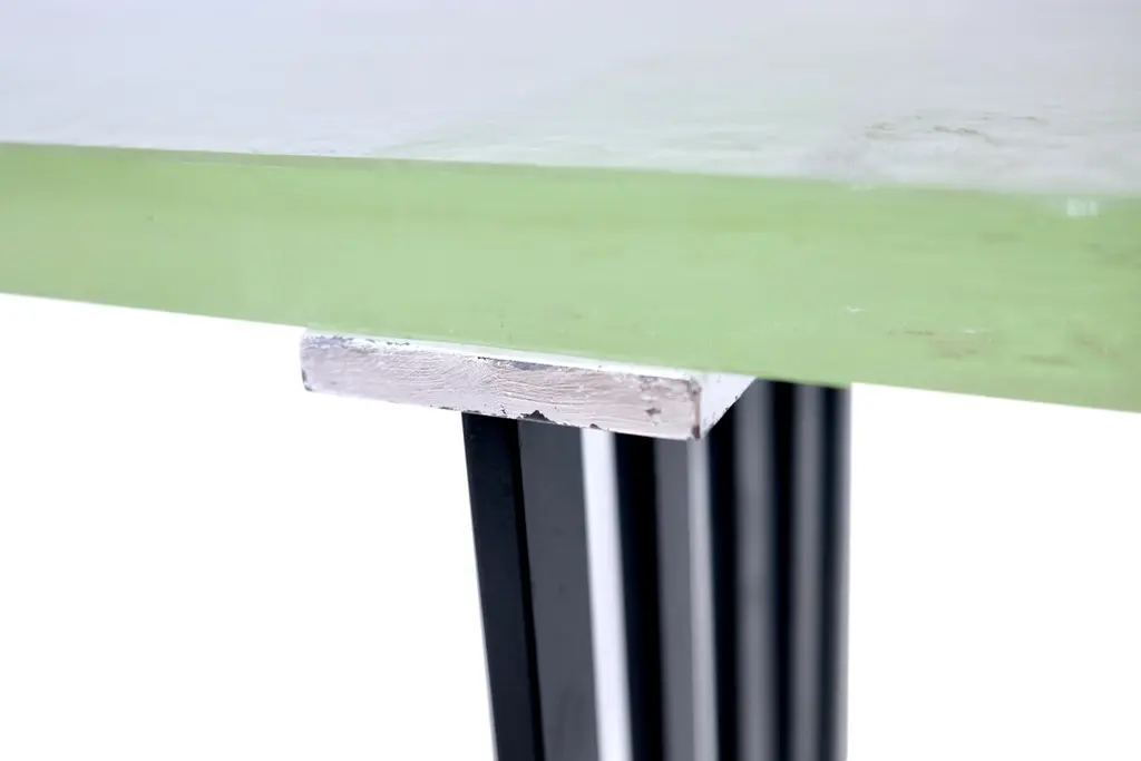 Long console table Very rare, thick glass top cast in sand, France, 1930s.Marriage with U-shaped iron mount in black lacquer with silverings.Dimensions:Width: 193 cmHeight: 85 cmDepth: 31 cm.