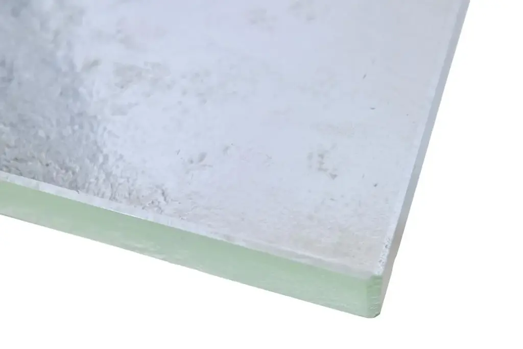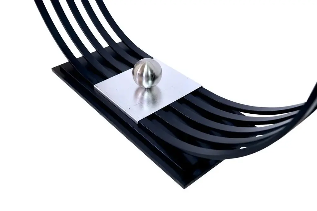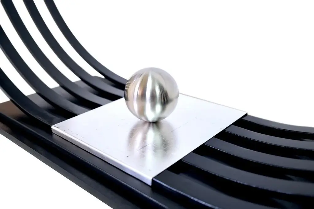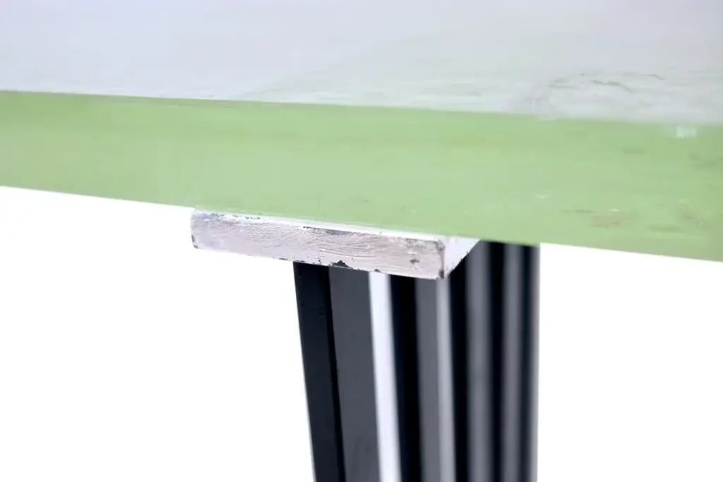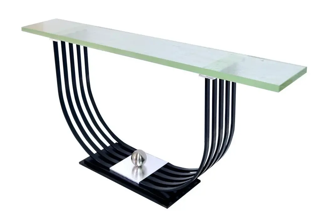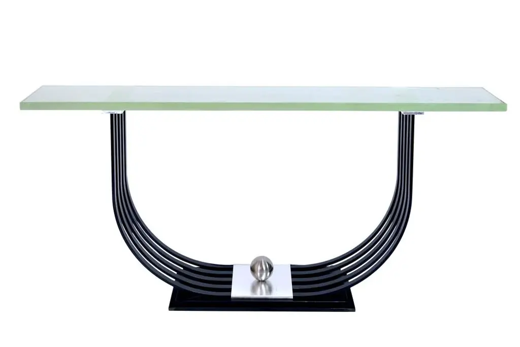 Long console Table Very rare, thick glass top cast in sand, France 1930s. Marriage with U-shaped iron mount in black lacquer with silverings. Dimensions: Width: 193 cm Height: 85 cm Depth: 31 cm.