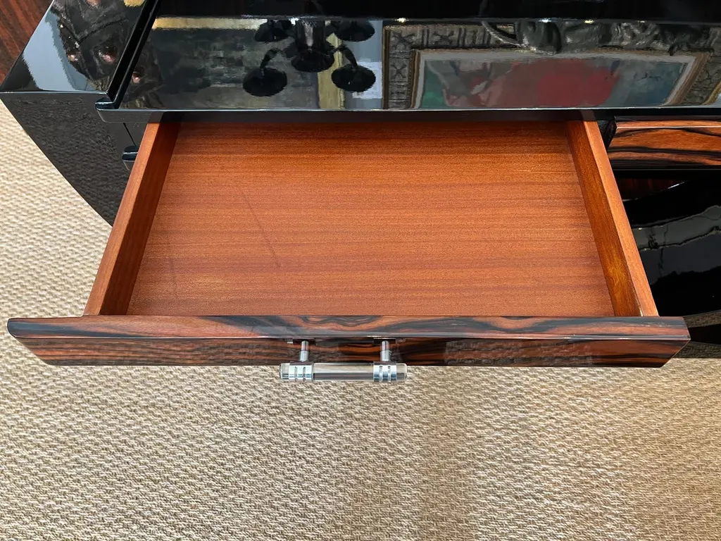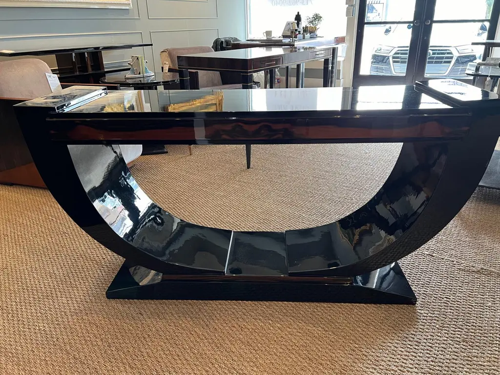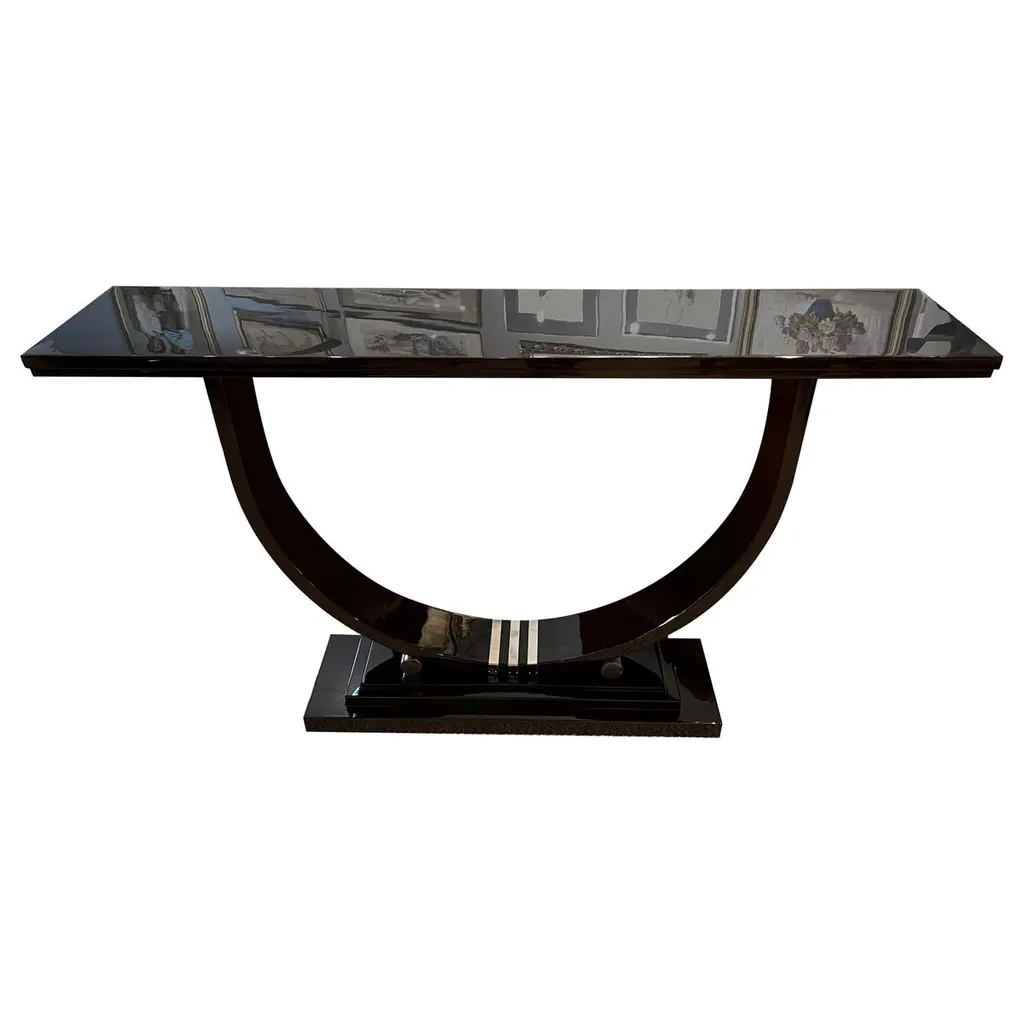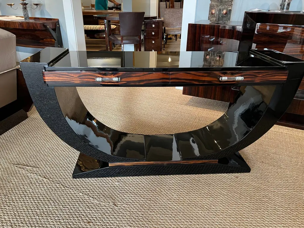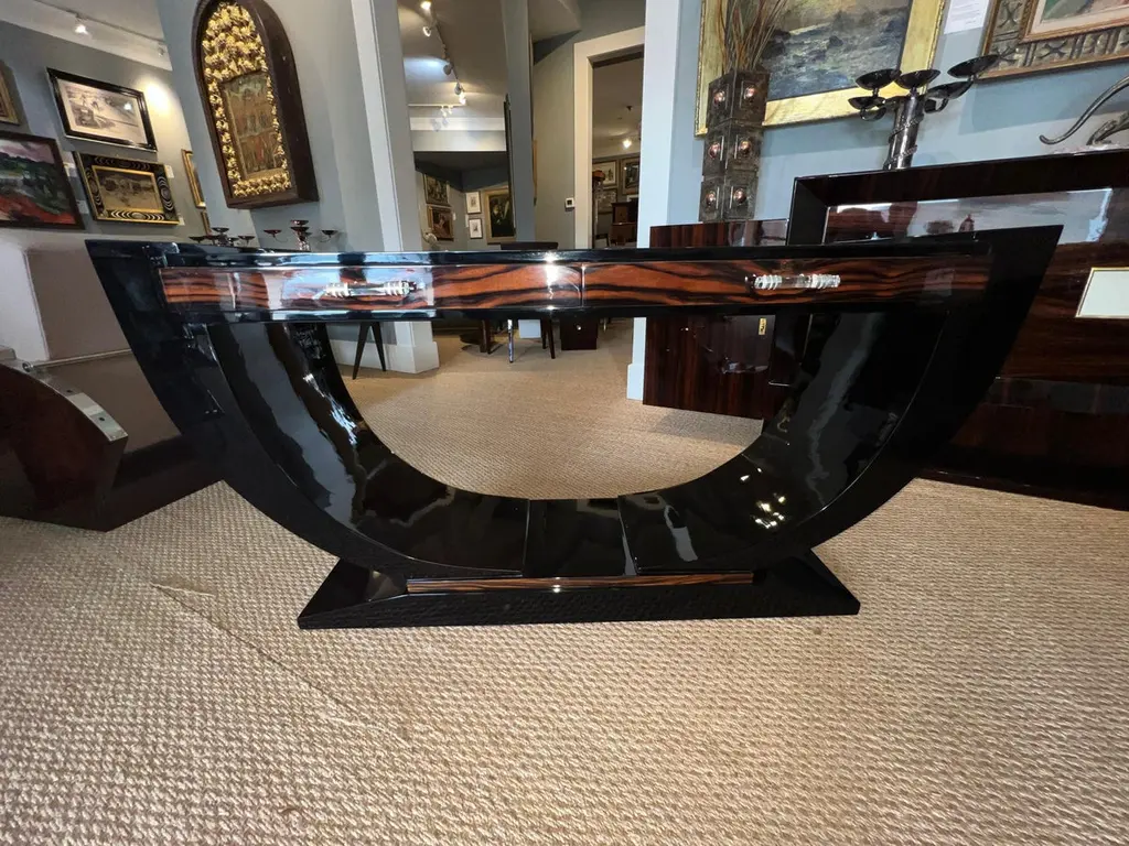 Gorgeous Art Deco French console made out of Macassar wood and ebony. The wood colors are skillfully juxtaposed. The console top is supported by 2 semi-circular legs attached to the prominent trapezoid base. The top has 2 drawers with handles made out of backlight wrapped in chrome. France. c 1930sThe condition is very good. Restored56.5"w x 17.5"d x 29.5"h