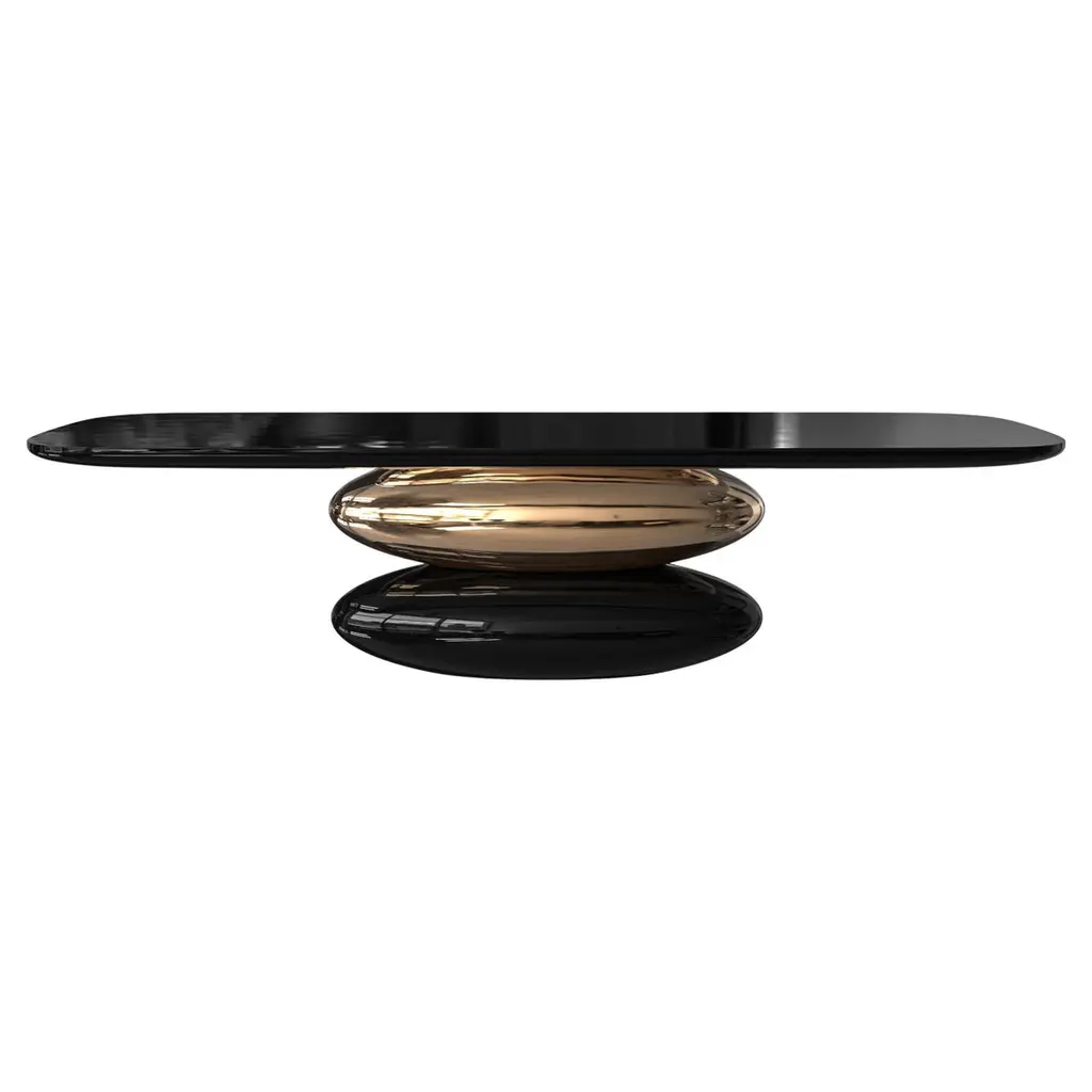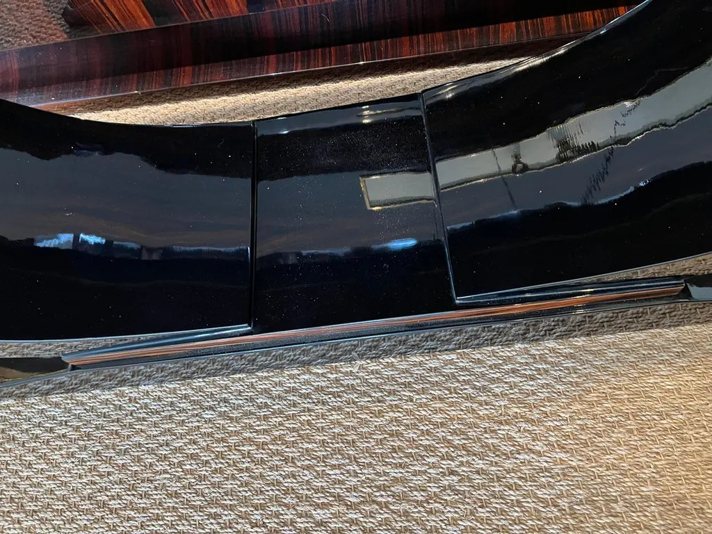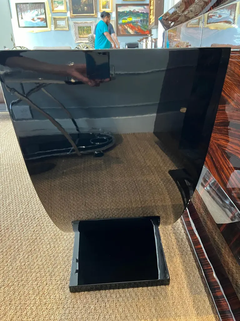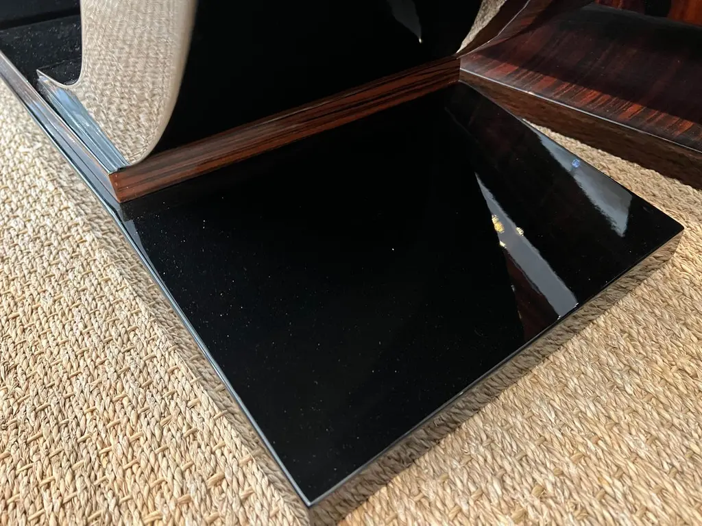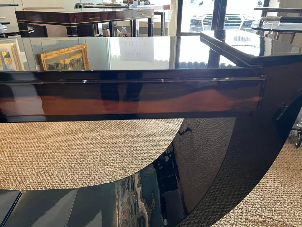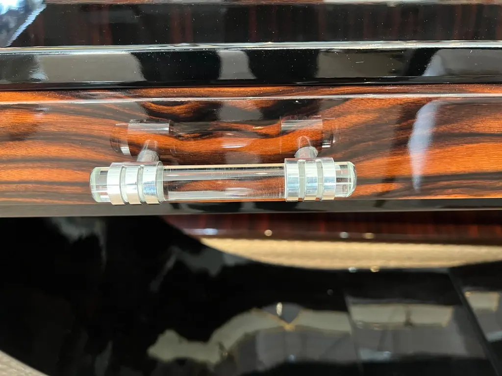 Gorgeous Art Deco French console made out of Macassar wood and ebony. The wood colors are skillfully juxtaposed. The console top is supported by 2 semi-circular legs attached to the prominent trapezoid base. The top has 2 drawers with handles made out of backlight wrapped in chrome. France. c 1930sThe condition is very good. Restored56.5"w x 17.5"d x 29.5"h