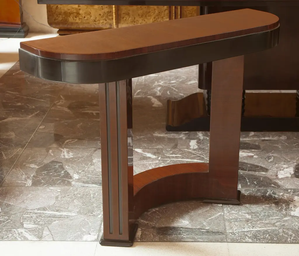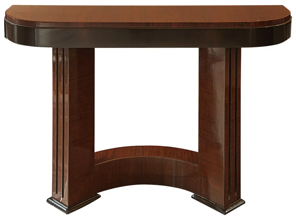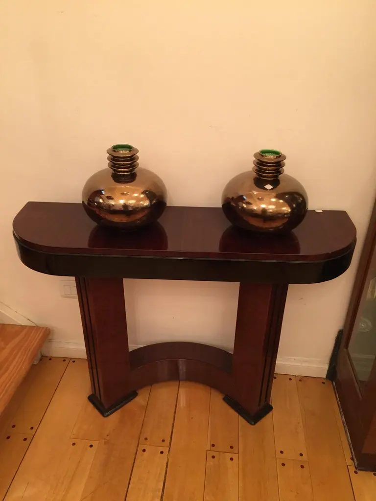 Console Art DecoMaterial: Wood. France.We have specialized in the sale of Art Deco and Art Nouveau and Vintage styles since 1982. If you have any questions we are at your disposal.Pushing the button that reads 'View All From Seller'. And you can see more objects to the style for sale.Why are there so many antiques in Argentina?In the 1880 – 1940 there was a grate wave of immigration encouraged by the periods of war that were taking place.1st World War took place between 1914 and 19182nd World War took place between 1939 and 1945 The immigrants options were New York or Buenos Aires. Tickets were cheap and in Buenos Aires they were welcomed with open arms, as it was a country where everything was still to be done.Argentina was the country of new opportunities, labour was needed and religious freedom was assured, in many cases the of the family travel first until they were settled and then the rest of the family members join them.In the immigrant museum “Ellis Island Immigrant Building” in New York you can se the promotional posters of the boats that would take them to a new life.Between the years 1895 and 1986, Argentina had the highest DGP (gross domestic product) per capita in the world according to the Maddison Historical Statistics index, this situation arose due to the large amount of food being exported to European countries, which were at war.The Argentinean ships left the port of Buenos Aires with food, but they returned with furniture, clothes and construction elements, (it´s common to see this the old buildings of the historic neighbourhood of San Telmo, the beams with the inscription “Made in England)”, as well as many markets that were built in Buenos Aires, such us the San Telmo Market, whose structure was brought by ship and afterwards assembled in 900 Defensa Street. With the great influence of European immigrants living in the country, the children of the upper classes travelled to study in France, resulting in the inauguration of “La Maison Argentinienne”, on 27th of June 1928, in the international city of Paris, which hosted many Argentinians that were studying in Frace. It´s the fourth house to be built after France, Canada and Belgium, being the first Spanish-speaking one. Still in place today (17 Bd Jourdan, 75014, Paris, France). Many of the children of these wealthy families who attended international art exhibitions, museums and art courses abroad, took a keen interest in the European style. This is why Buenos Aires was at the time referred as “The Paris of South America”.Between the years 1890 and 1920 more than a hundred Palaces were built on Alvear Avenue the most exclusive avenue in Buenos Aires. Today some of these palaces have been transformed into museums, hotels and embassies.In the year 1936, the Kavanagh building was inaugurated, it was the tallest reinforced concrete building in South America.During 1994 the American Society of Civil Engineers distinguished it as an “international engineering milestone”, and it´s now considered a World Heritage of Modern Architecture.At the time was common to hire foreign architects such as Le Corbusier, who visited Buenos Aires/Argentina in 1929 and in 1948 he drew up the blueprints for a house built in La Plata City (which was declared a World Heritage Site).In 1947, the Hungarian architect Marcelo Breuer designed “Parador Ariston” in the seaside city of Mar del Plata. After an Argentinean student at Harvard University convinced him to come to Argentina. He worked on an urban development project in the Casa Amarilla, area of La Boca. The Ukrainian architect, Vladimiro Acosta, arrives in Argentina in 1928 and worked as an architect until que moved to Brazil.Antonio Bonet, a Spanish architect who worked with Le Corbusier in Paris, arrives in Argentina in 1937, where he carried out several architectural works and in 1938 designs the well-known BFK chair.Andres Kálnay, of Hungarian origin, made around 120 architectural masterpieces, among which the former Munich brewery stands out, he even made the furniture’s design. The German architect, Walter Gropius, director of the Bauhaus, lived in Argentina, where he wrote articles for “Sur” magazine and founded in Buenos Aires, an architectural firm with Franz Möller, who was also an architect, where he built two houses.At the same time several famous designers decided to immigrate to Argentina, among them we can find the well-known French designer, Jean-Michel Frank, who arrived in the country in 1940 and also worked for the Rockefeller family.Special pieces were made, which were sold exclusively in the country, such as the well-known German company “WMF”, who sold their products by catalogue, which were chosen by the ladies of high society in the list of wedding gifts, as well as the pieces designed by Christofle. The Swiss sculptor Alberto Giacometti, made special pieces for Argentinean mansions.In 1904 the first Jansen branch outside Paris was established in Buenos Aires, as the Argentinean clientele demanded a large amount of furniture, from the end of the 19th century to the mid-20th century.In 1970, the brand Rigolleau Argentina made pieces authorised by Lalique.The brands Maple and Thompson also set up shop in the country.The French plastic artist, Marcel Duchamp moved to Argentina in 1918-1919.Glass signed Gallé, Charder, Leverre, Schneider, Muller and other French firms. They were bought in flower shops and were given to ladies with beautiful floral arrangements. Some furniture manufacturers travelled to international fairs and bough the patterns to produce the furniture in Argentina, such as the furniture firm Englander and Bonta, who bought the patterns ins Italy.It is worth mentioning that in Argentina we have the largest community of Italians outside of Italy, as it is estimated that 70 percent of the inhabitants have at least one Italian descendant, followed by Spanish immigrants.The most Important furniture stores in Argenti