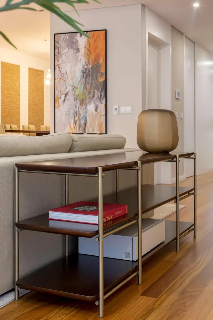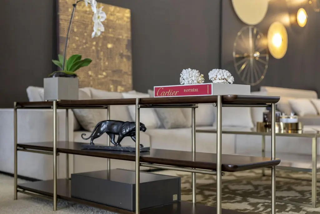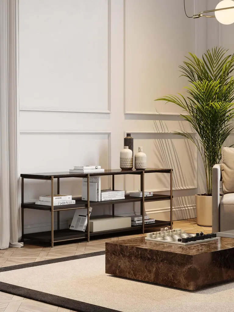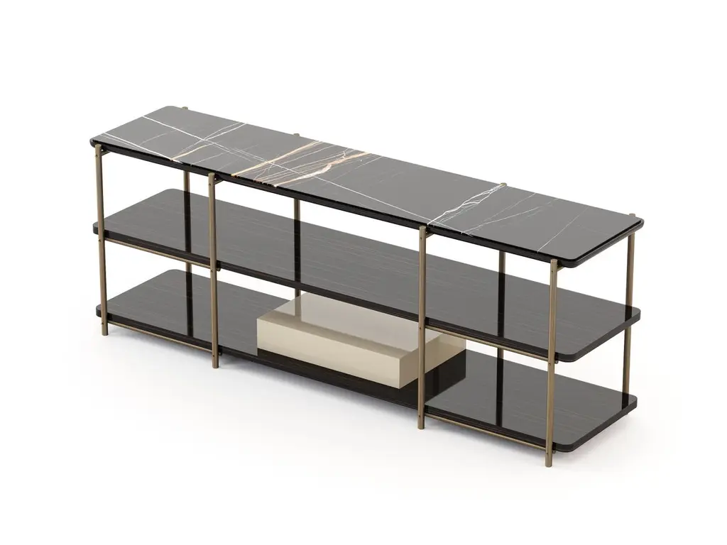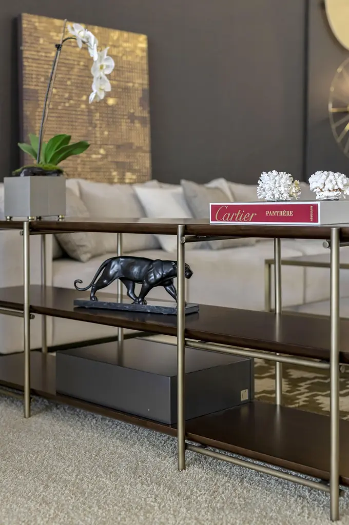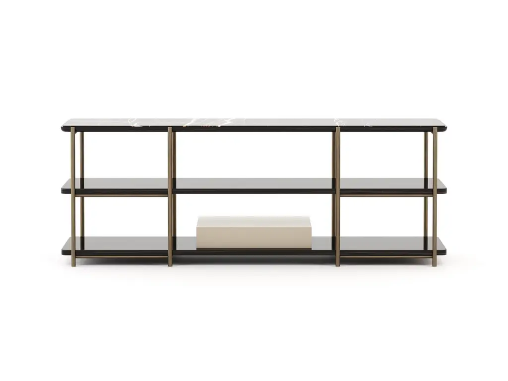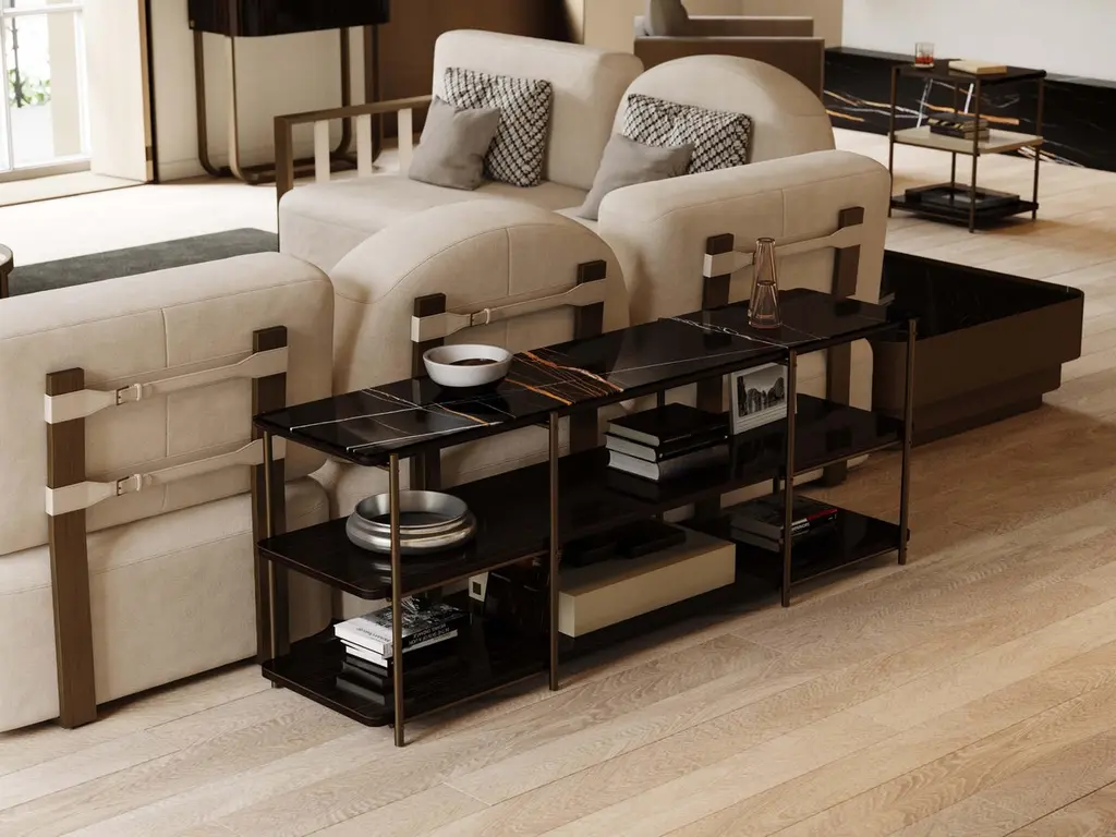 His & Her are complementary collections whose aim is to affirm the brand´s aesthetic. These two collections are inspired by artistic movements from the beginning of the 20th century, namely in the aesthetic plurality that spread throughout Europe of Art Nouveau, and later in Art Deco, as well as in international style that has developed around the world.In a modern and sophisticated environment, the Her low console commits to deliver high quality finishing materials. An attractive console that will make a difference in your living room. Set on a brushed bronze structure, the Her low console has shelves to display your decorative or useful storage items. The sahara noir marble top gives it a natural touch and chic look. The ideal piece to present all the decorative items with maximum glamour and luxury. The delicate contours of this piece fills spaces discreetly but with intention.As the product can be personalised, the image of the presentation is merely illustrative.