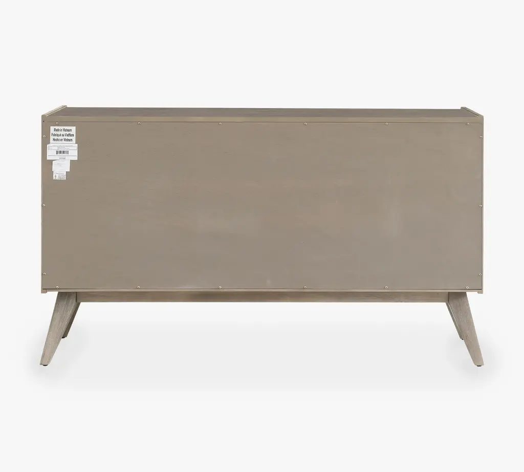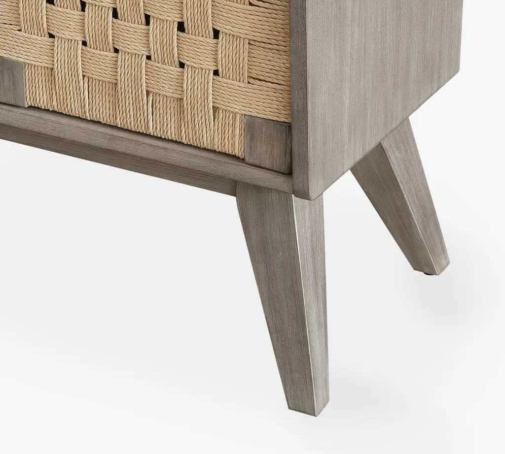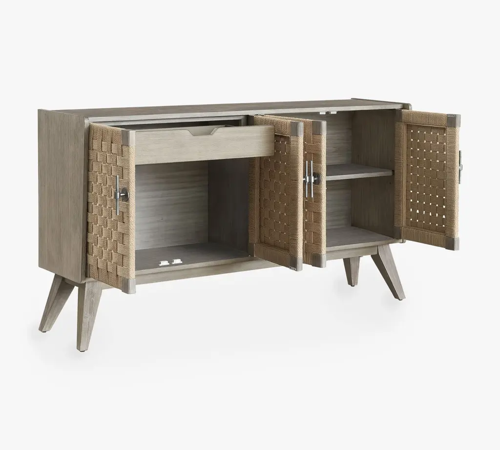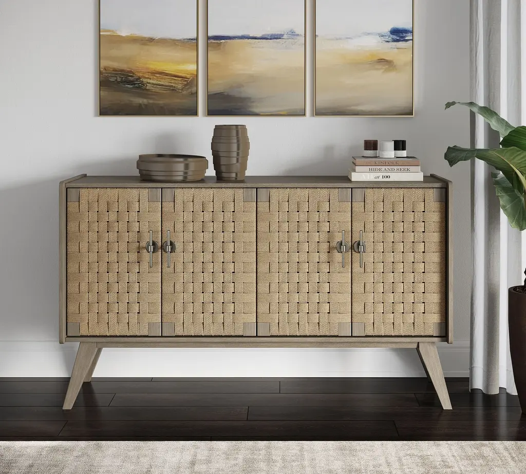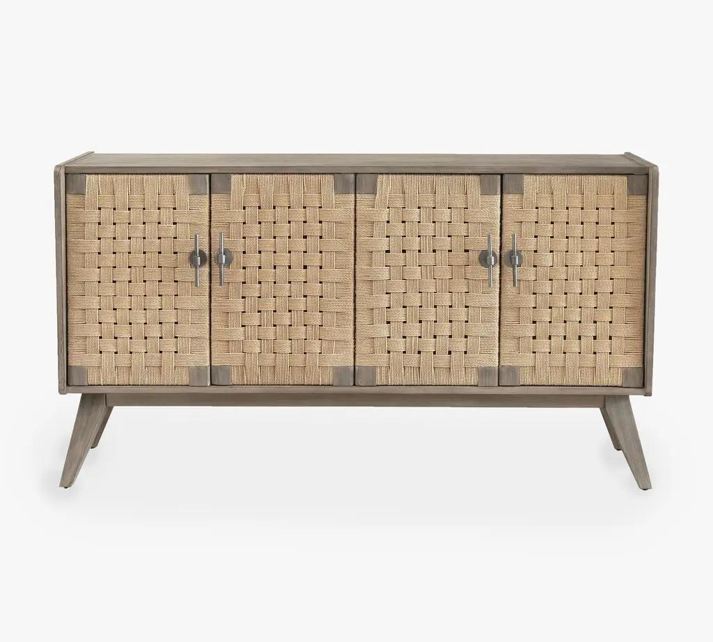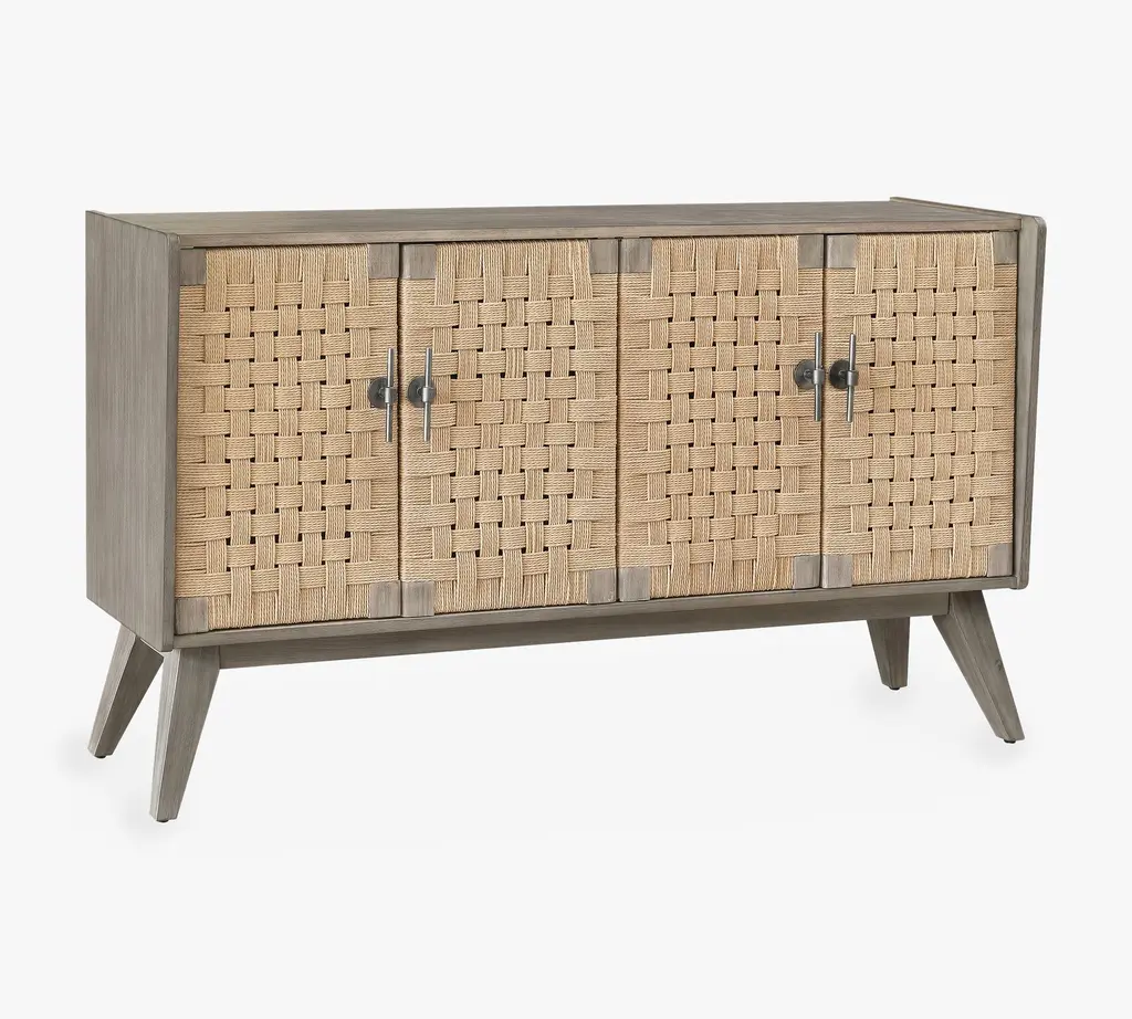 The smooth grain of wood and woven texture of seagrass combine for something luxe but still relaxed. Golden seagrass counterbalances the cool gray finish – like sun and fog – and metal accents are understated. This is storage that looks sophisticated.