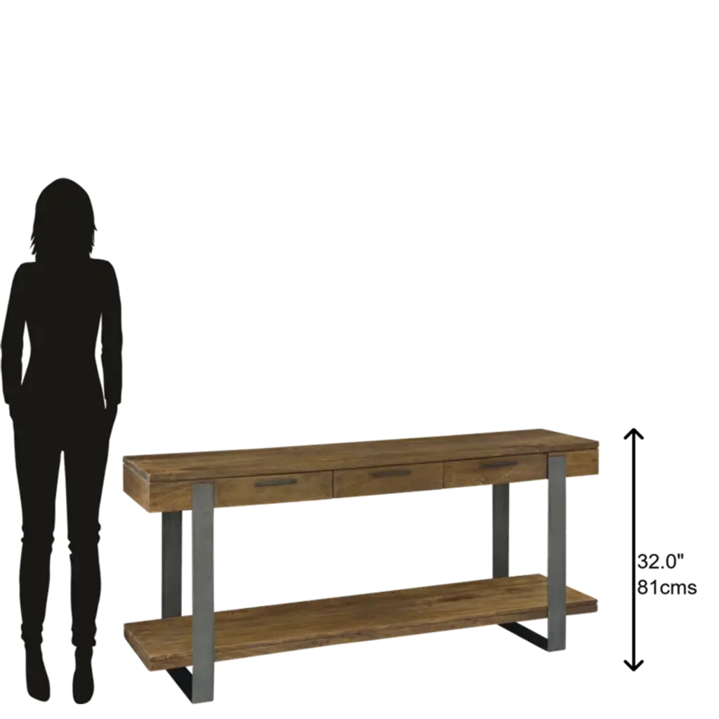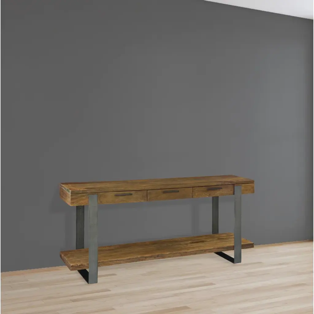 Wood meets metal. Our console table combines the warmth of solid mango wood with a sleek metal base for a modern touch. Three drawers with cutout pulls keep your essentials organized, while the open shelf below provides additional display space. The finished back allows you to use this versatile piece as a room divider or against a wall. Natural wood grain color variation ensures your table is uniquely yours. Arrives fully assembled.