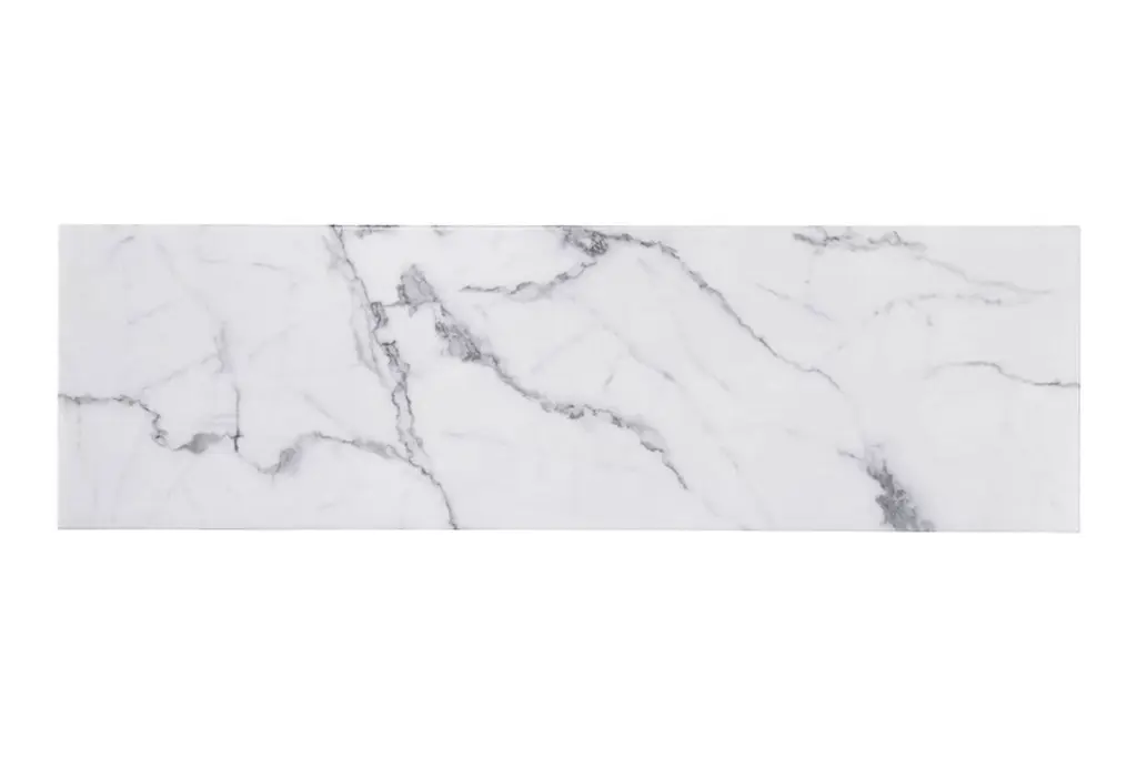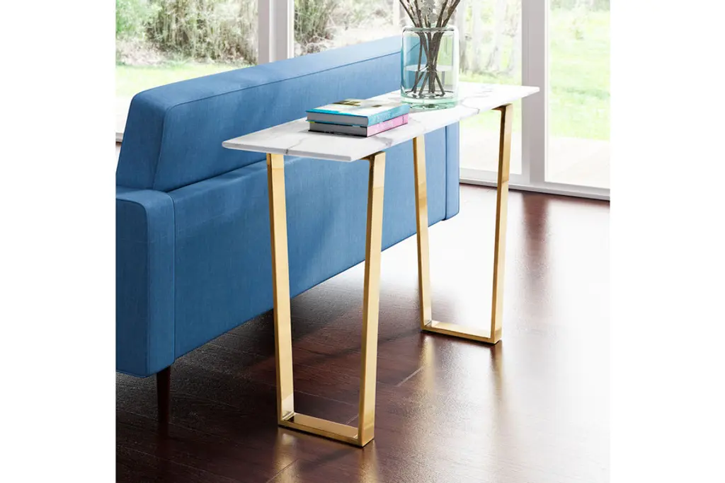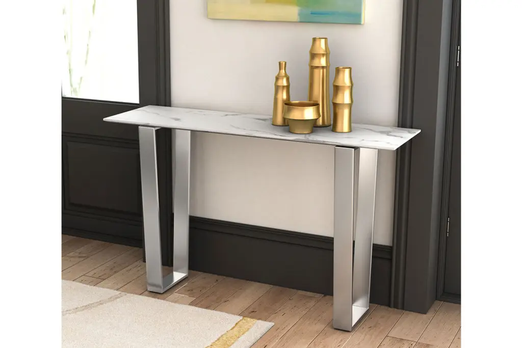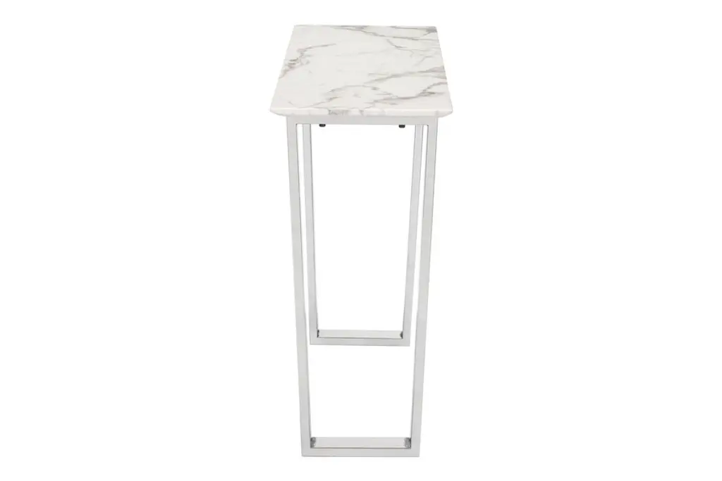 Stunning from every angle, the Atlas Console Table represents a terrific addition in a modern or traditional living space. The console table features a simple yet sophisticated polished steel base and is long and narrow to fit most living spaces. It also boasts a dazzling rectangular faux marble top that appears to float gracefully. Enjoy a one-of-a-kind console table thanks to the Atlas Console Table.