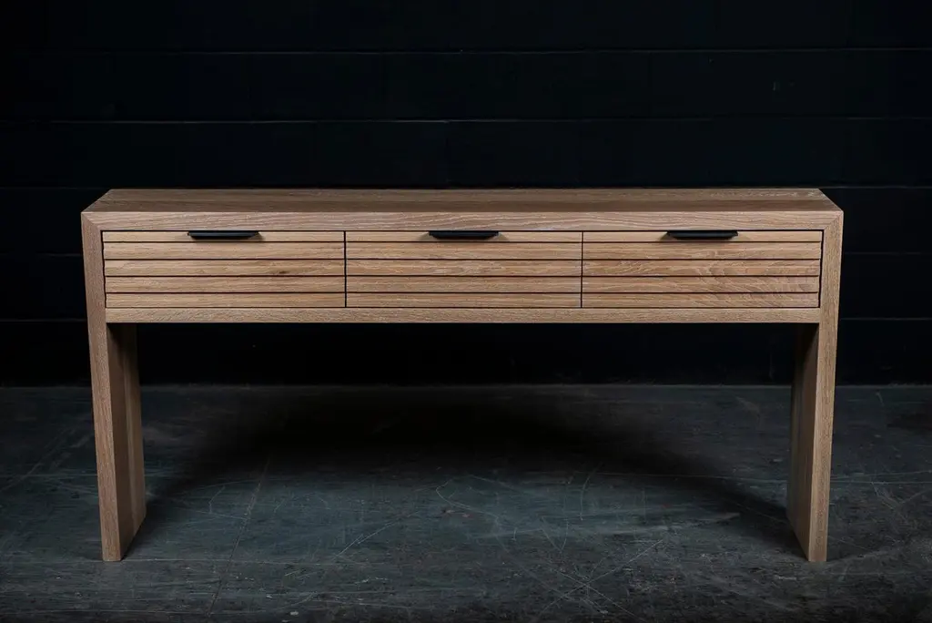 The Atwater Console is made-to-order. Designed to store daily and occasionnals objects. The three solid wood drawers are featuring leather veneer bottom and a ribbed wood fance. The metal hardware are studio-machined with hand blackened finish. Wood surfaces has an hand rubbed natural oil & wax finish that enhance the real beauty of the wood and give a natural warm touch. Each AMBROZIA piece is fully customizable and available in a variety of finishes.The symbiosis of the natural curves and the contemporary line result in a real eyecatcher piece of art for your home entryway or hallway, your bedroom, your home kitchen, your dining room, your business office or even an hotel corridor.This item is made to order in our Factory in Canada. This authentic Ambrozia piece is signed by our branded solid brass medallion.