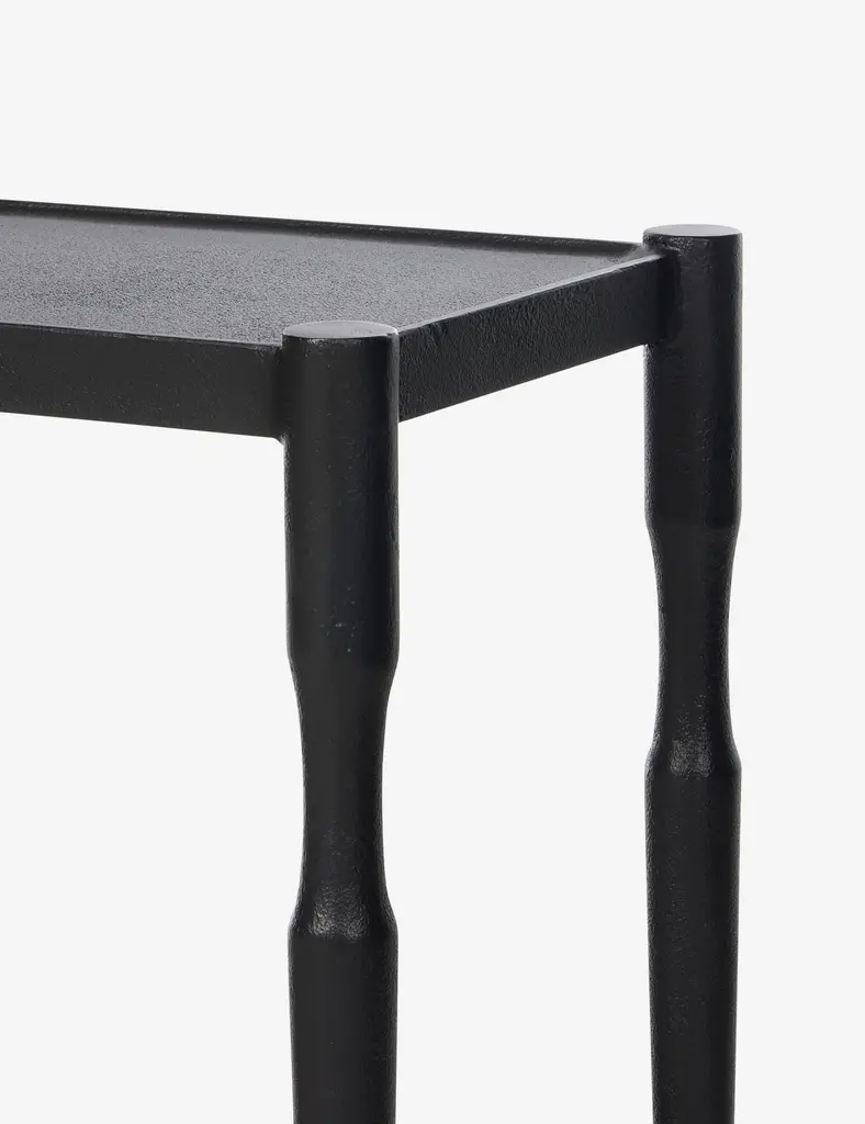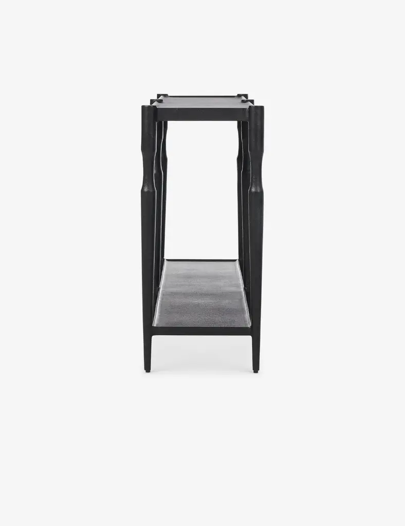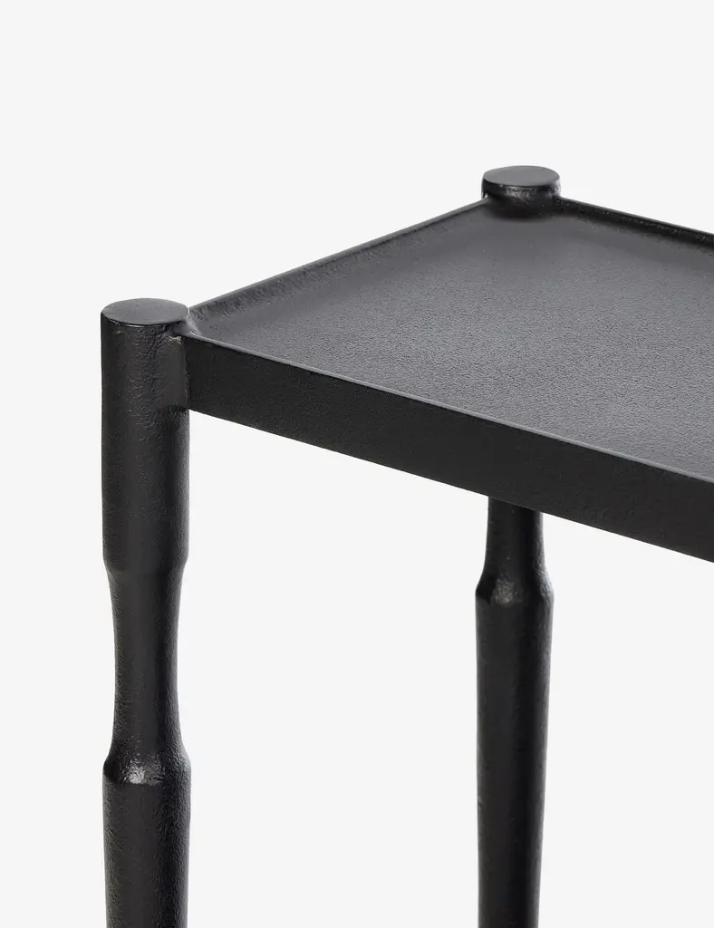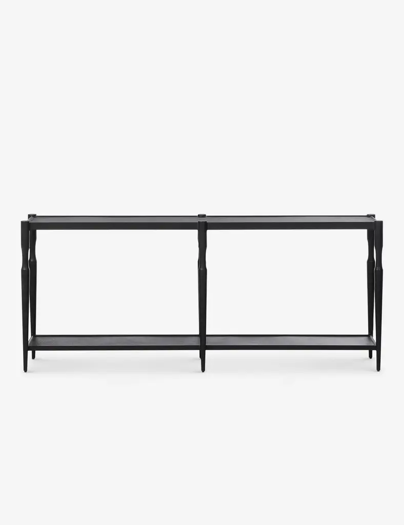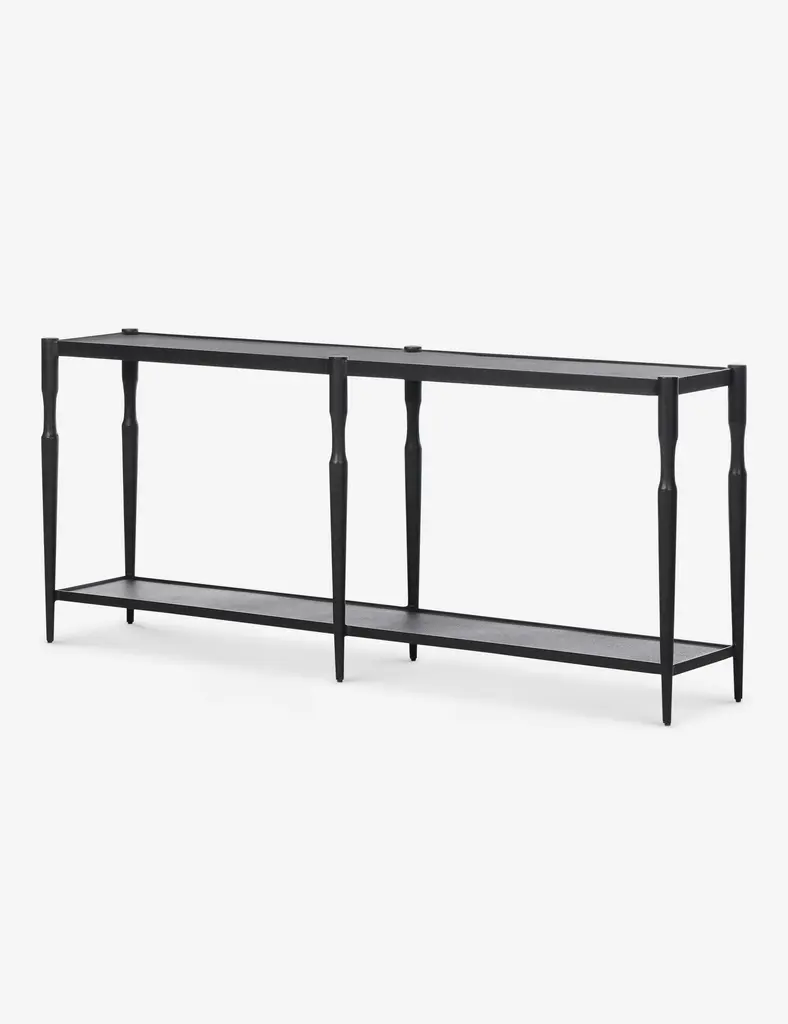 Four Hands brings their exceptional craftsmanship to a timeless collection rooted in Amber Lewis' perennial California style. Cast iron legs frame a tray-style top with a lower shelf for added storage in the Augusta console table. This classic black console table folds into transitional and modern settings with understated impact.