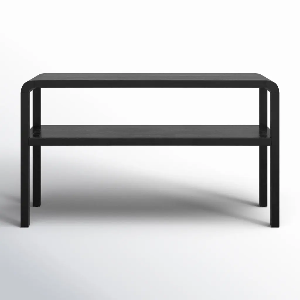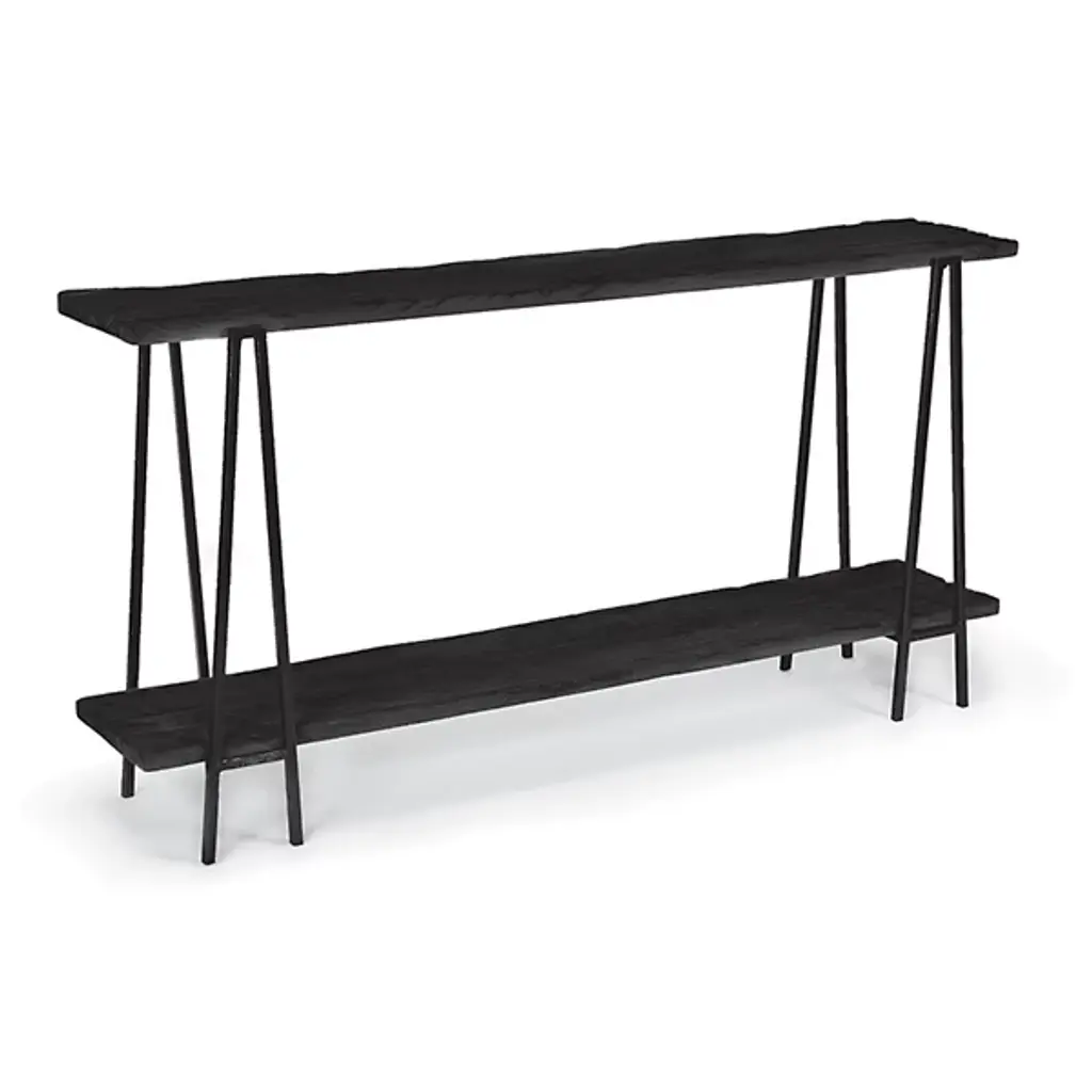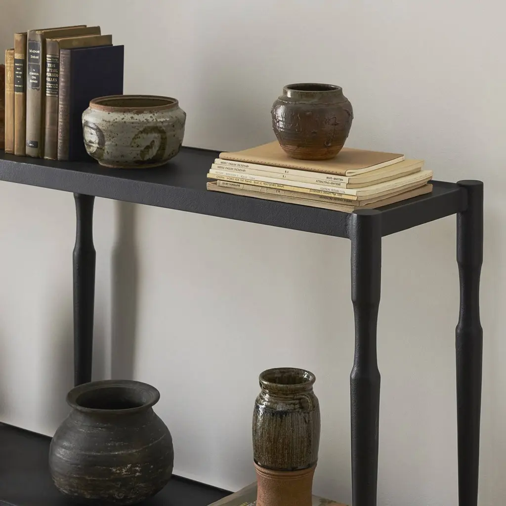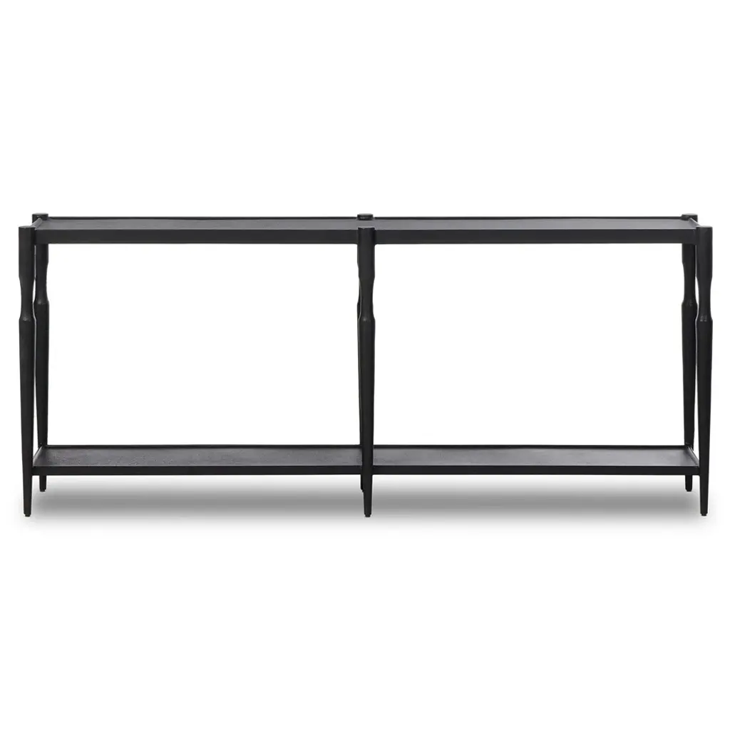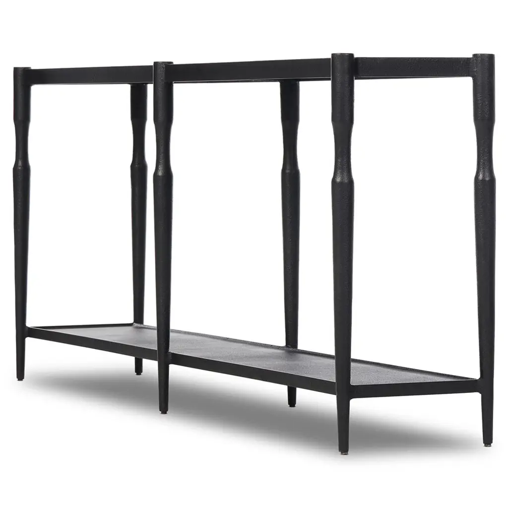 A design collaboration by Amber Lewis and Four Hands. Simple and turned, textured cast iron legs shape a slim, open base for a tray-style top, with lower shelving for bonus storage and display. A classic black finish works into any space or style with ease.