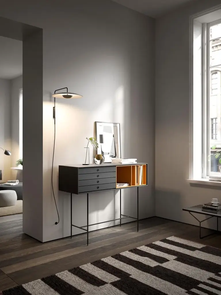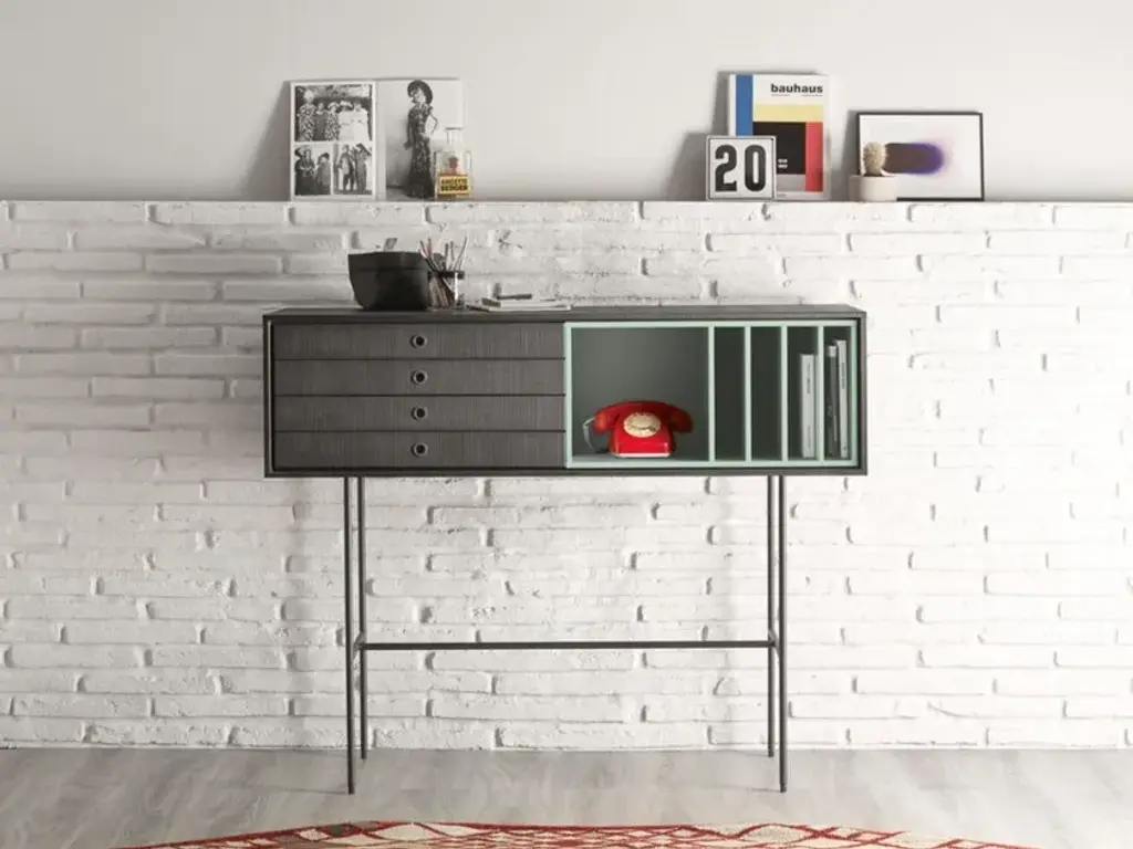The Aura collection features an outer frame (case) designed to accommodate a variety of interchangeable modules.All components can be manufactured in any wood or lacquer finish available in the TREKU collection, with no price variation.Pictured:Storage box module 128 x 32 x 47 cm in GraphiteDrawers 64 x 32 x 47 cm in GraphiteOpen compartment 64 x 32 x 47 cm in OchreFor additional finishes, please contact our Customer Service Center.The Aura collection has been conceived mainly for sideboards and furniture for living rooms and dining rooms. Its design is inspired by the past and under the influence of the design culture of the Nordic countries, which know how to combine tradition and naturalness with large doses of modernity. The result: a collection full of memories that gives off a very modern aura. The metal and wood legs designed especially for the collection reinforce that retro and timeless look. The finish is very important: walnut and oak wood with a hyper-natural finish and a lacquered look which combine perfectly well with the wood.