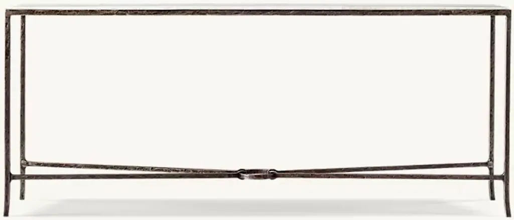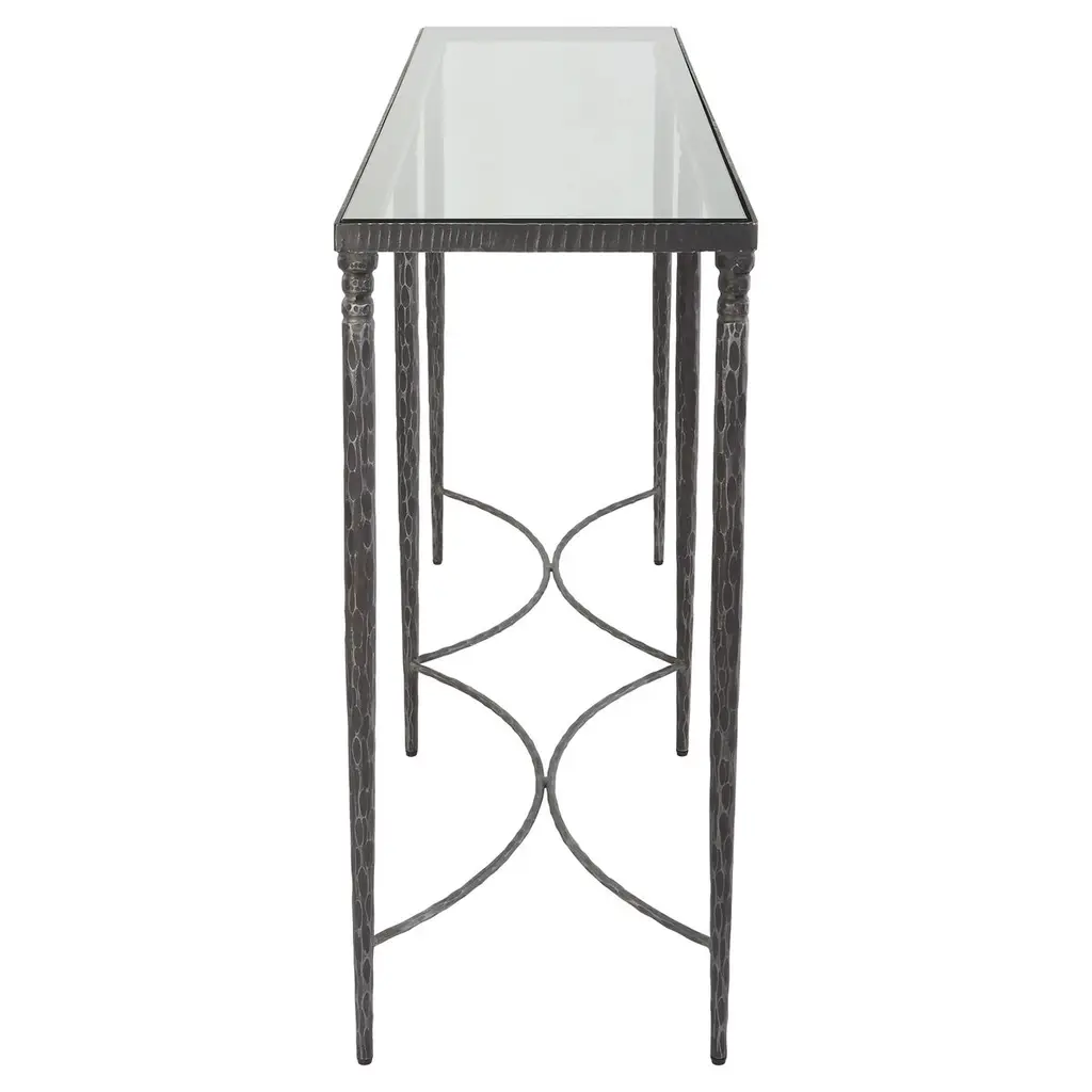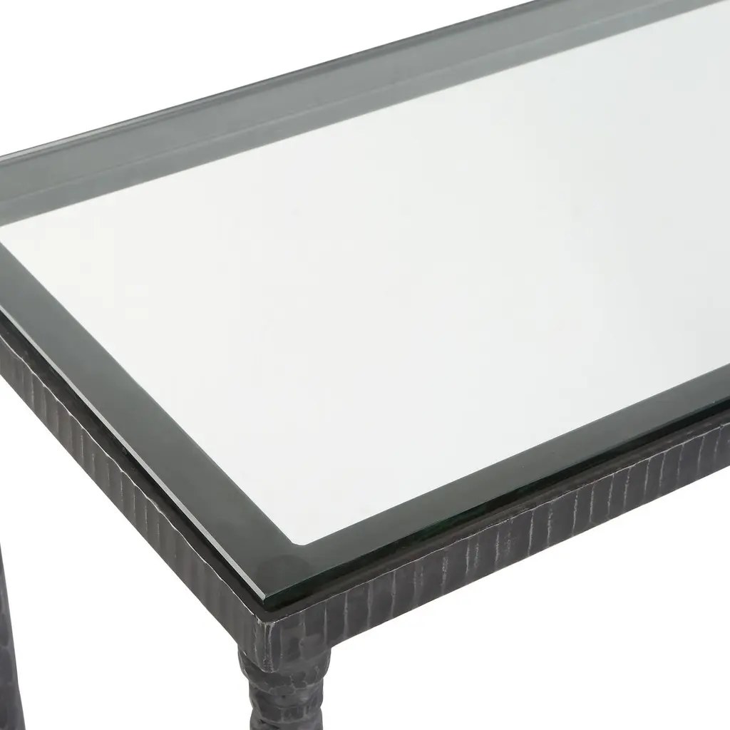 The Aurembiaix Console Table is a masterpiece of design, a testament to the timeless allure of solid iron. Its natural rustic finish whispers tales of elegance and strength, while the chiseled details and aged distressing add a touch of history and character. The clear tempered glass top offers a window into its soul, reflecting light and beauty in equal measure. This console table is not just a piece of furniture; it is a romantic ode to craftsmanship and style, a perfect blend of form and function that will grace any space with its presence.