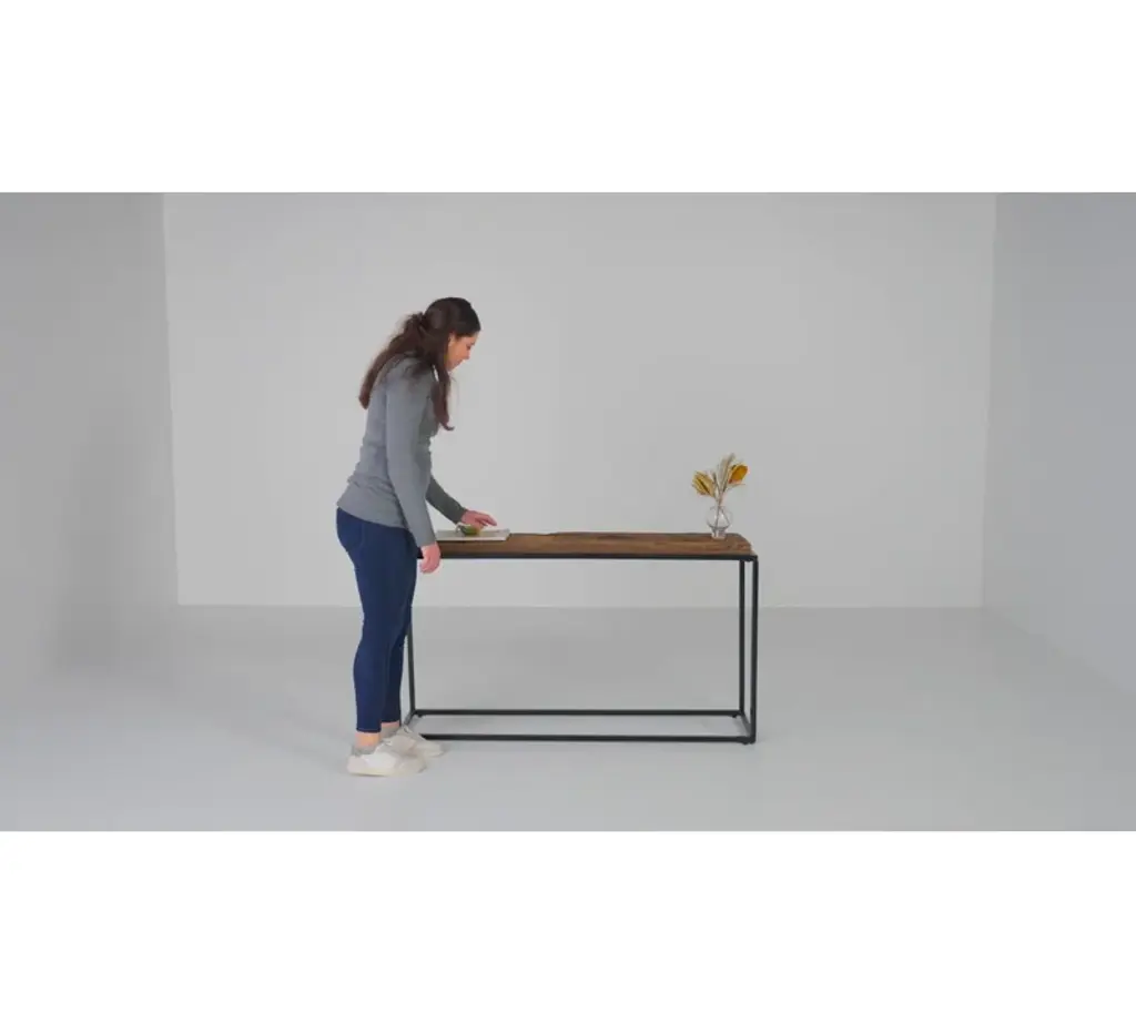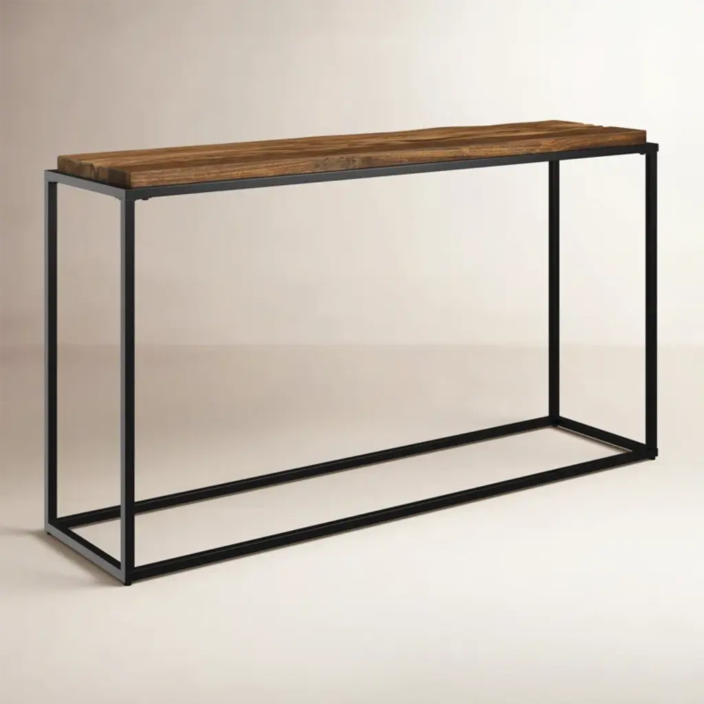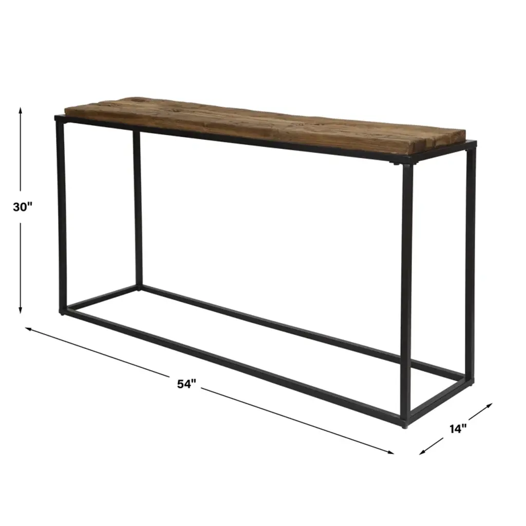 This rustic console features an iron frame in satin black topped by a natural reclaimed wood top. True to the nature of salvaged wood, this piece will show rustic signs of past usage. Solid wood will continue to move with temperature and humidity changes, which can result in small cracks and uneven surfaces, adding to its authenticity and character.
