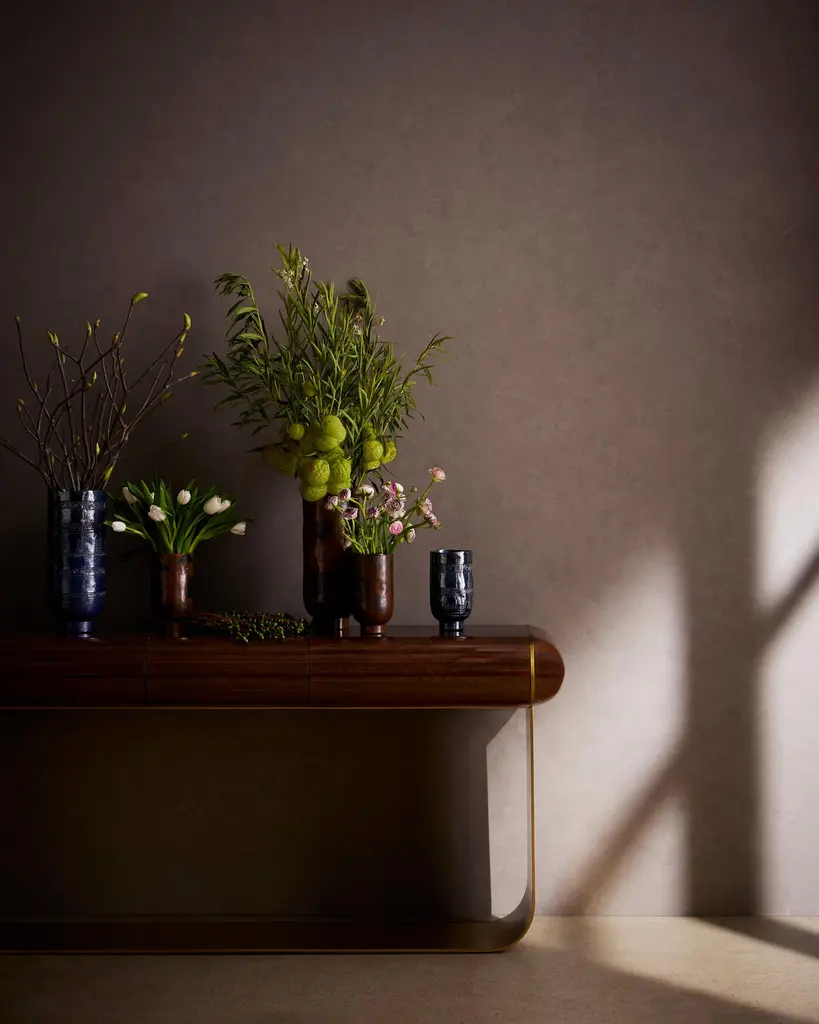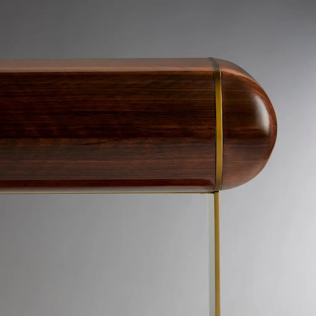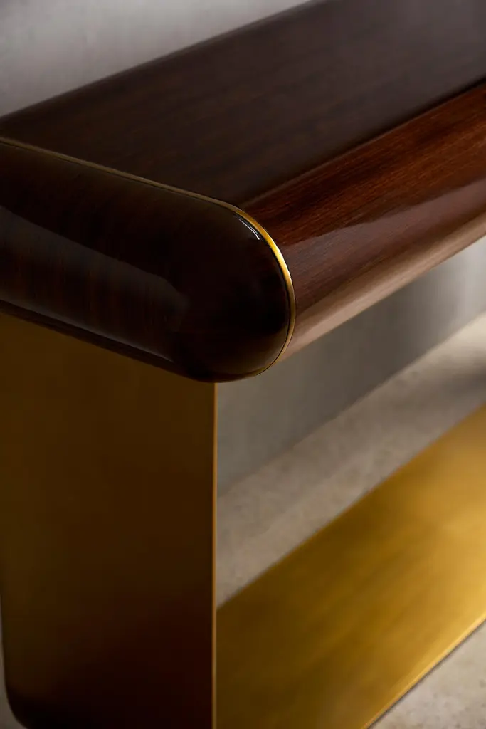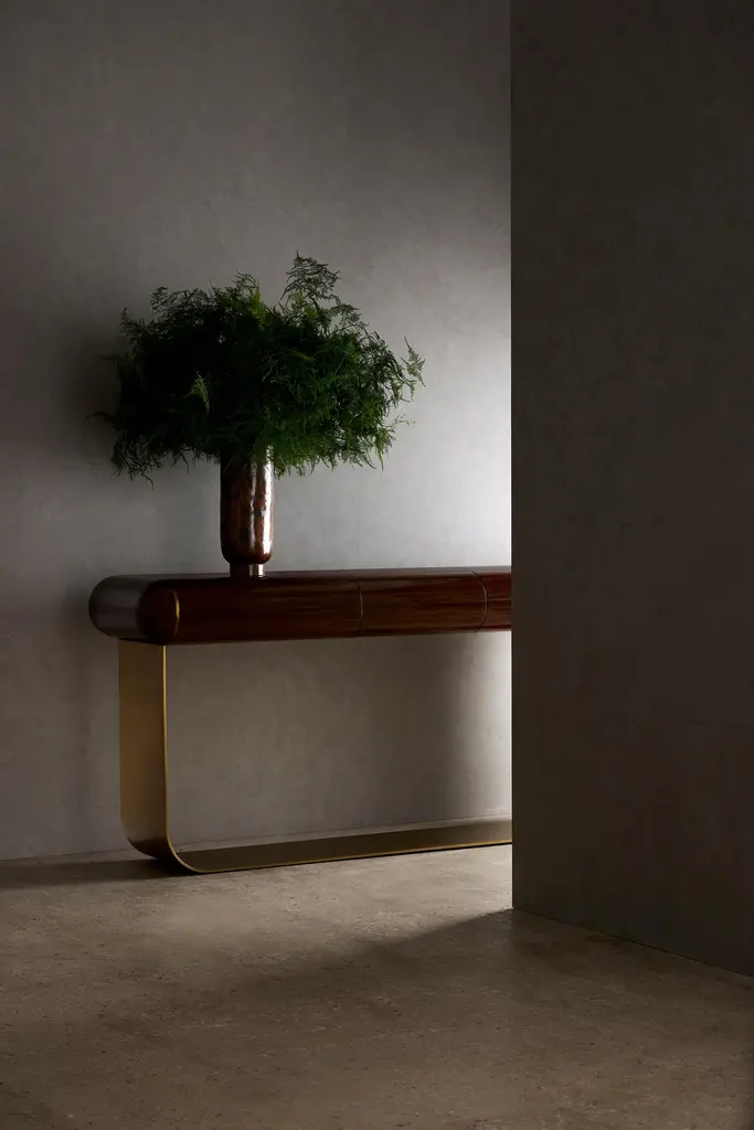 A seamless base of shaped brass anchors this refined console table with a top of high-sheen Daniella wood. Twin inlays of burnished brass on either end align with the vertical supports of the base. A central drawer offers subtle functionality for placement in entryways, suitable for tucking away keys.