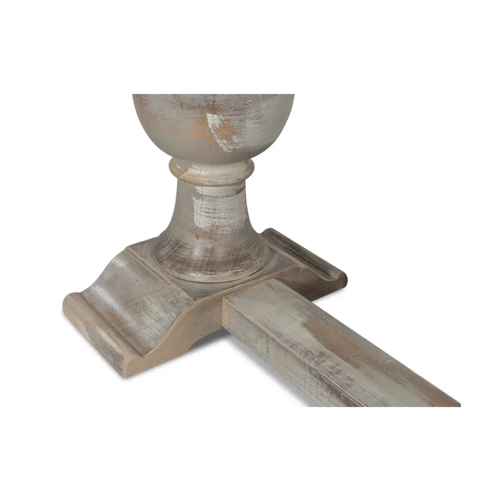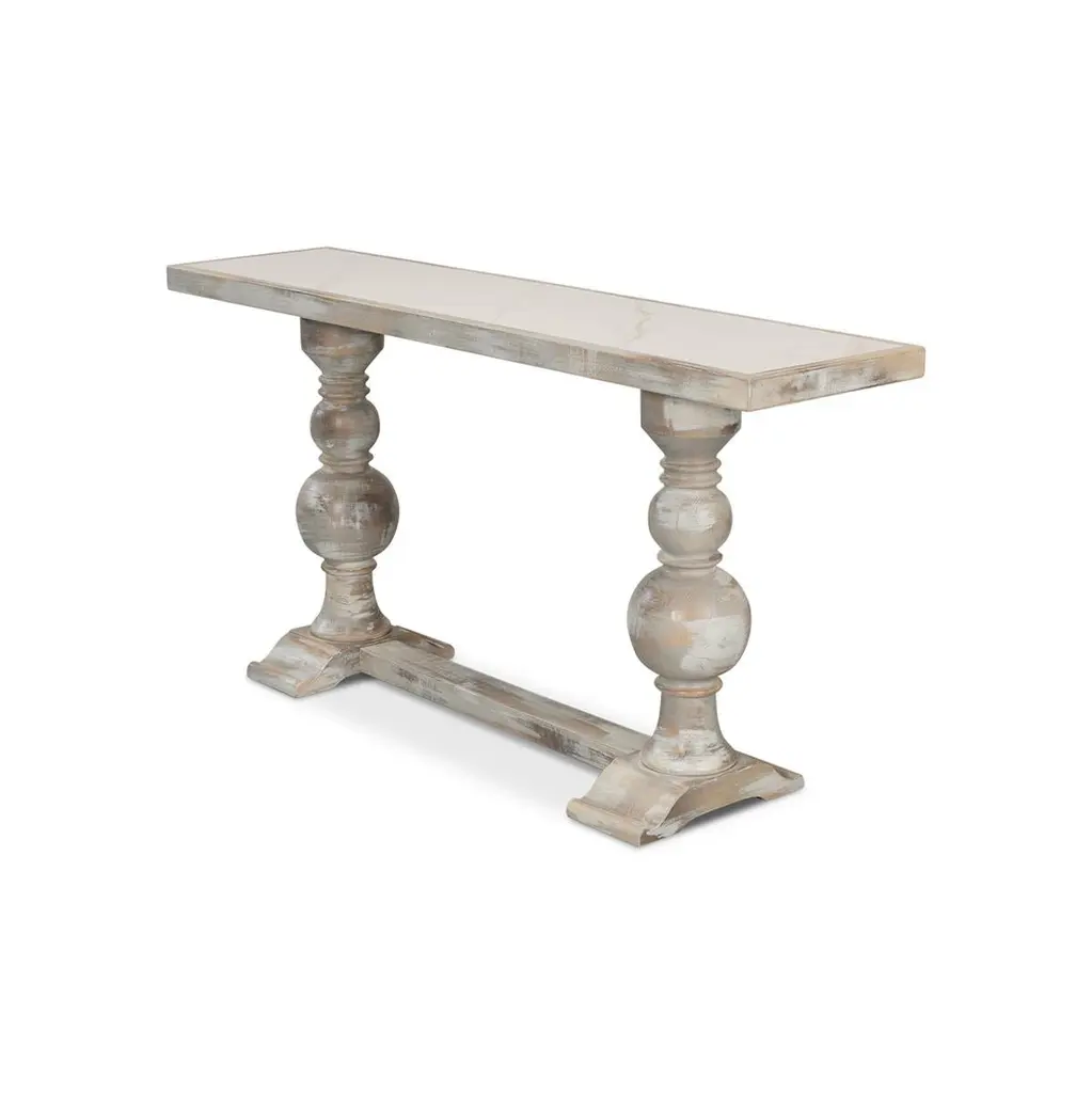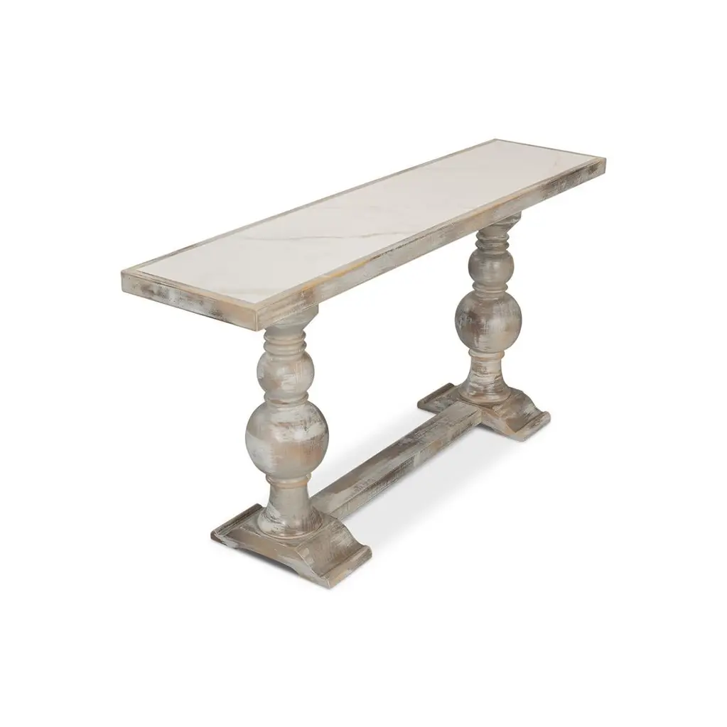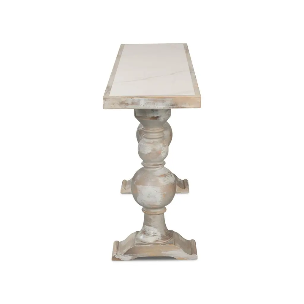 With a hand-rubbed and antiqued grey painted finish, the top inset with Calacatta gloss porcelain, raised two turned baluster legs with a stretcher base.Dimensions: 61" W x 15" D x 30" H
