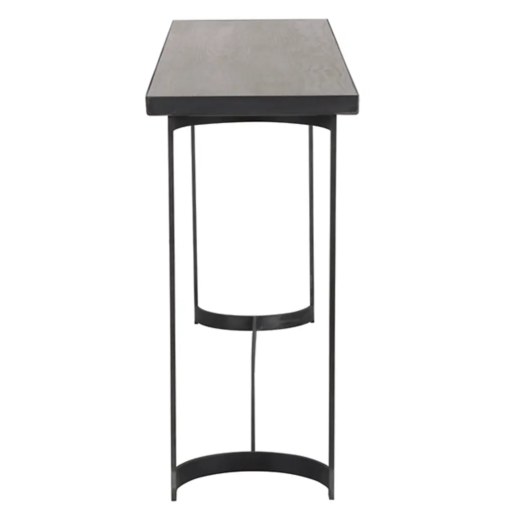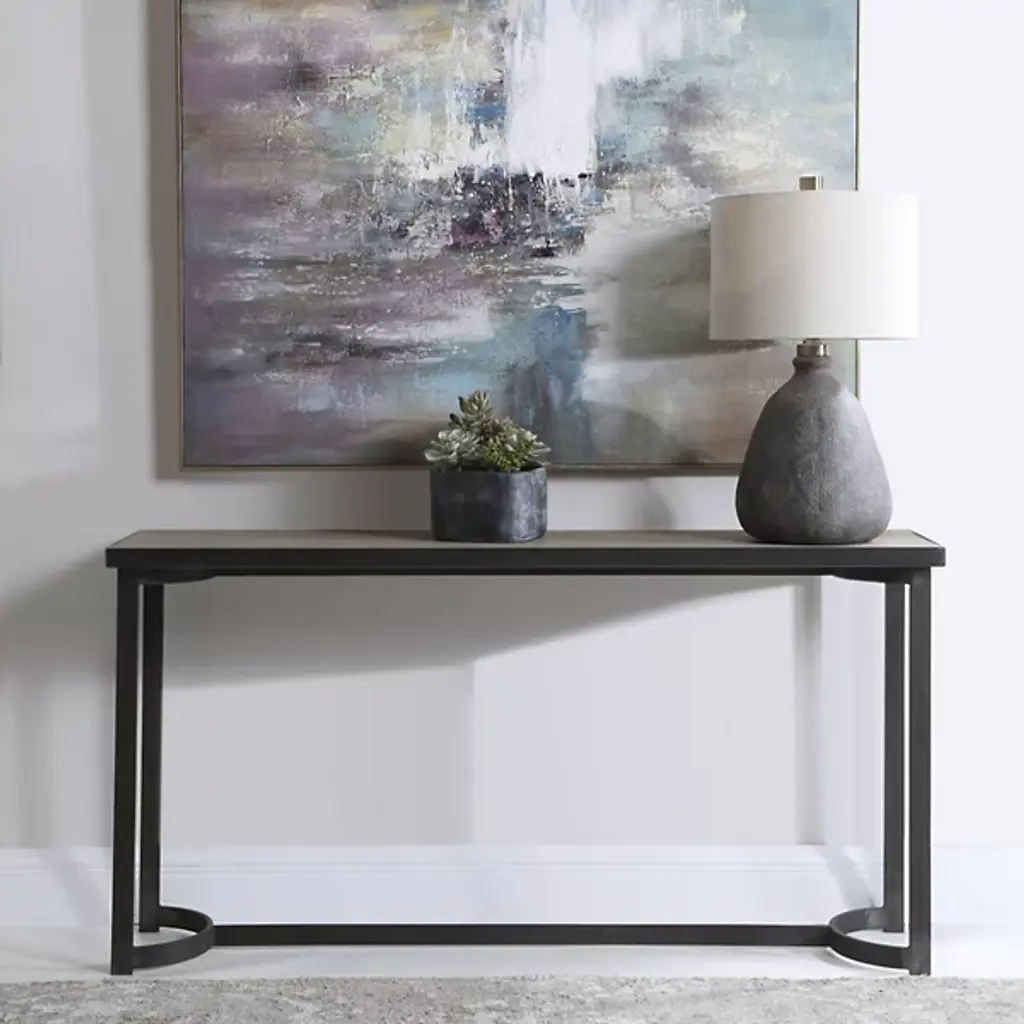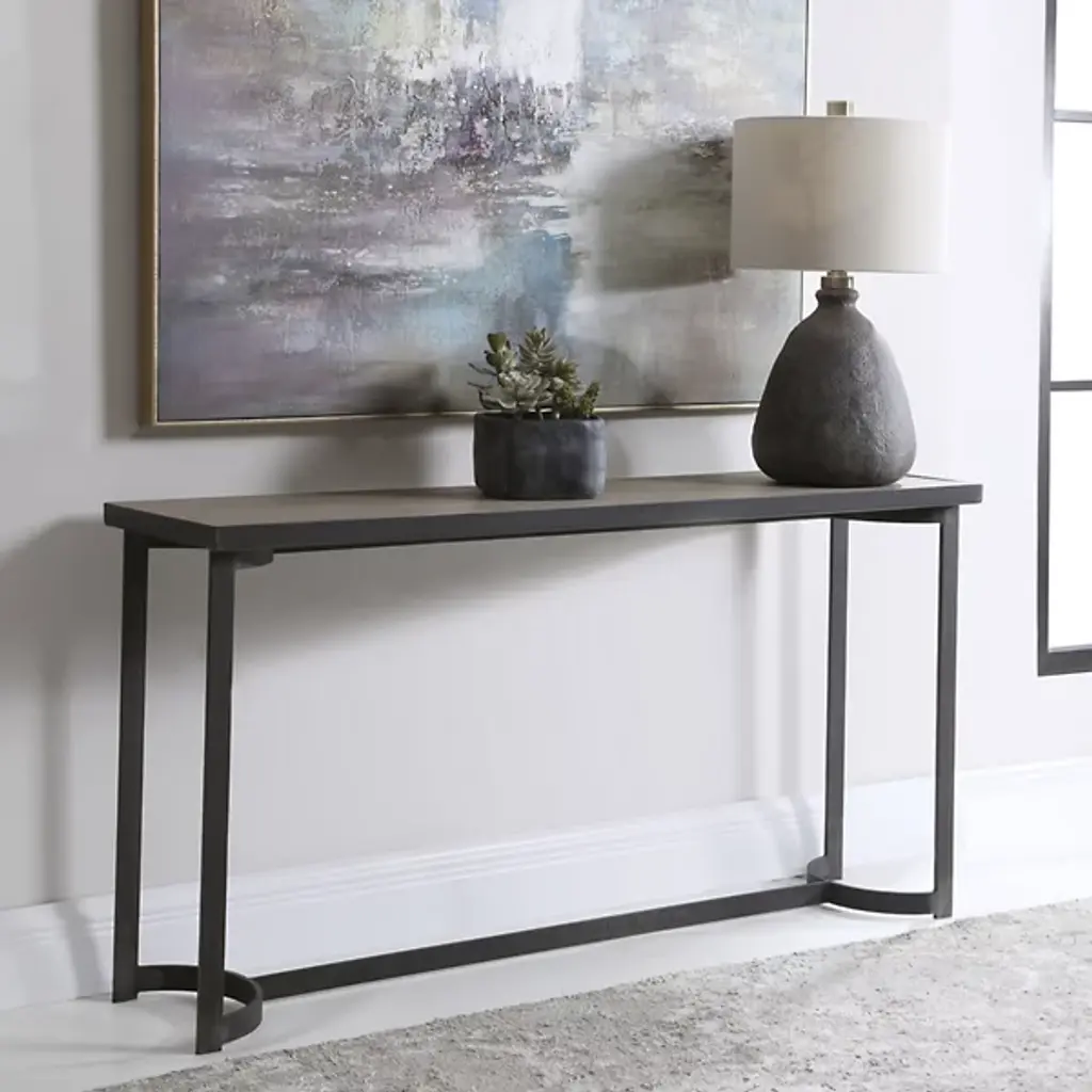 The Basuto Console Table from Uttermost masterfully blends contemporary aesthetics with a touch of rustic modern charm. Designed by Jim Parsons, this console table embraces a modern lodge style; its clean lines highlight a natural oak veneer top finished in a light gray hue. The contrast comes to life with a gracefully curved, hand-forged iron base in aged steel, adorned with natural burnishing, blending styles to engage the eye and add storage and display options to inside spaces.