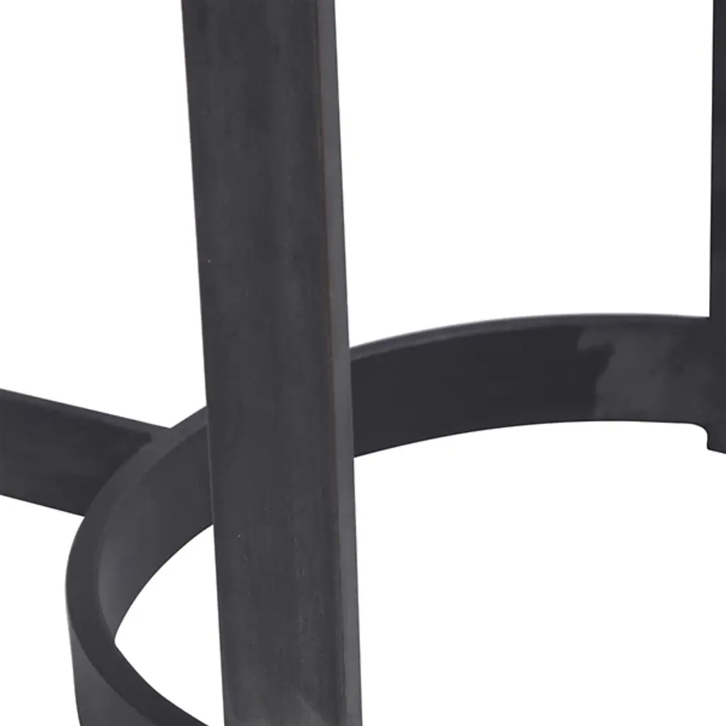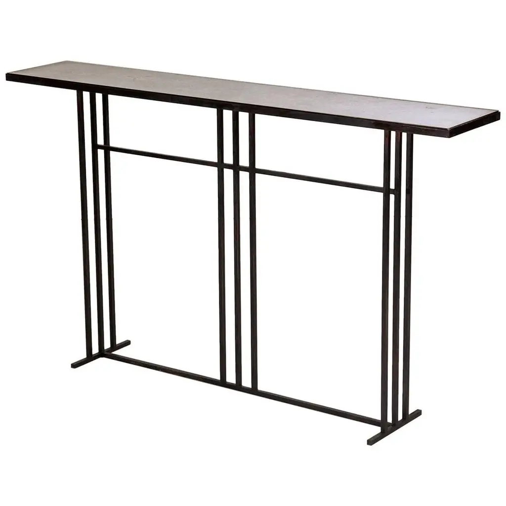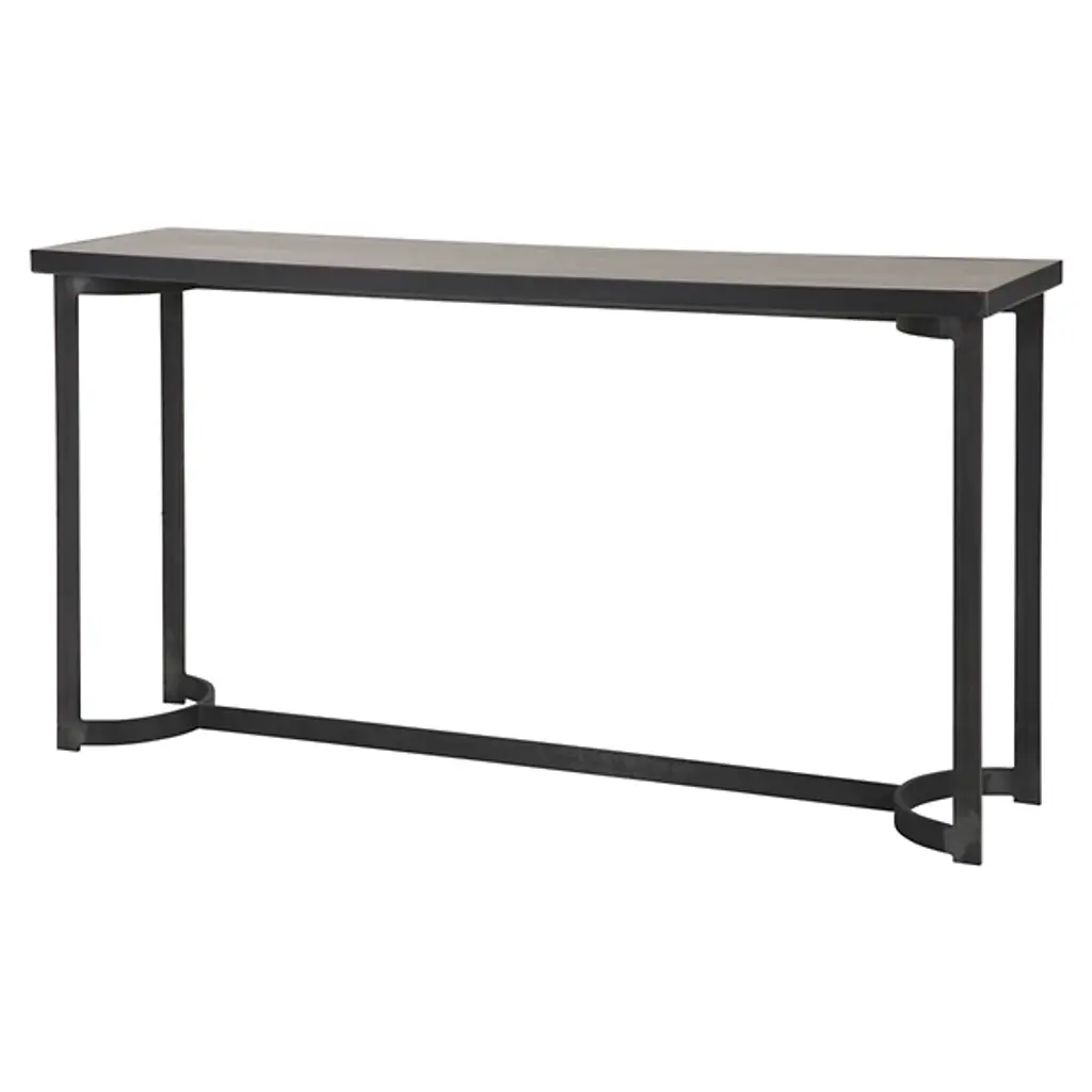 The Basuto Console Table from Uttermost masterfully blends contemporary aesthetics with a touch of rustic modern charm. Designed by Jim Parsons, this console table embraces a modern lodge style; its clean lines highlight a natural oak veneer top finished in a light gray hue. The contrast comes to life with a gracefully curved, hand-forged iron base in aged steel, adorned with natural burnishing, blending styles to engage the eye and add storage and display options to inside spaces.