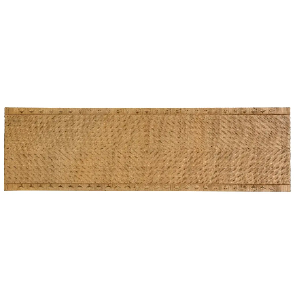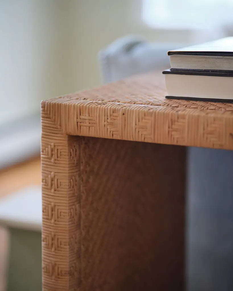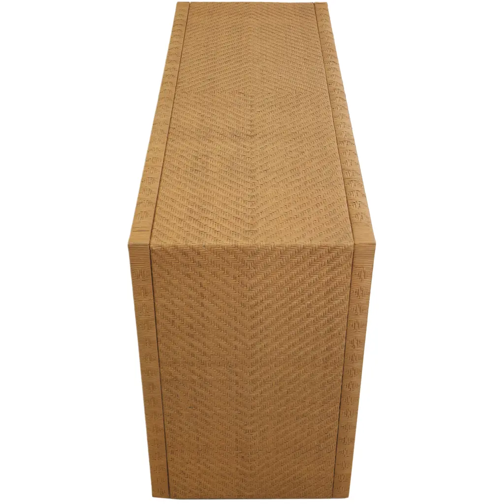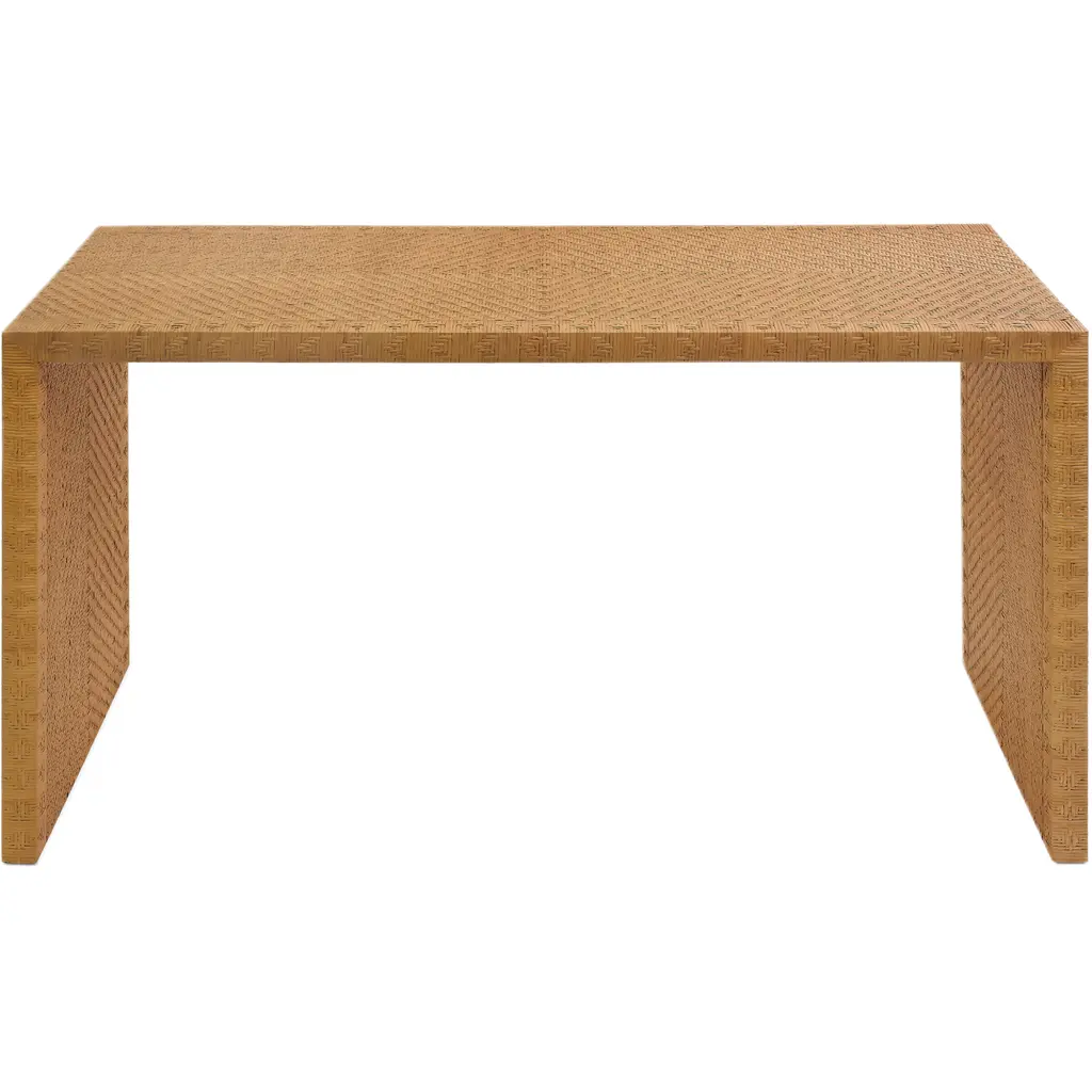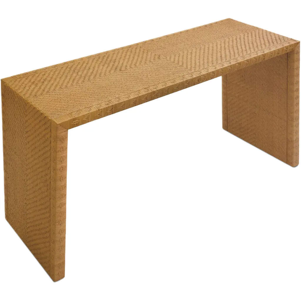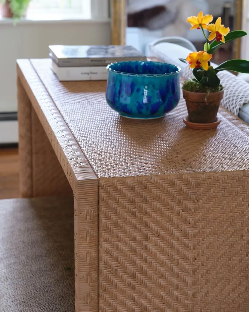 A classic waterfall-shaped console, a favorite for its simplicity, is given extra visual interest with a beautifully wrapped frame, with fields of large diamonds framed by smaller bands of diamond blocks at the frame corners. Perfect with extra stools tucked underneath for seating in a living room (or a dog-bed in a hallway).