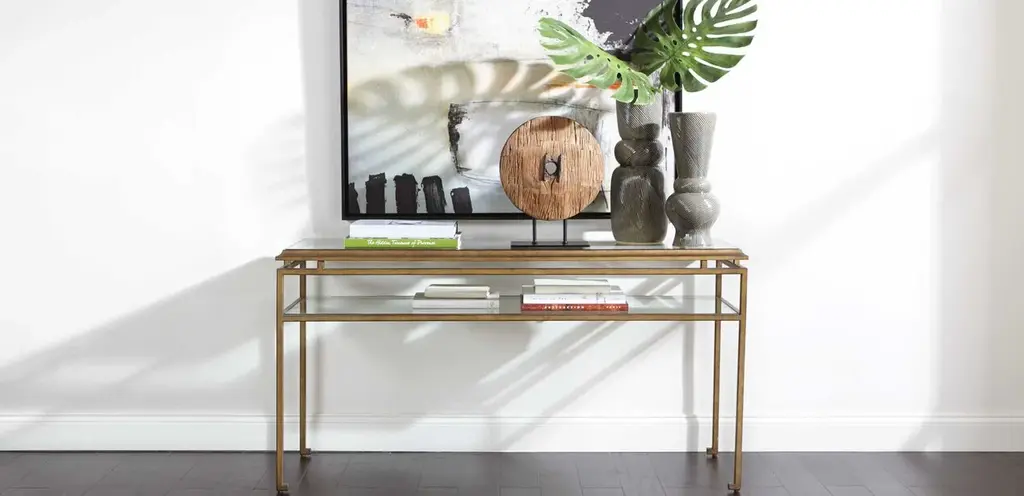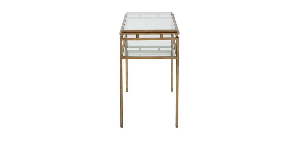 With its Chow-style feet, careful fretwork, and a gently curved top inspired by ancient pagodas, the Beacon console table's vintage, well-traveled look suggests a hint of Asia-Pacific influence. The frame's burnished, hand-applied finish contrasts beautifully with the glass top, which emphasizes your room's natural light. Nestle it against your sofa back or use it in an entryway to display the treasures you've collected in your travels.