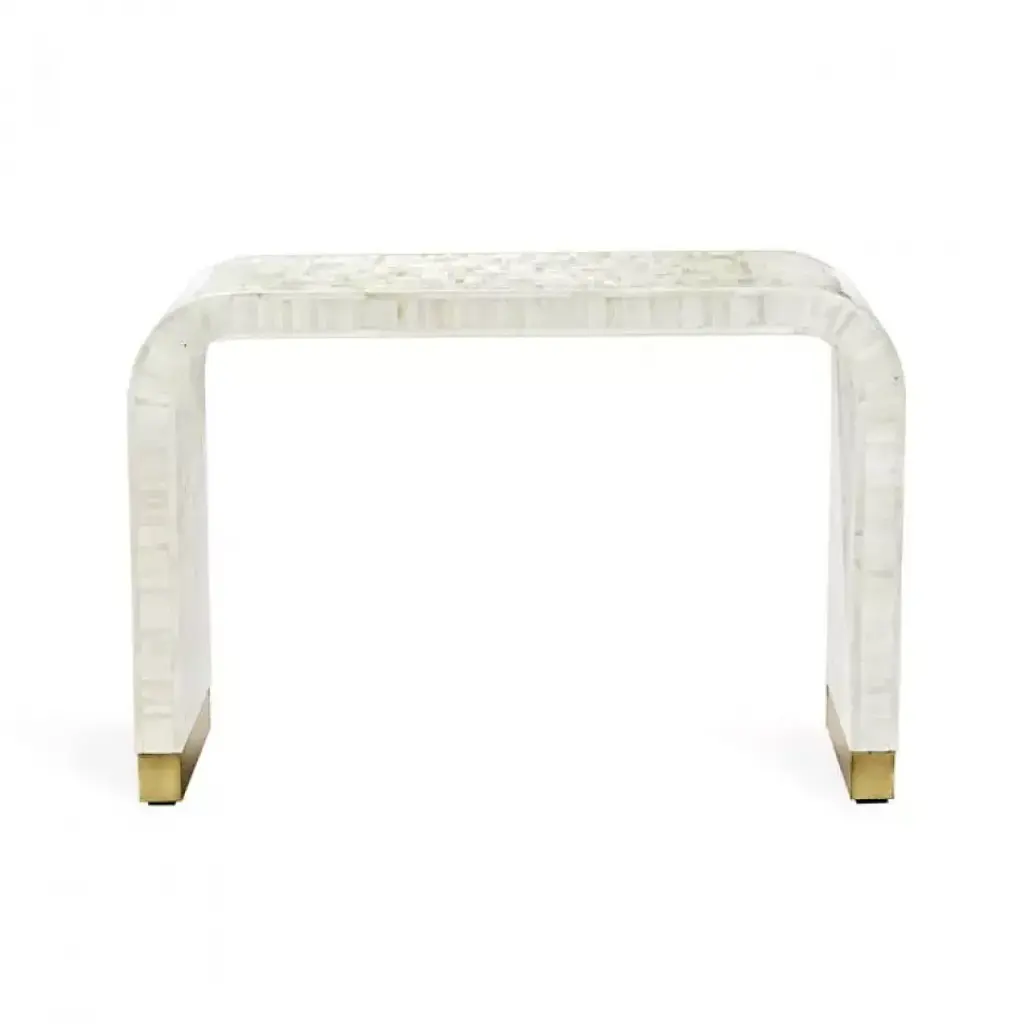 Boasting a sublime pattern of natural cream bone, the Beacon Console Table is the definition of fabulous. Bone is a natural material. Variations in coloration are to be expected and add to the uniqueness and charm of each piece.