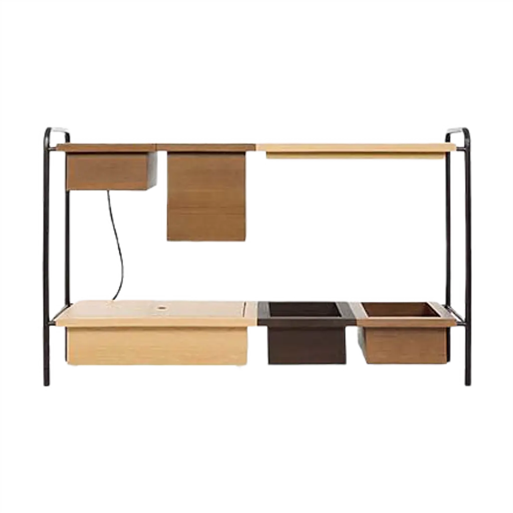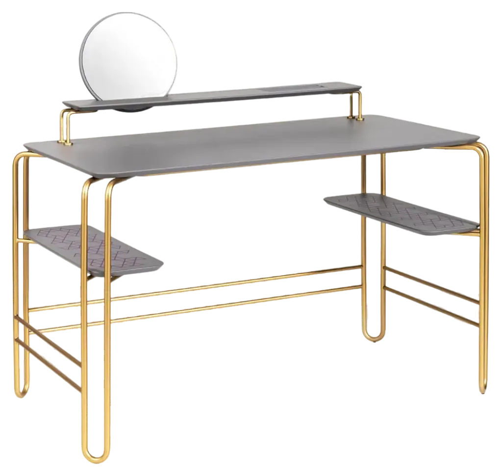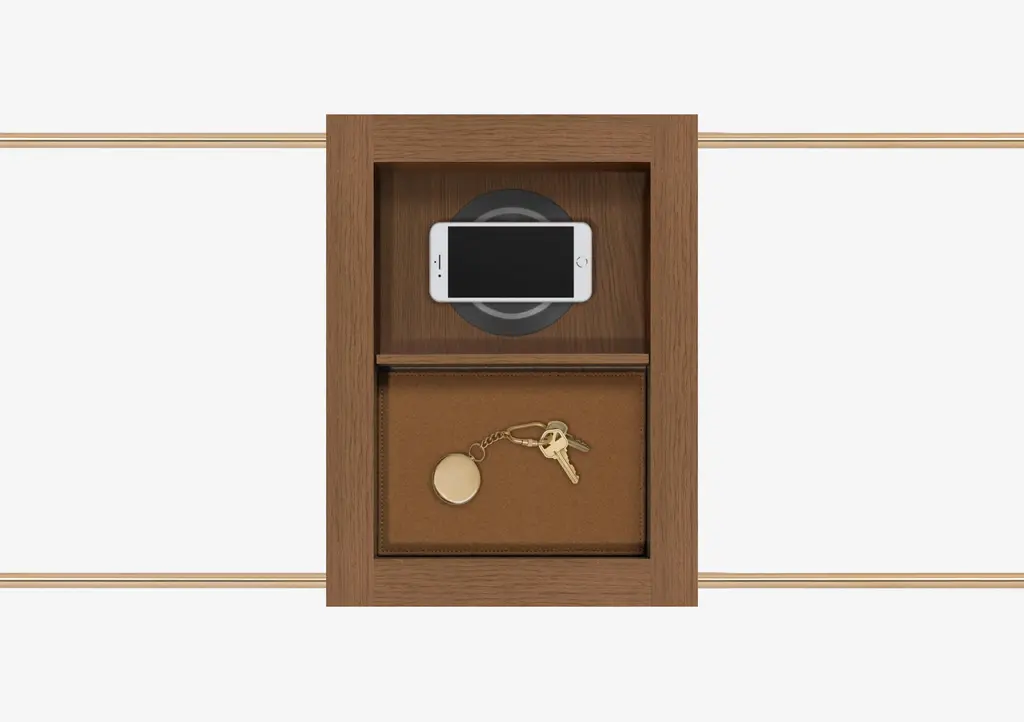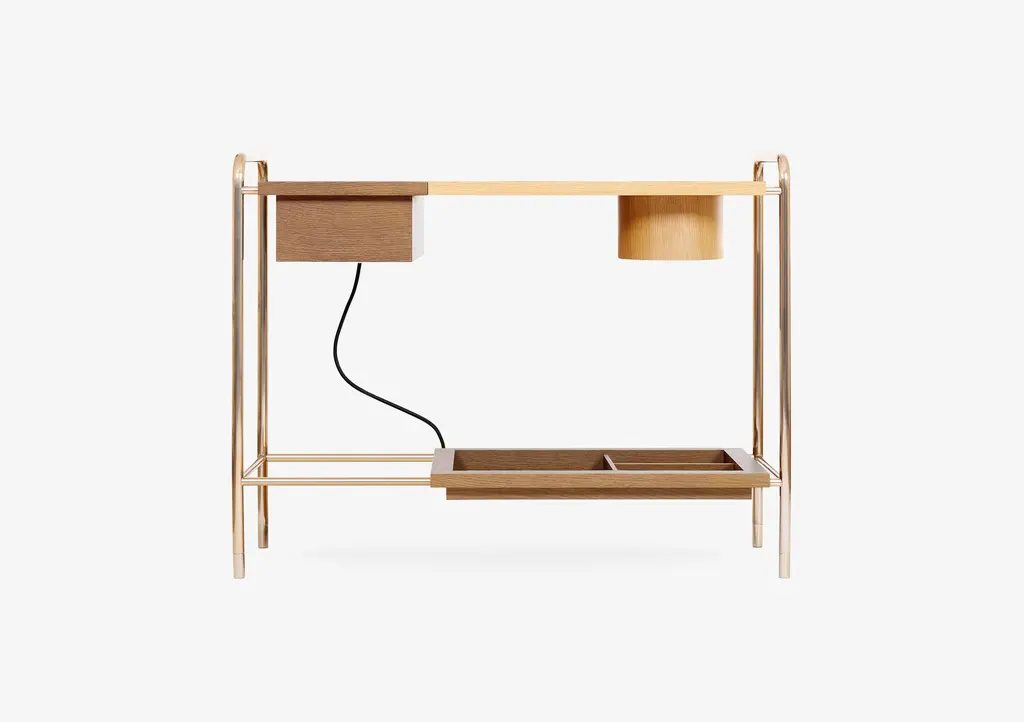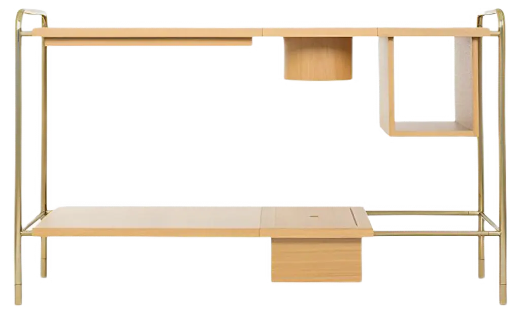 Console table composed of 1 polished stainless steel structure with fixed feet and 3 tops in solid oak wood and MDF veneered with natural oak leaf. The Living tops have a recess that allows a simple fit into the Living structure and you can easily change the order of placement. This set includes: 1 Console structure with fixed feet - Polished stainless steel - Gold 1 Charging box - Oak - Brown - Wireless Charger (15 watts) with Schuko, UK or US socket/plug 1 Large pot - Oak - Natural - Includes 1 round vase 1 Large divided tray - Oak - Brown 1 Top pad - Burel - Brown