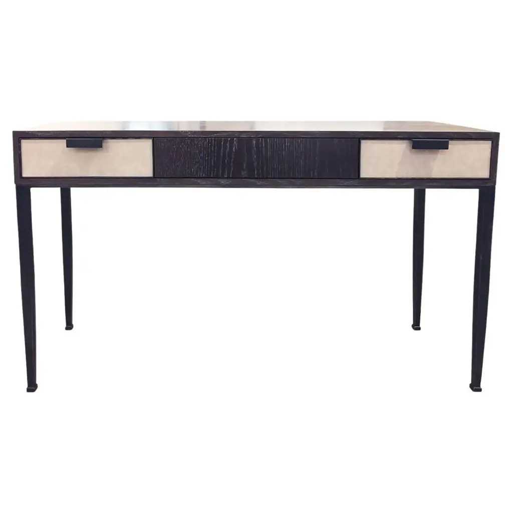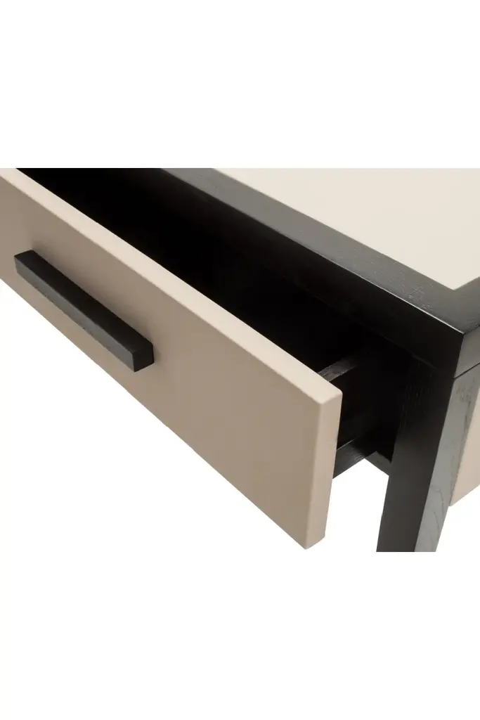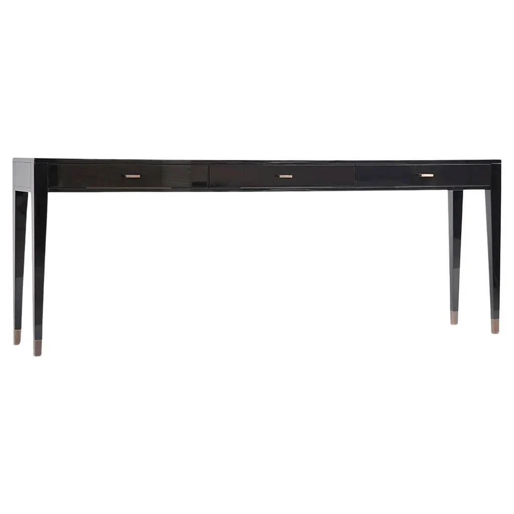 Beautiful craftsmanship and a Mid-Century modern influenced design have been brought up to date to create this refined yet practical and versatile console table. The elegant faux leather top in a sophisticated neutral, accented with Wenge handles and stylishly tapered legs.