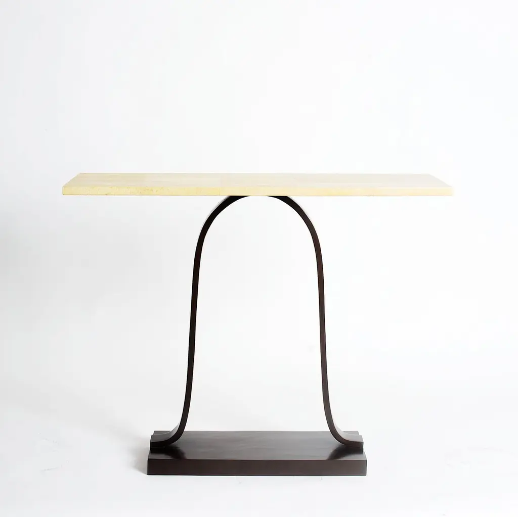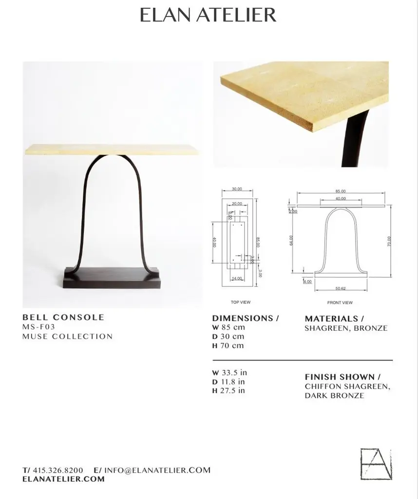 Bell Console in Cast Bronze and Shagreen by Elan AtelierThe bell console is an elegant form inspired by the art of Jean-Michel Frank. Cast in bronze using the lost wax method with a shagreen top. Custom sizes and finishes are available.Dimensions/w 33.5 x d 11.8 x h 27.5 inw 85 x d 30 x h 70 cm