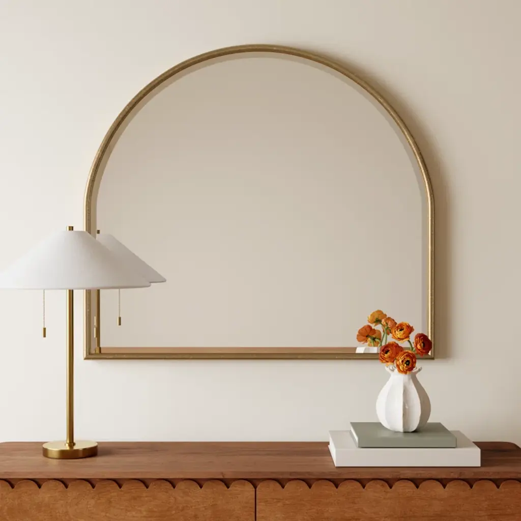Reflect the beauty of your home in this arched metal mirror! This versatile accent piece makes a traditional statement in any space whether you choose to hang it over the fireplace in your living room or above a console table in your entryway. We love that it's sturdy and sizable. Plus, it's available in three classic finishes to suit your style. Metal D rings are included (which makes hanging it easy) so you can elevate your space in no time at all!