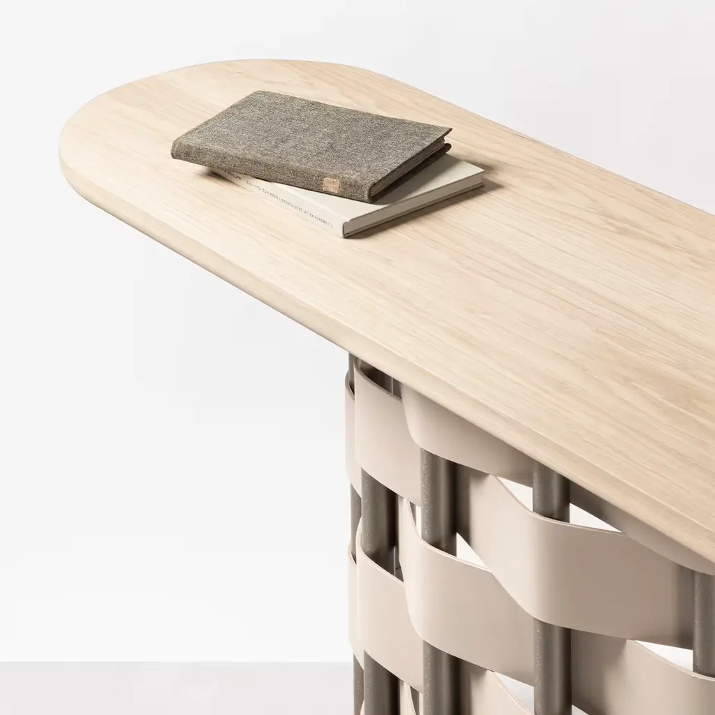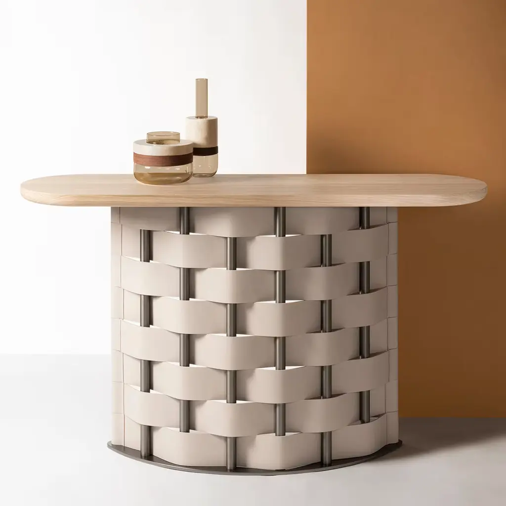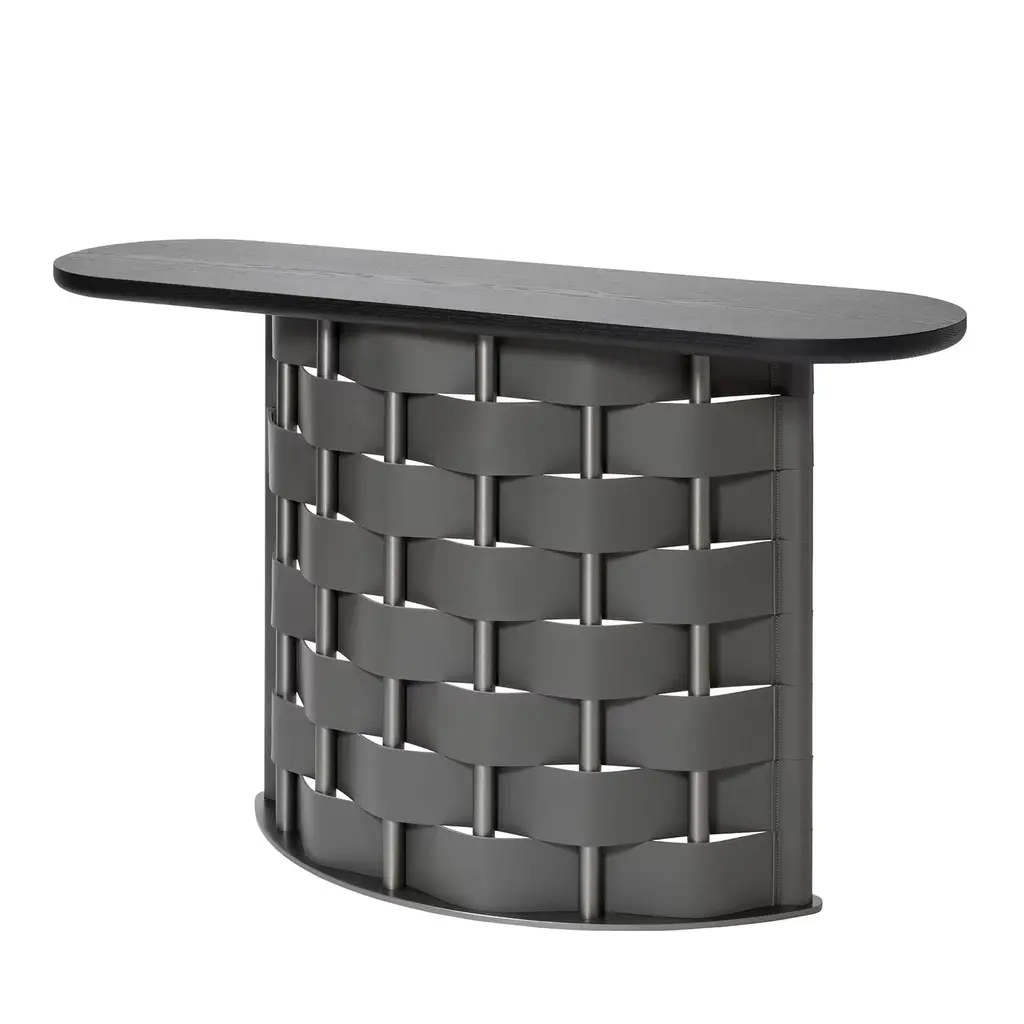 The epitome of clean elegance, this stupendous console by Simone Fanciullacci will make an alluring statement in a modern entryway. Resting on a burnished aluminum base composed of eight tubular supports enriched with braided natural saddle leather, it features a solid wood top also boasting a natural finish. Available in a wenge tone, and in other leather colors: white, light grey, mud, graphite, black, mocha, brown, cognac, natural, cream, yellow, mango, red, navy blue, and loden green.