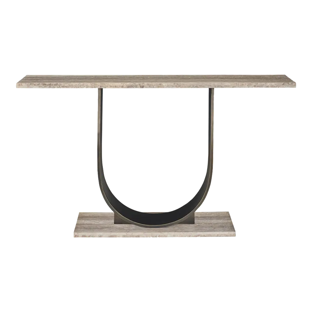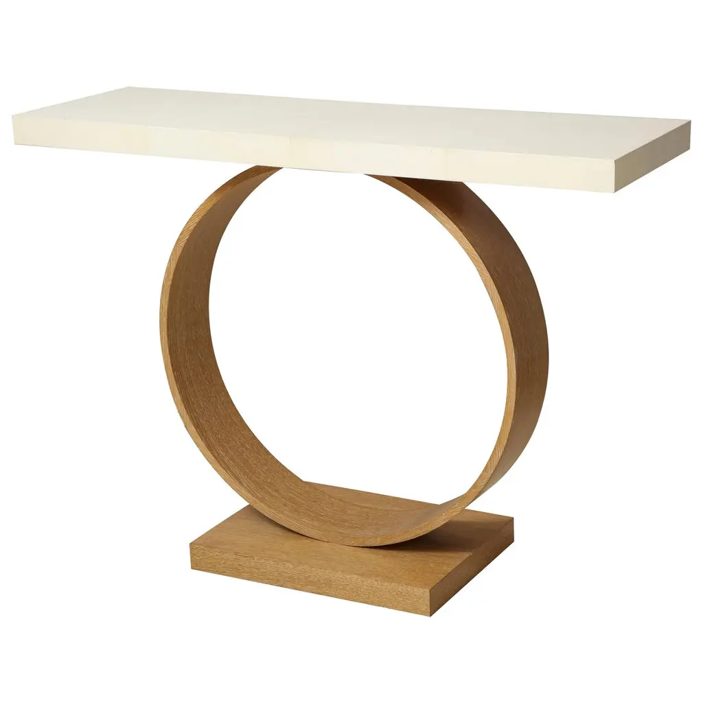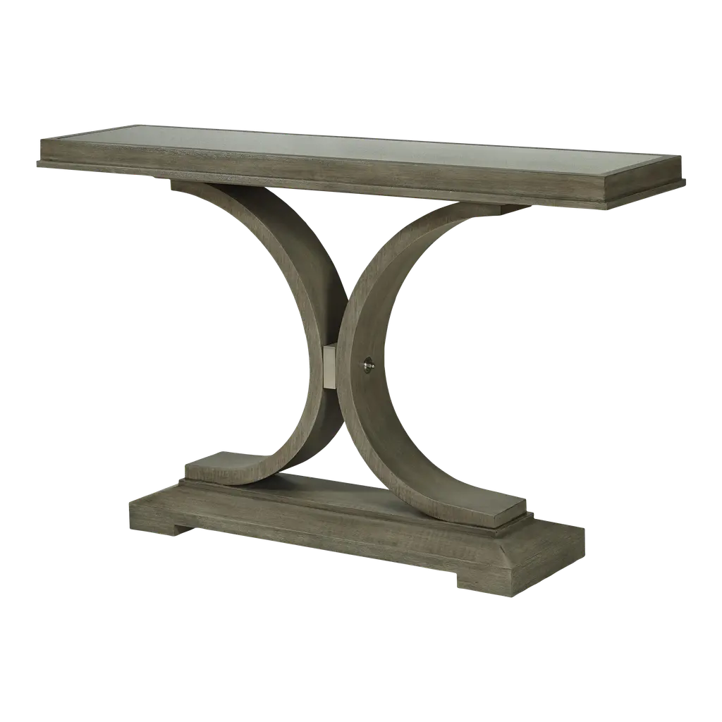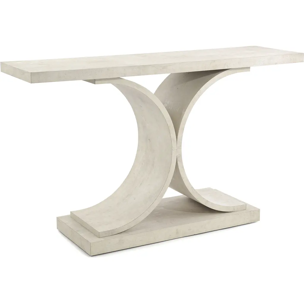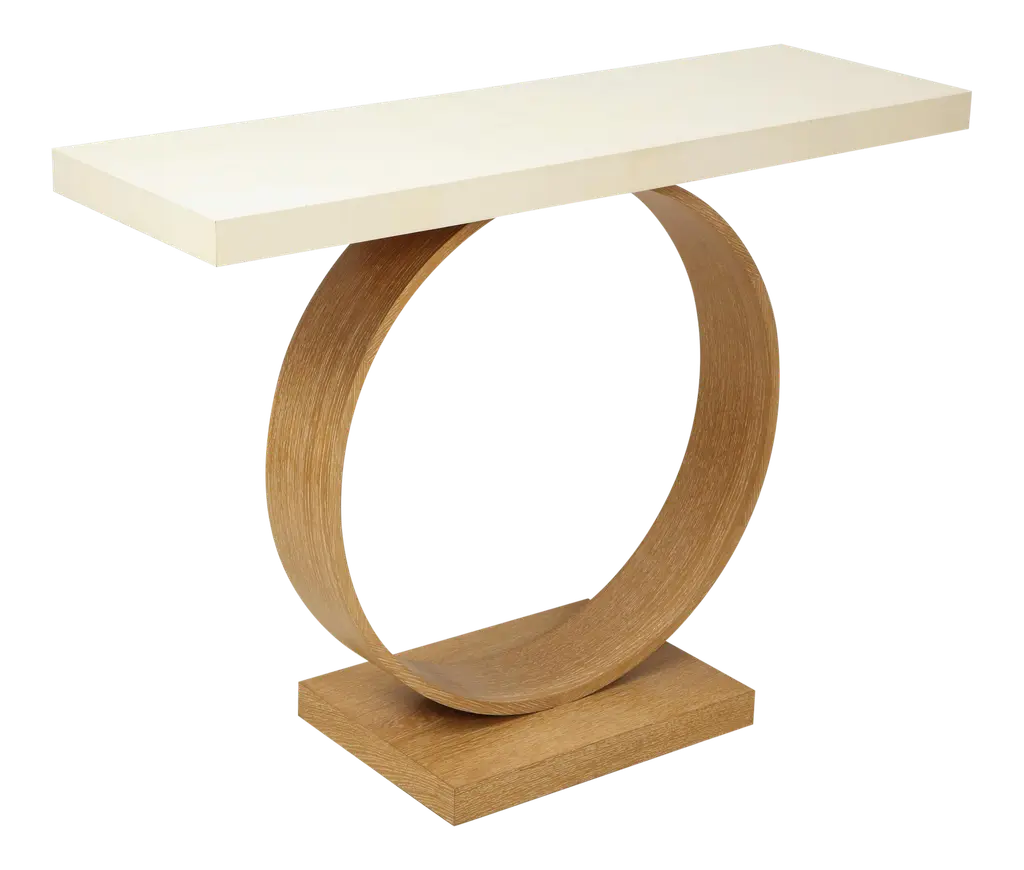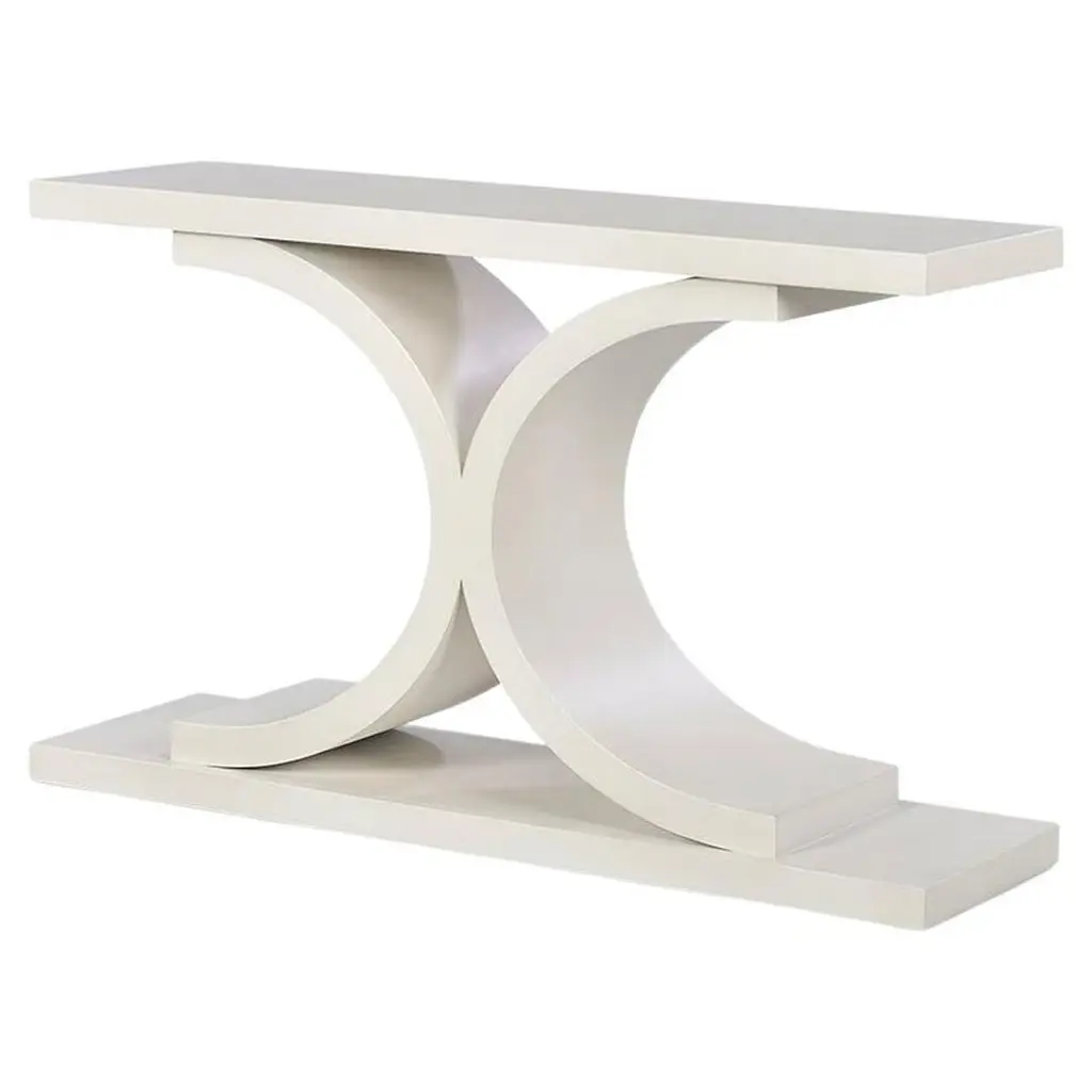 38"H X 64"W X 18.5"D Mounted on a simple slab base and supporting the top, back-to-back semicircles make up the pedestal of this imposing but elegant console table. The entire piece is finished in tiza gesso.