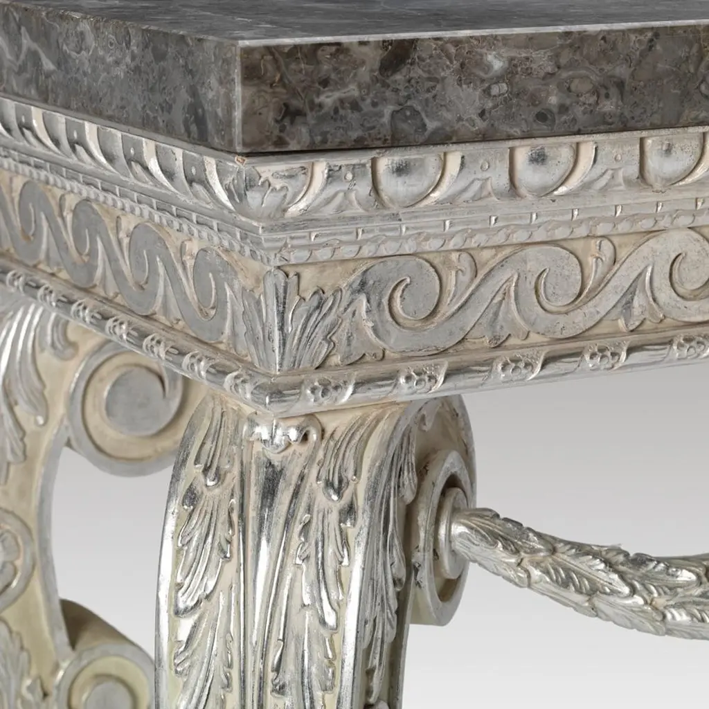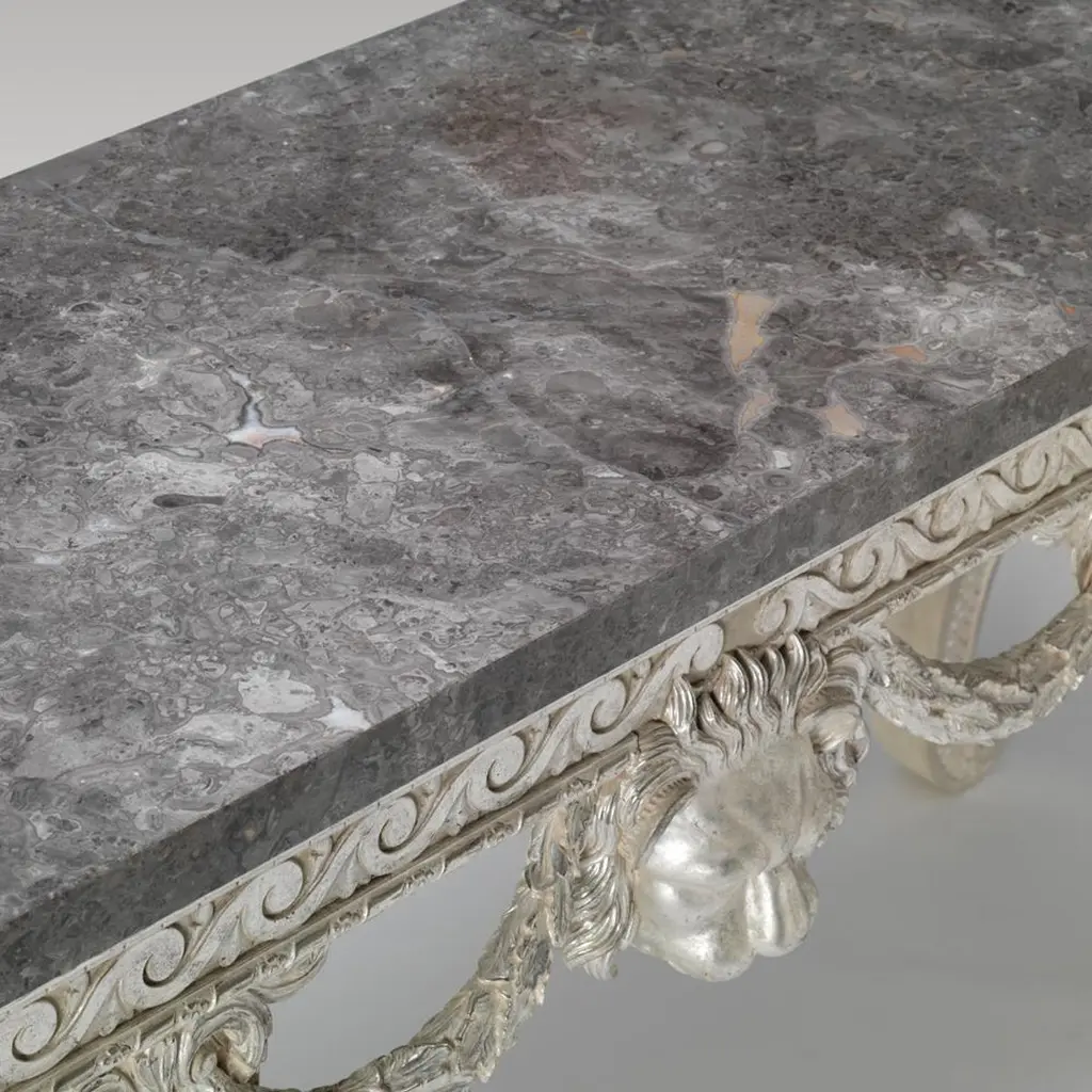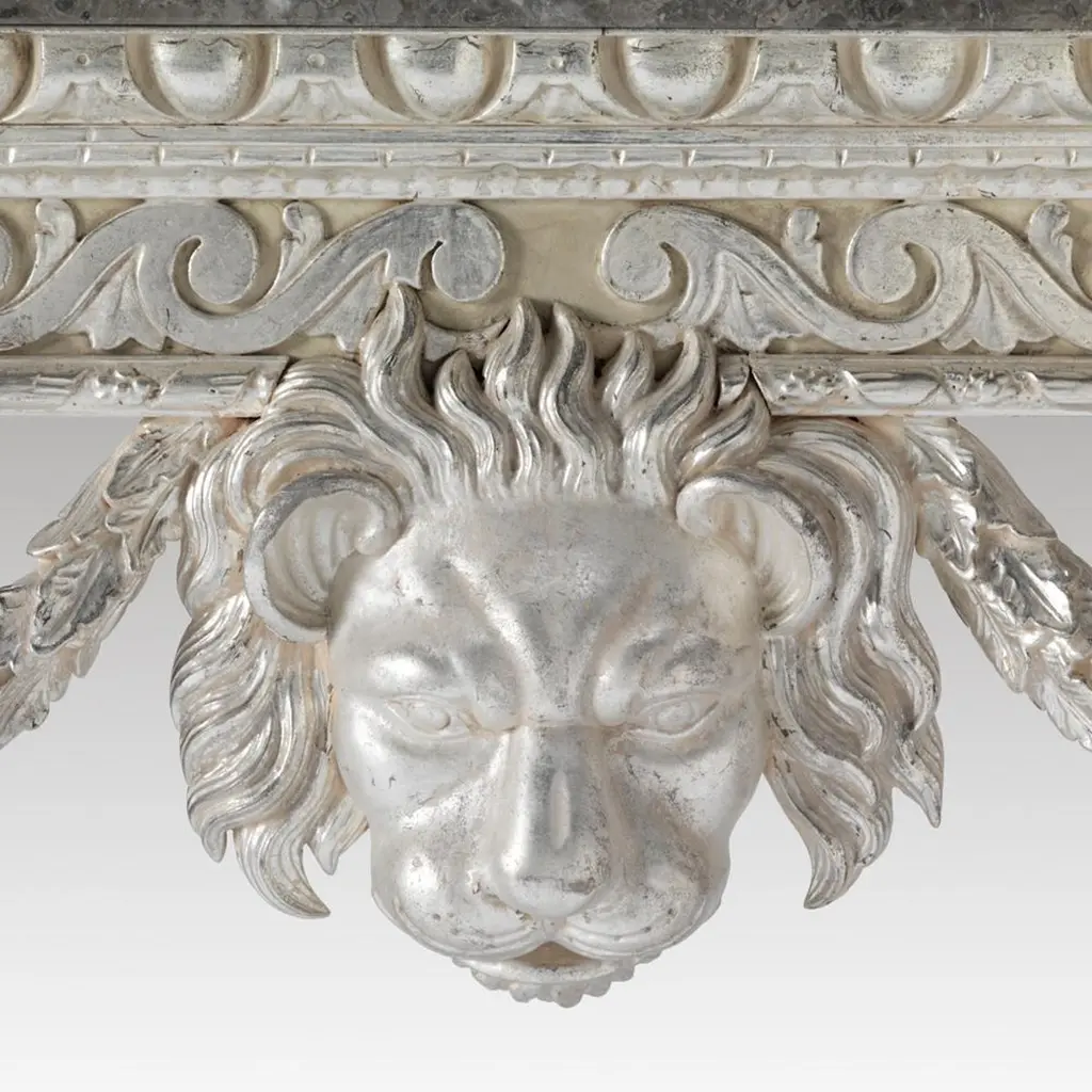 The simplicity of this Benjamin Goodison console is what sets it apart from most of Goodison’s work. The free-flowing design of the c-scroll legs with delicate foliate carving and fish scale recess is very typical of his work and, although not fussy in design, it still resonates an air of style and design. The legs support a simplistic Vitruvian scroll frieze with finely carved lion mask, central carving and foliate trailing carved swags.Bespoke sizing, design adaptations and finishing available.We are currently working to a 30-36 week lead time.