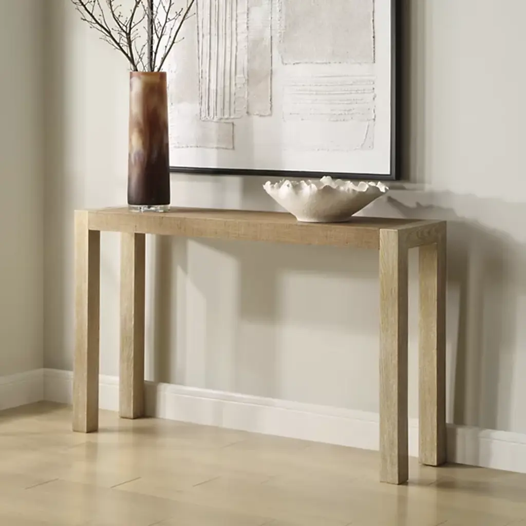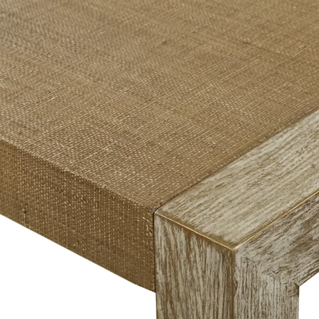The Bentley Console Table from Uttermost, created by Renee Wightman, incorporates natural grasscloth into its distinctive surface design. This unique material choice brings organic texture to the piece, complemented by oak veneer legs. A hint of metallic accents punctuates the design, while the natural fiber weaving adds dimensional interest to the tabletop. The Bentley Console Table’s sturdy construction combines pine and MDF for lasting stability.