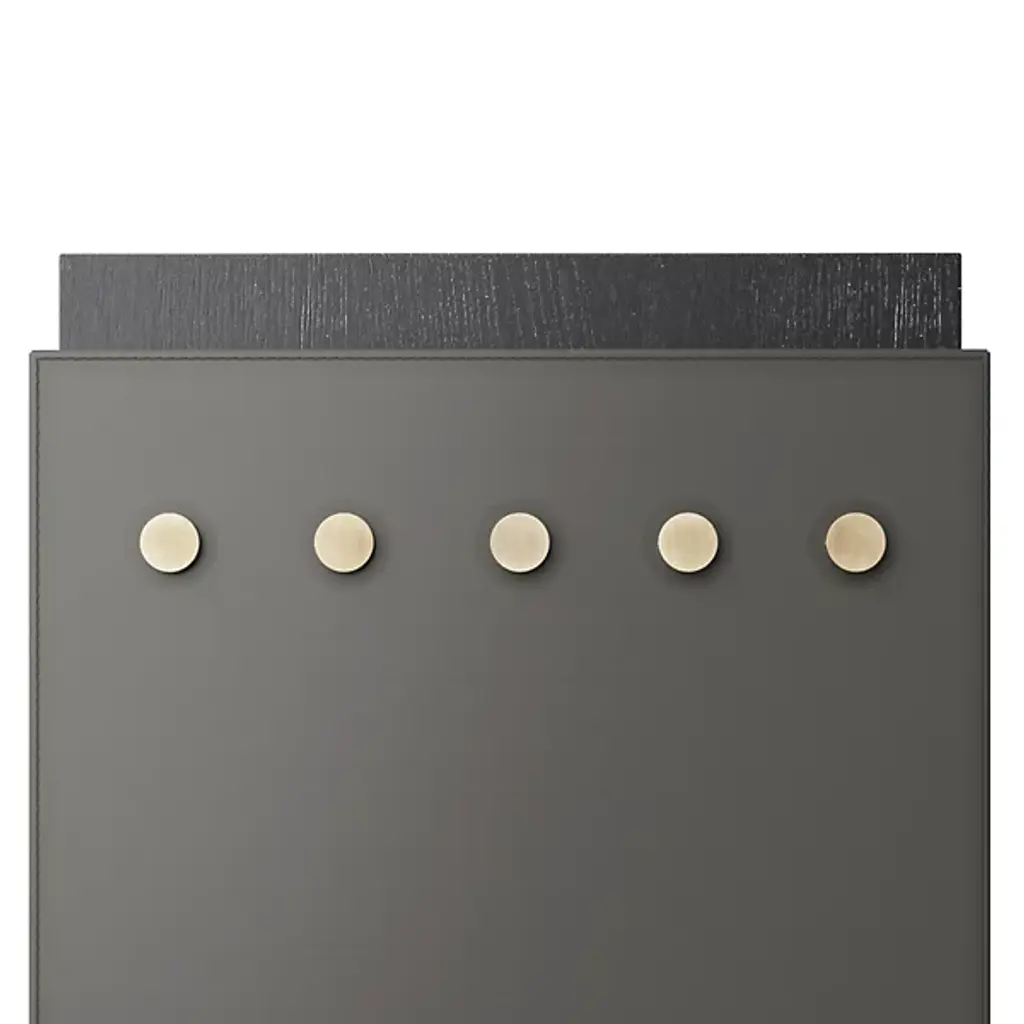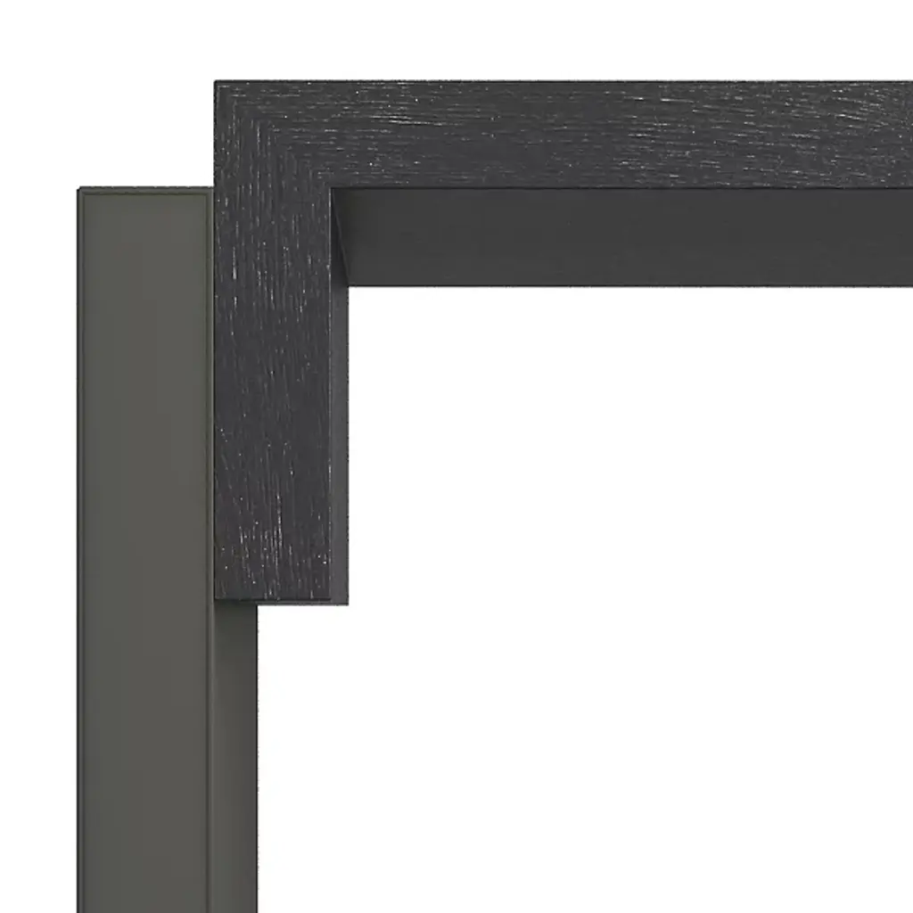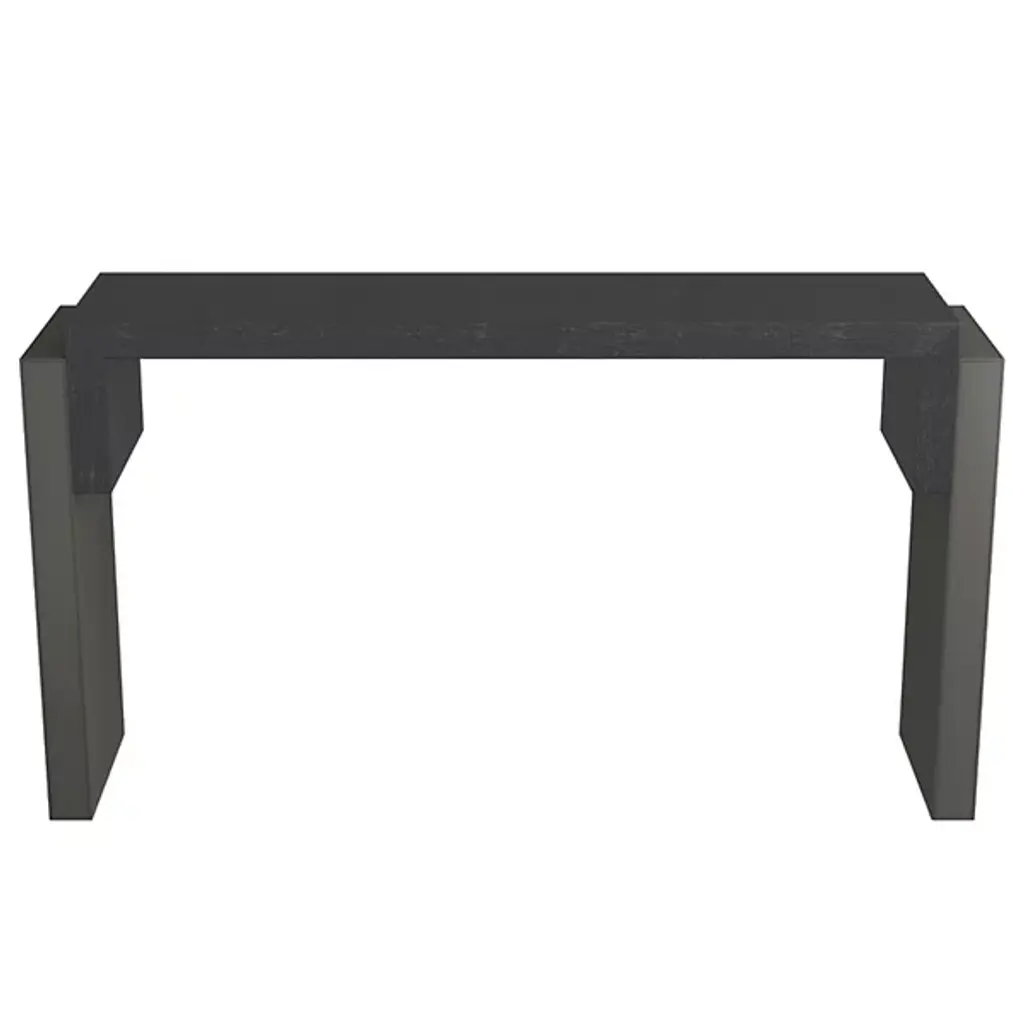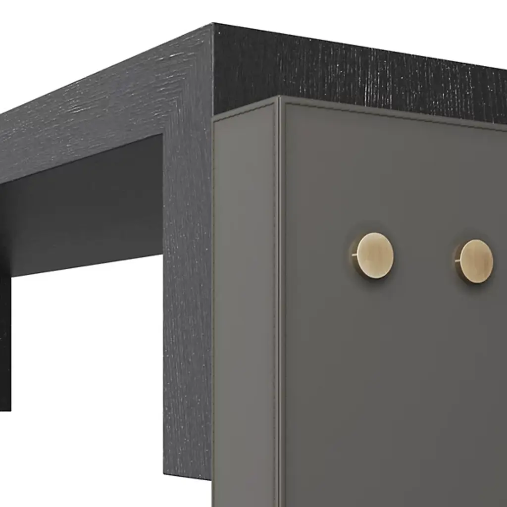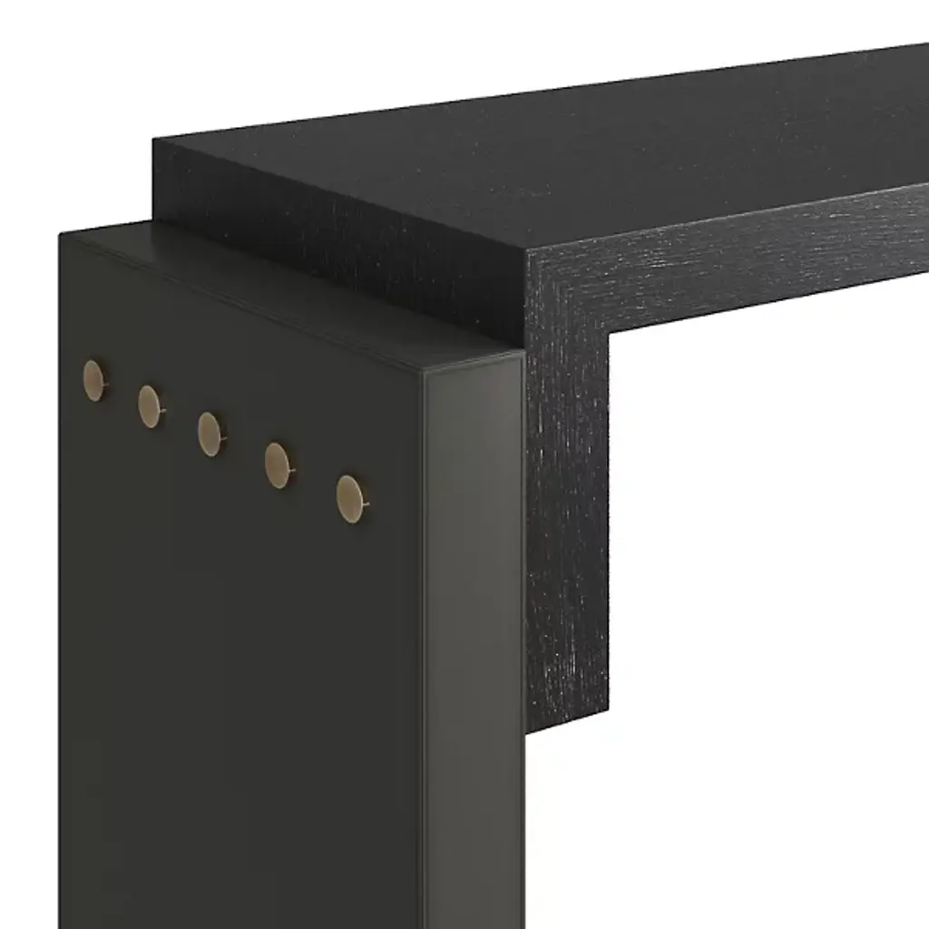 Modern sophistication forms in the use of contrasting materials with the Bernardo Console Table by Arteriors. Oversized brass buttons are evenly spaced along the leather and accentuate topstitched padded legs beneath staggered ebony oak tops. This design plays with notions of depth; the table juxtaposes sleek woodgrain with a bracket-shaped tabletop and supple wrapped upholstery for legs on either side. Together, leather and oak accent the table with luxurious elegance, celebrating the brilliance of mixed media through its contemporary appeal.