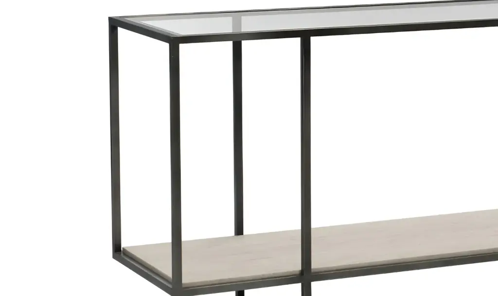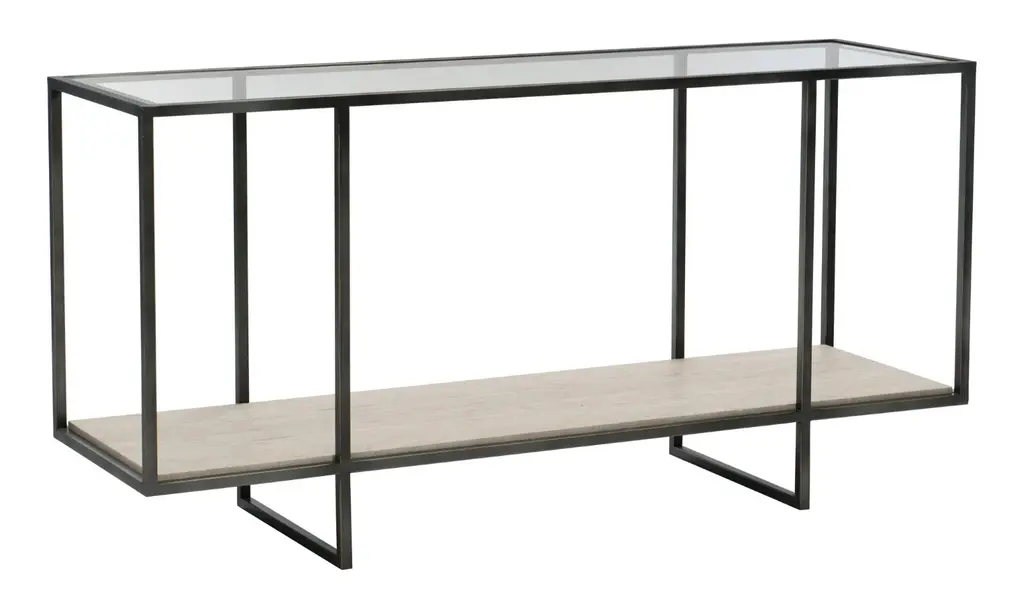 Investing in a console table is okay. But finding a table that makes a statement isn't easy. Take a look at the Harlow rectangle console table that grabs everyone's attention for an extra 3 seconds. Thanks to its unique design. The table features an inset tempered glass top with a beveled edge thatŐs so fancy, it might just make your other furniture jealous.Its tubular steel frame and stretchers in an oil-rubbed bronze finish are built like a tank but with the charm of a movie star. The white travertine stone shelf is so luxurious. You can place your books or any decor items on it. And the best part? The adjustable glides help keep your floors scratch-free and make it a breeze to slide your table to a new spot without dragging. Whether you are setting up this console table in the hallway, living room, or entryway, the Bernhardt Harlow Rectangle Console Table can easily fit right in and stand out.