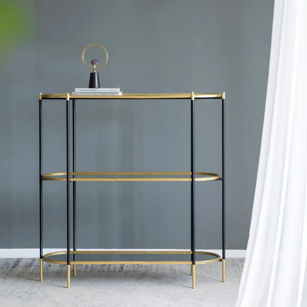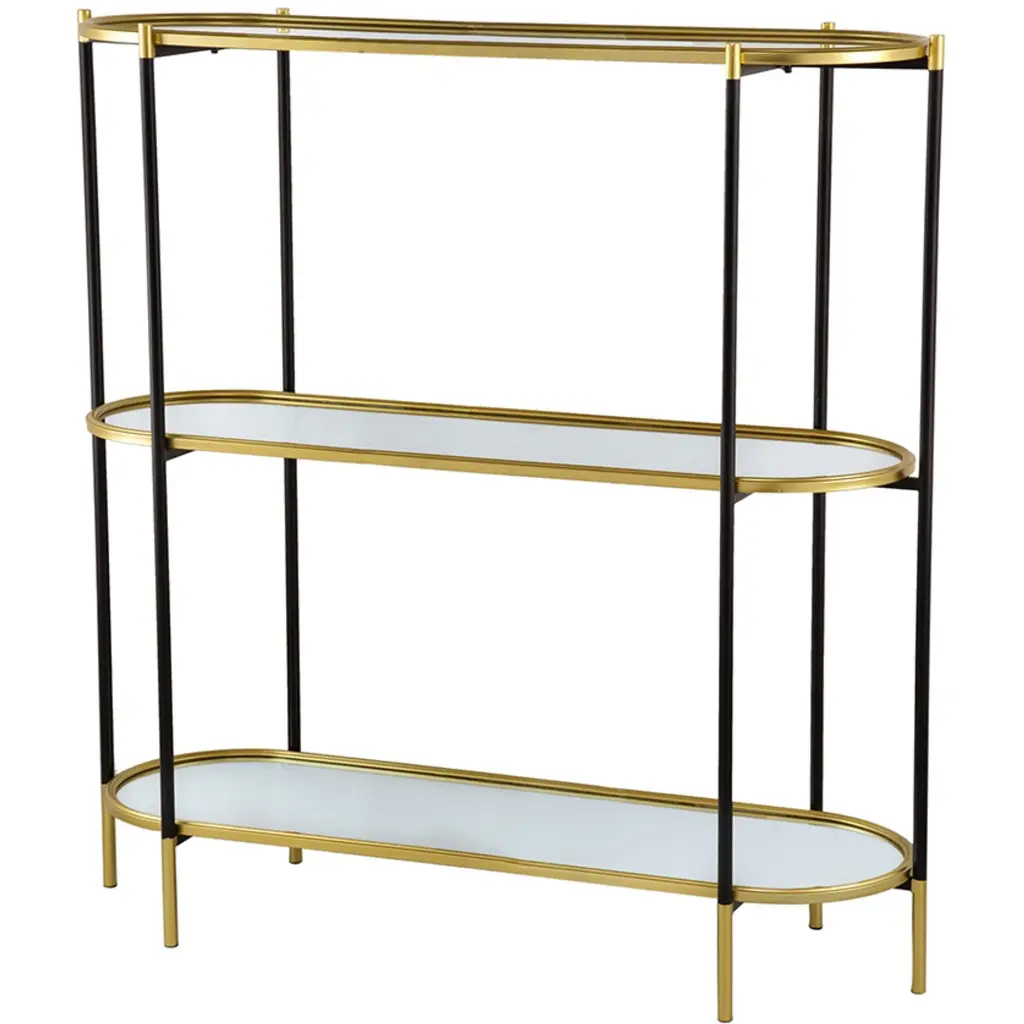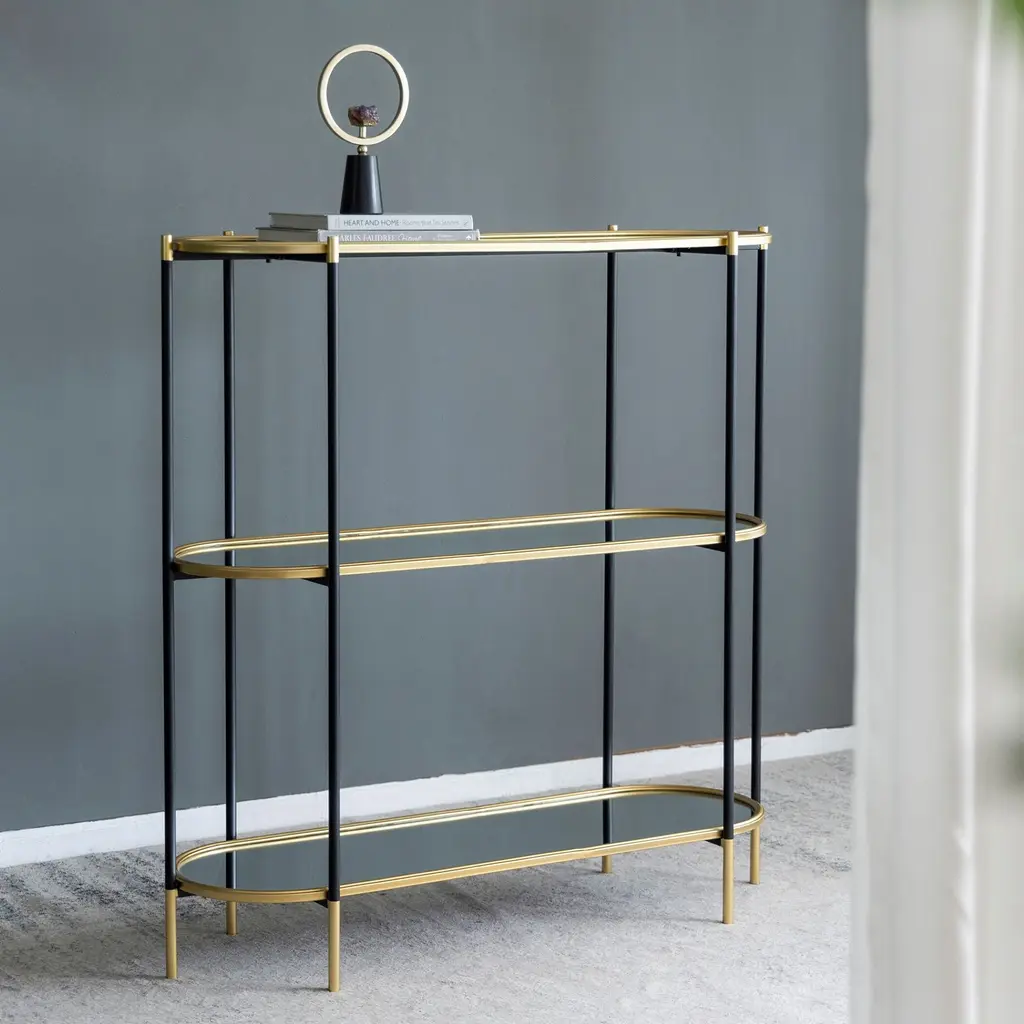 The Bertram 3-Tier Metal Console Table features open shelving at different levels, featuring a mirror base to store and display your most prized possessions. Finished in a gold rim and elegant black legs, this versatile table will add a splash of luxury to your home with a modern chic feel.