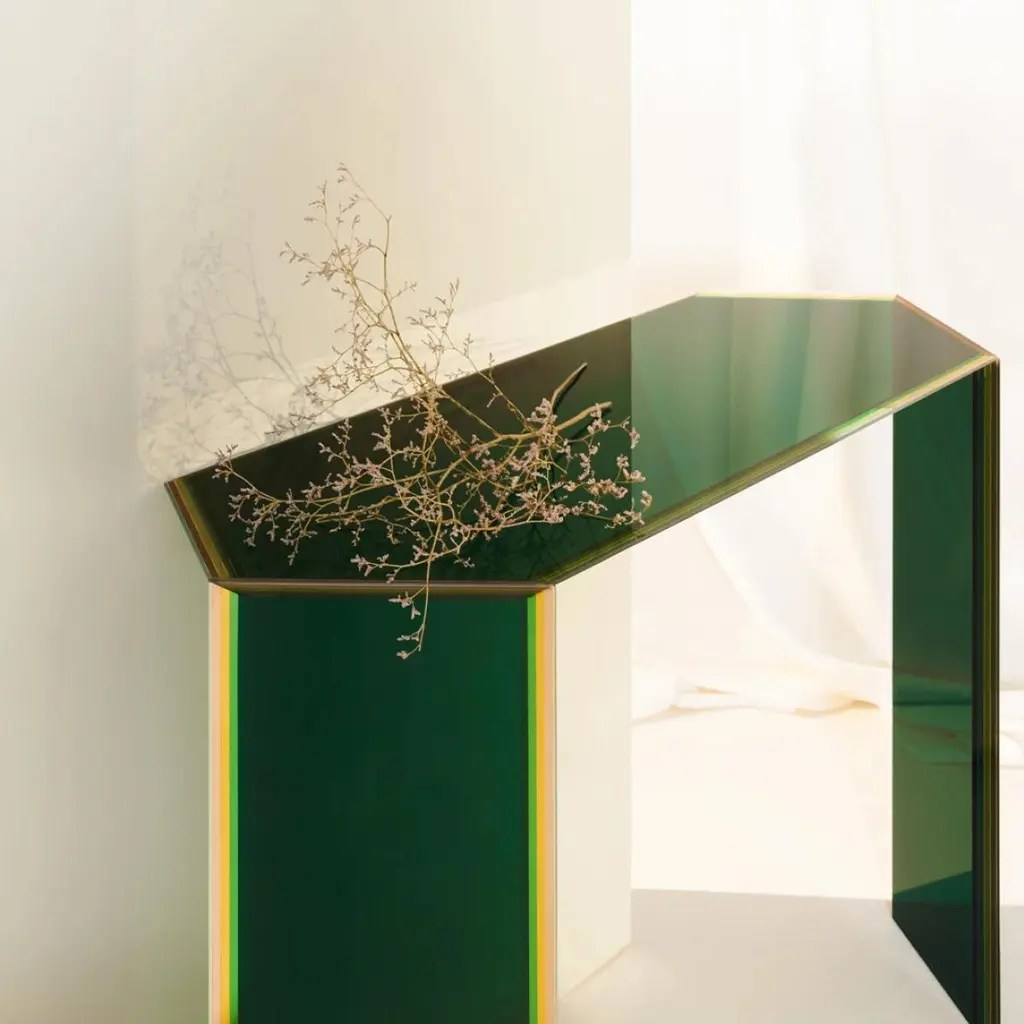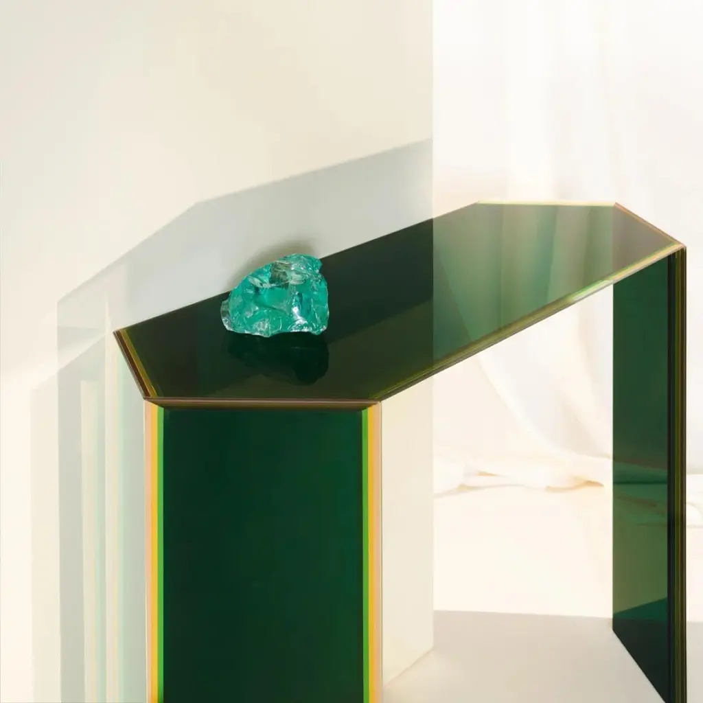 Collection of high tables, low tables and console, made in multi-layered and multichromatic glass, created by laminating five slabs of 5mm extra light glass each with a different colored film. The obtained glass sheets are in different shapes, shiny ground polished and “faceted” by means of unique bevels accentuating through the transparency of the glass the stunning multicolored material. The different components are then welded together in total clarity, by means of a special gluing technique, so creating very precious “furniture jewels”. Available in green or ochre finish.Additional information:- Dimensions: BIS03, W 119, D 42, H 80 cm- Finishes: Green or Ochre.Please note that the list price excludes VAT. An additional VAT charge may apply.