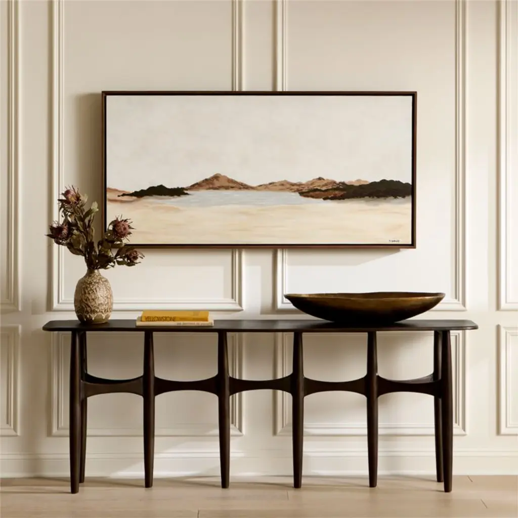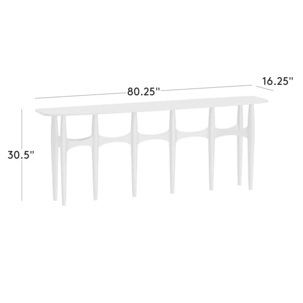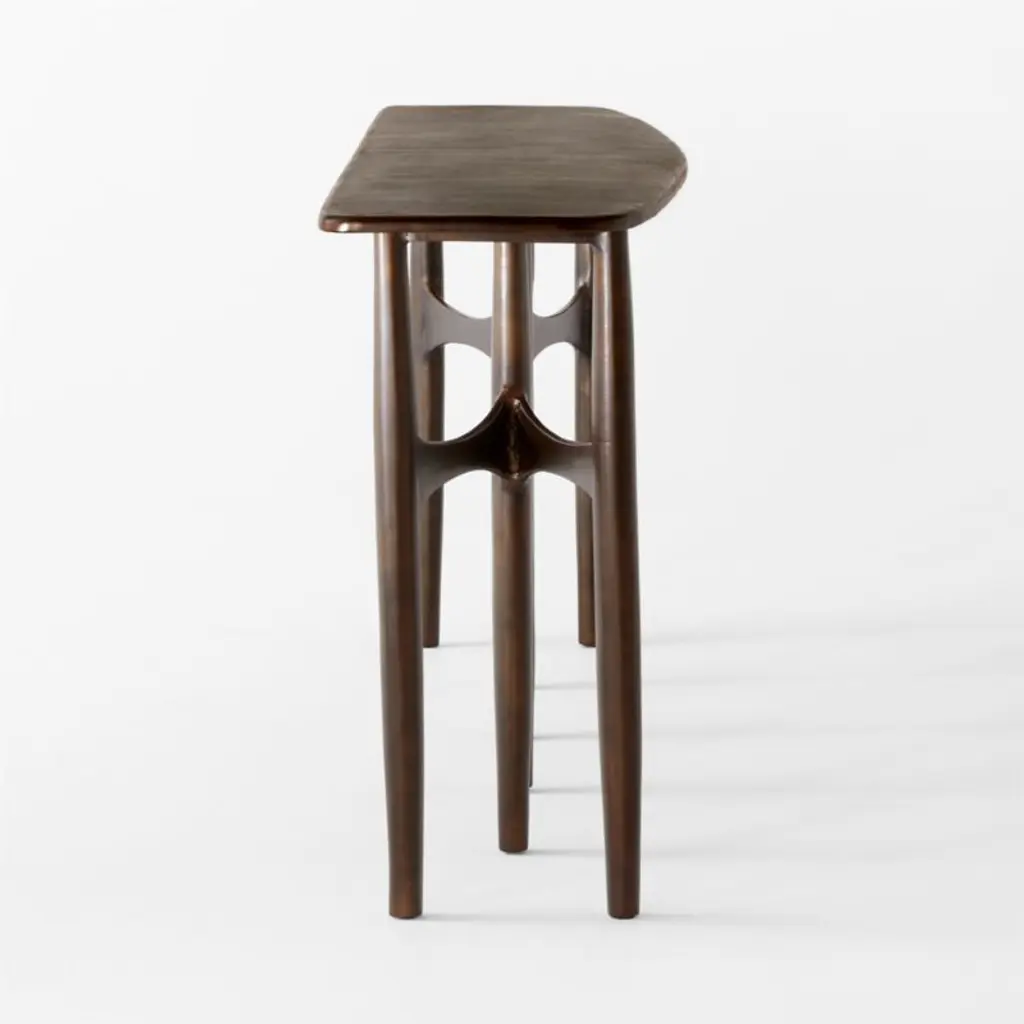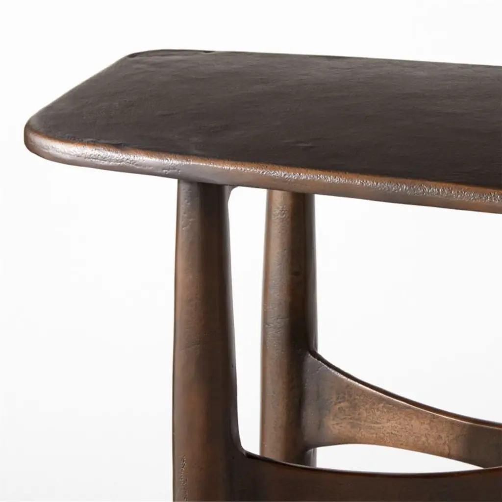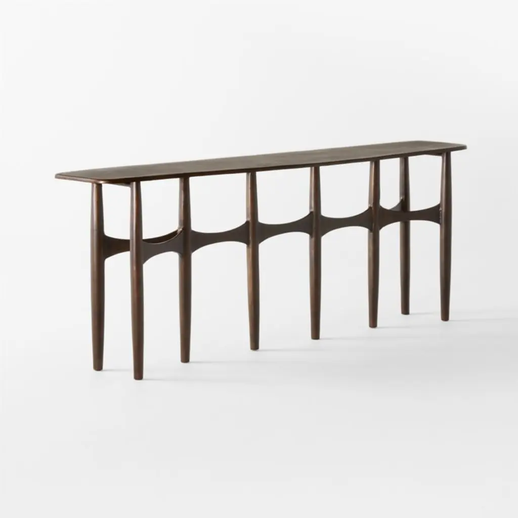 Long, leggy Brutalist-inspired console table designed by Amanda Ip of Slate Design makes a statement anywhere it stands in textured cast aluminum with dark bronze finish. Subtle demi-lune shape curves in front with a flat back to style against the wall. CB2 exclusive.