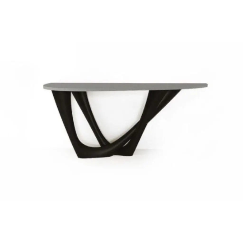 Black Brown G-console duo concrete top and steel base by ZietaDimensions: D 56 x W 168 x H 75 cm Material: Carbon steel, concrete.Also available in different colors and dimensions.G-Console is another bionic object in our collection. Created for smaller spaces, it gives another possibility in interior planning and at the same time preserves the unique shape of the original G-Table. Both objects were made for enthusiasts of bionic forms. Made with FiDU technology, it reminds of vines or tree roots. Nature symbolizes a constant changeability and harmony that comes out of it. A diverse structure refers to both natural forms and processes. G-Console comes in two versions – Mono and Duo.About Zieta: Zietas main goal is to deliver uniqueness and customization in design and construction while keeping the production, transport, and warehousing innovatively efficient.This is how they imagine the future world: Light, durable structures of customized applications produced on demand out of one-of-a-kind parts, yet efficiently.They use a computer-controlled production process. Customized pattern, customized form, customized function, one-of-a-kind product, and outstanding precision are what they deliver.You will find all of this philosophy reflected in the products. They research, they discover new possibilities, they play with forms and they deliver a beautiful, innovative, surprising outcome to people who love the design and who care about design development.They believe their work is a valuable contribution to the world of design not only by the unique beauty of the forms but most of all by opening ultra-innovative opportunities of forming and new paths for the world of the future.